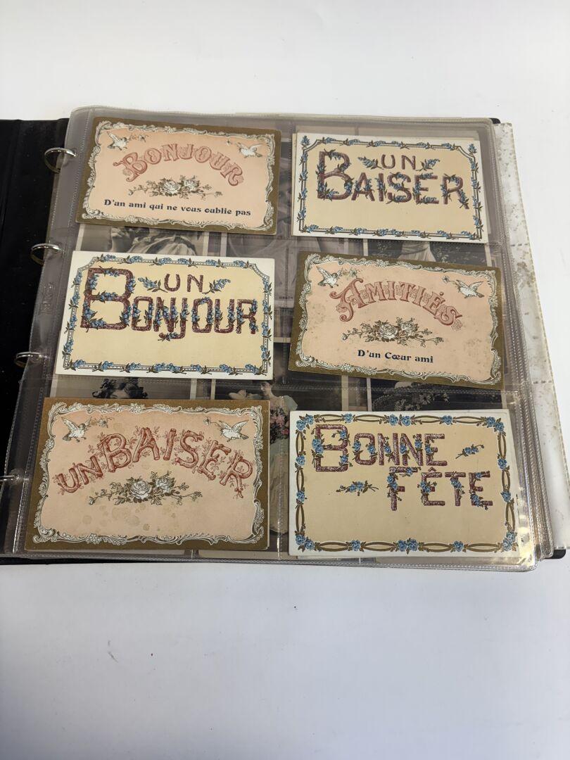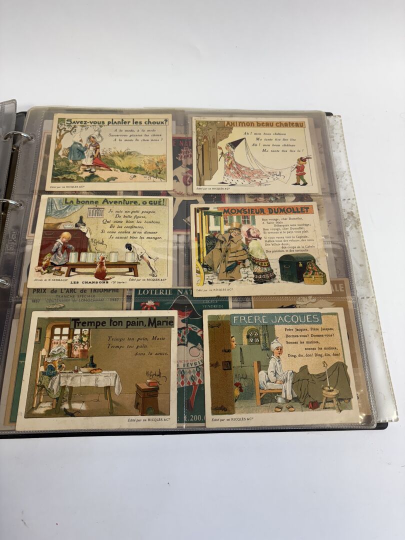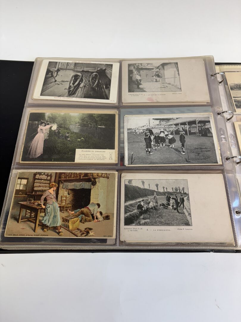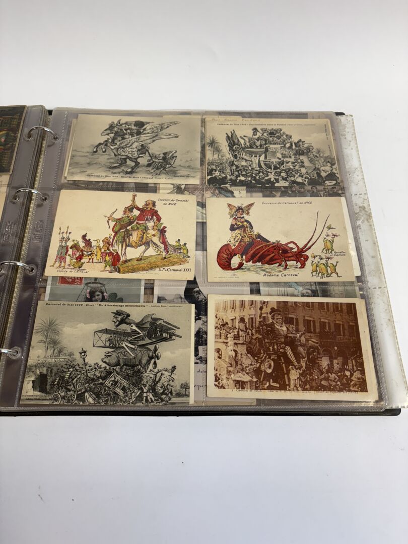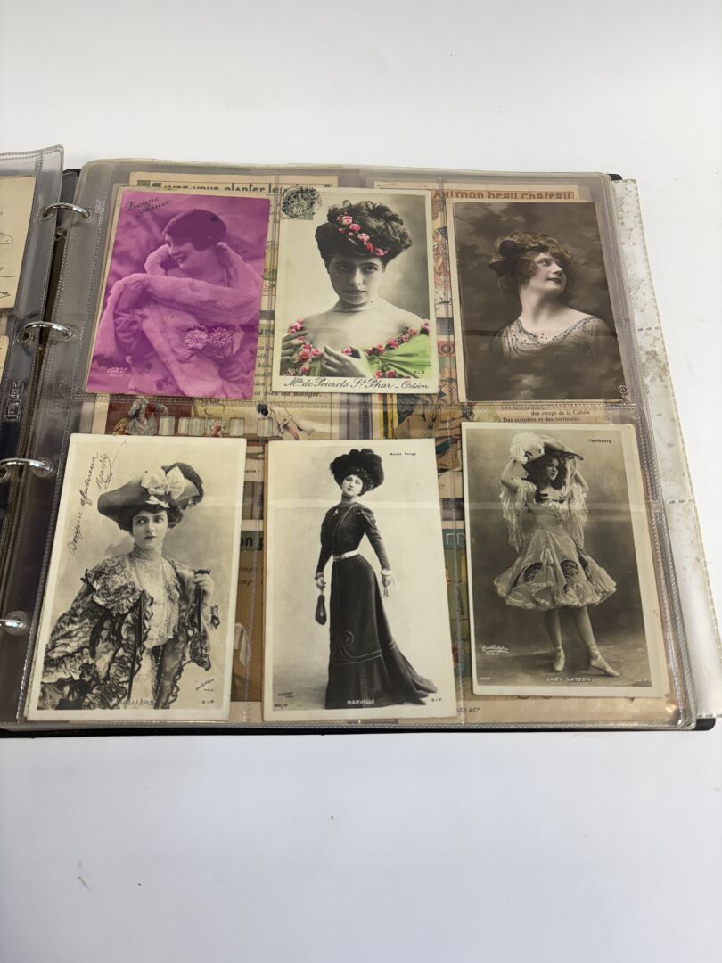 Album grenat de plus de 200 cartes postales anciennes contenant des cartes fantaisies, des cartes publicitaires, des cartes d'aventures et divers