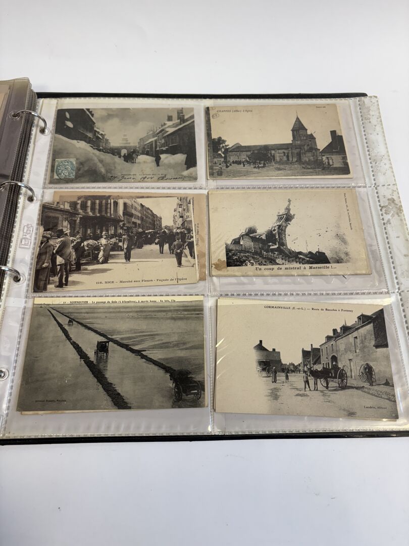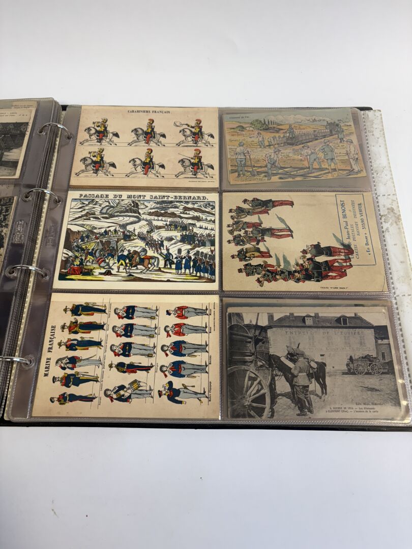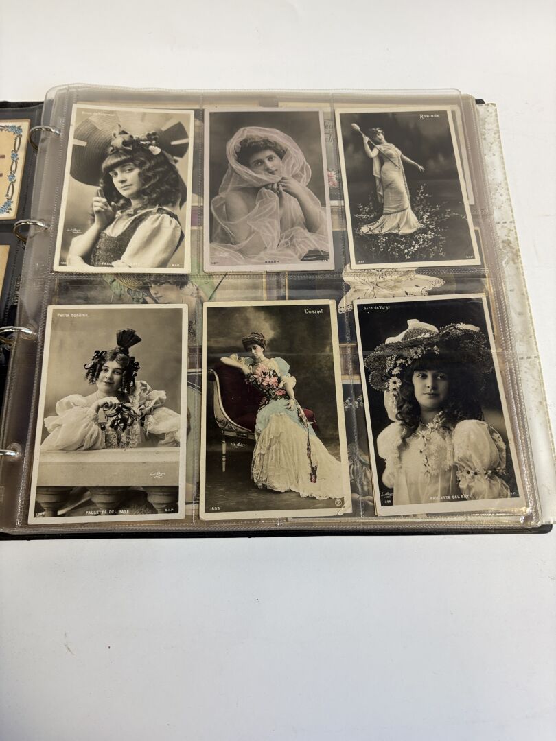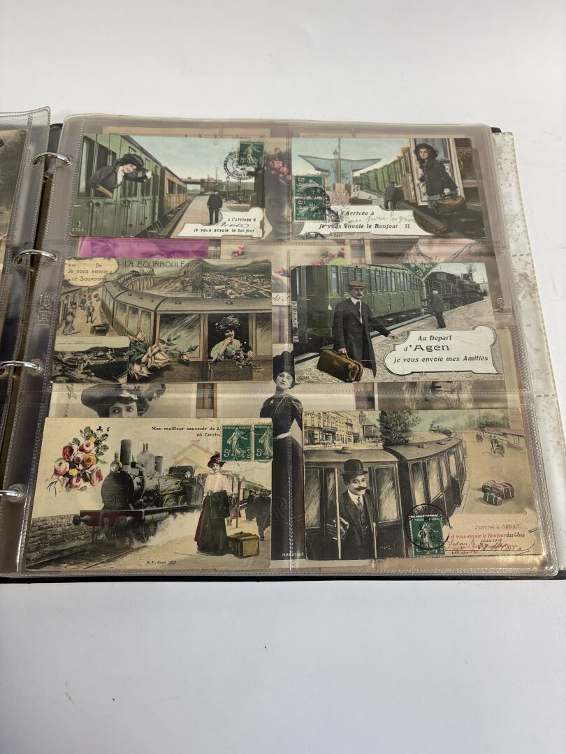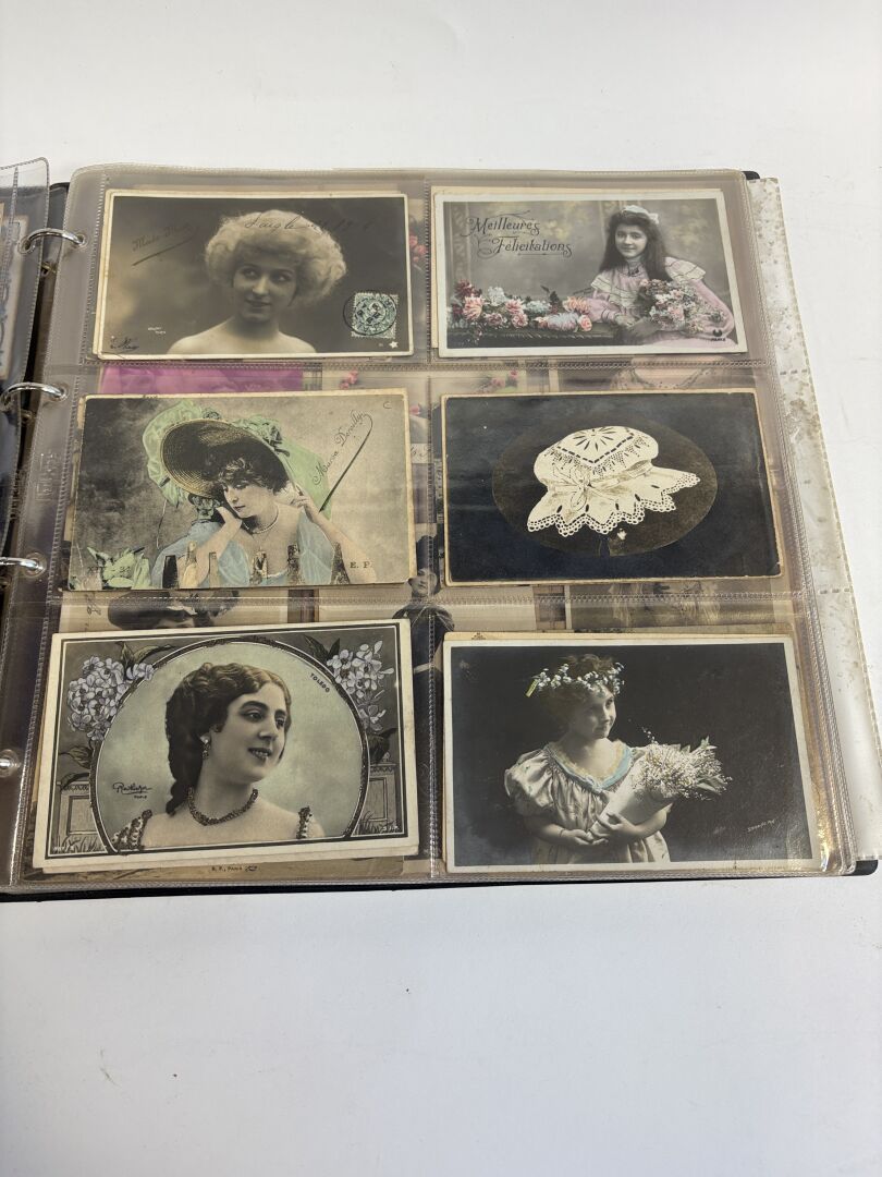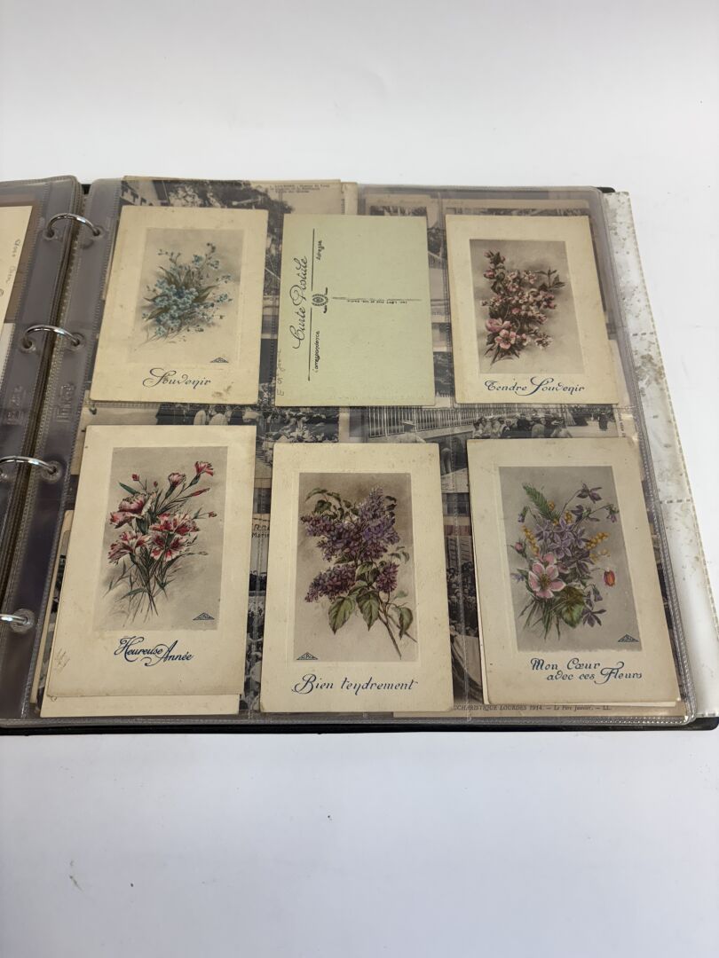 Album grenat de plus de 200 cartes postales anciennes contenant des cartes fantaisies, des cartes publicitaires, des cartes d'aventures et divers