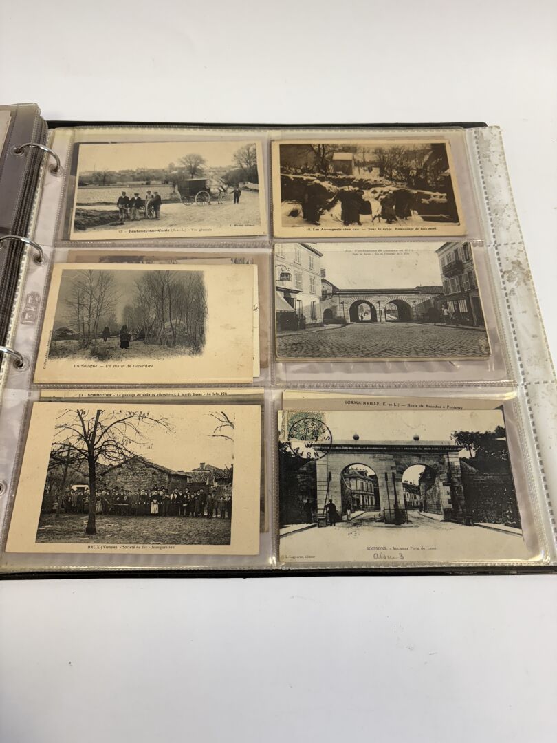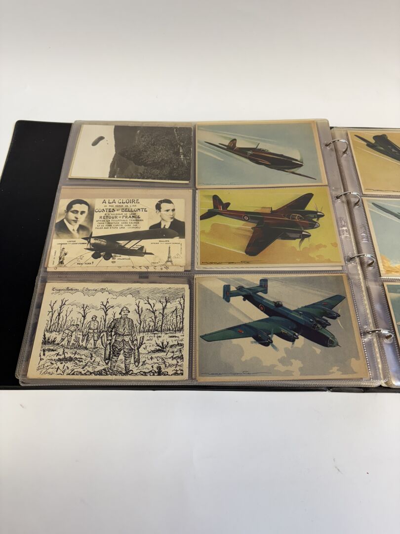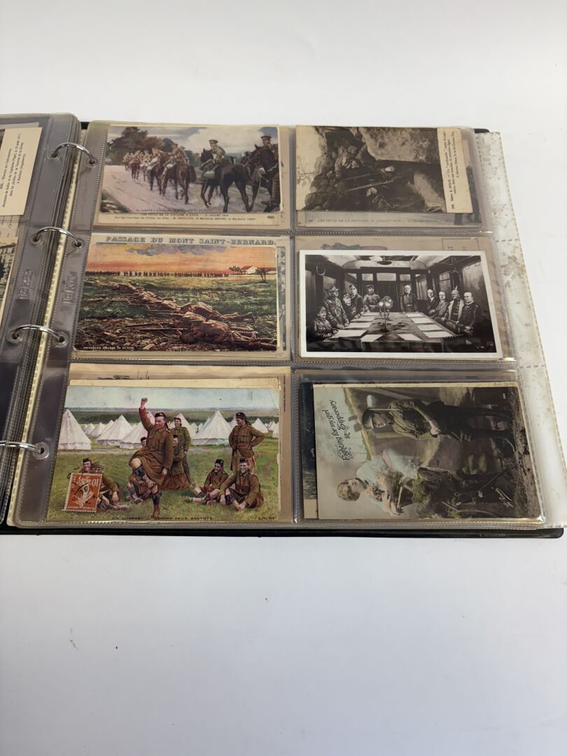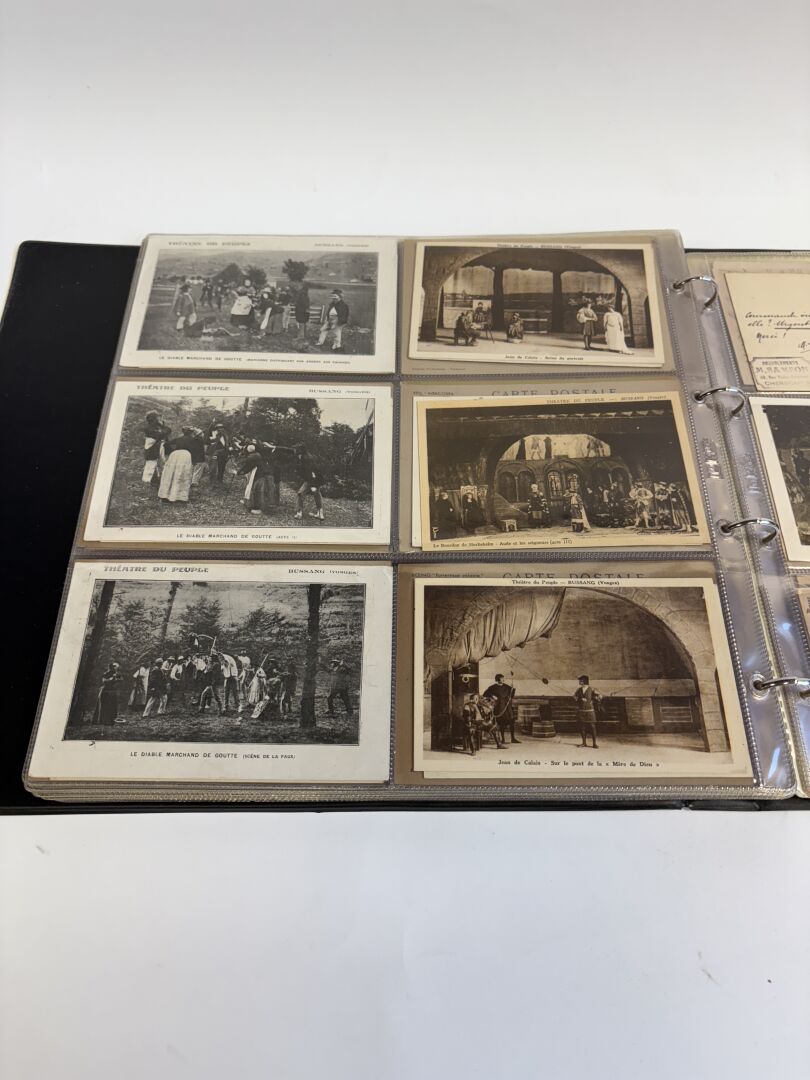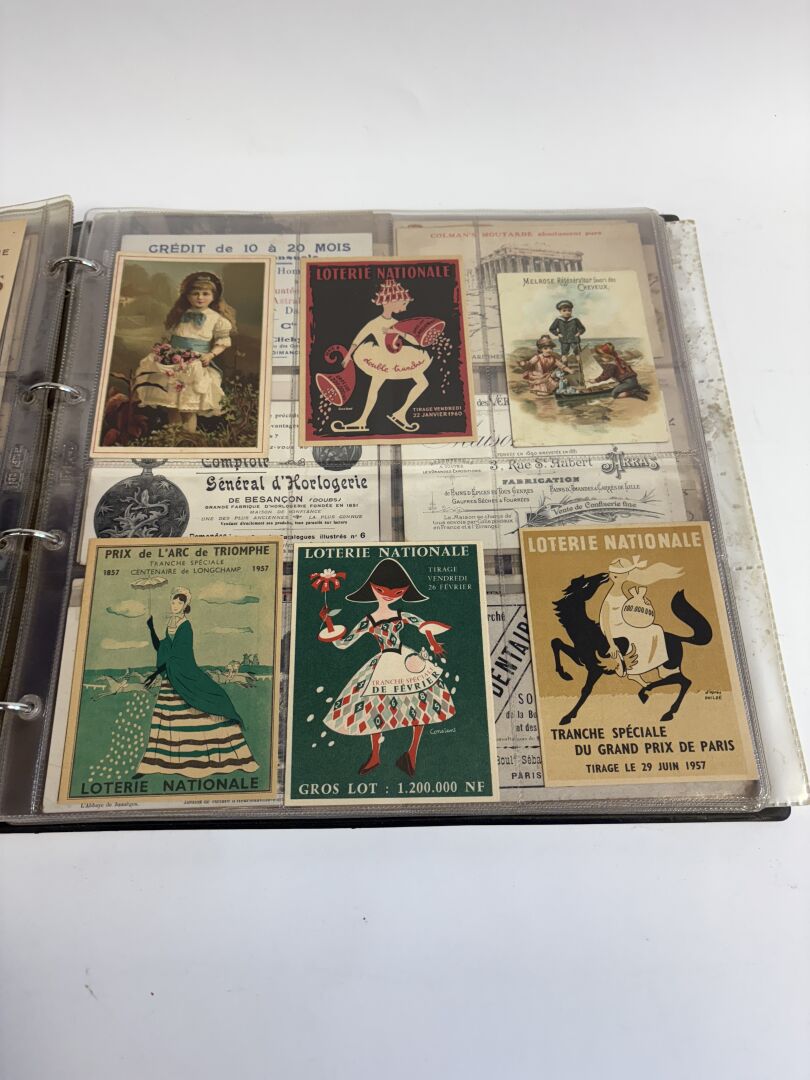Album grenat de plus de 200 cartes postales anciennes contenant des cartes fantaisies, des cartes publicitaires, des cartes d'aventures et divers