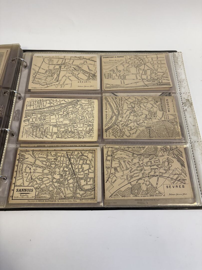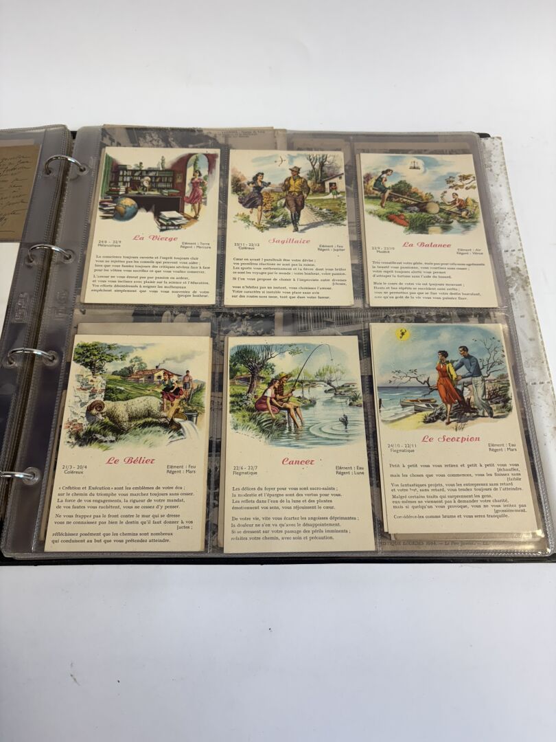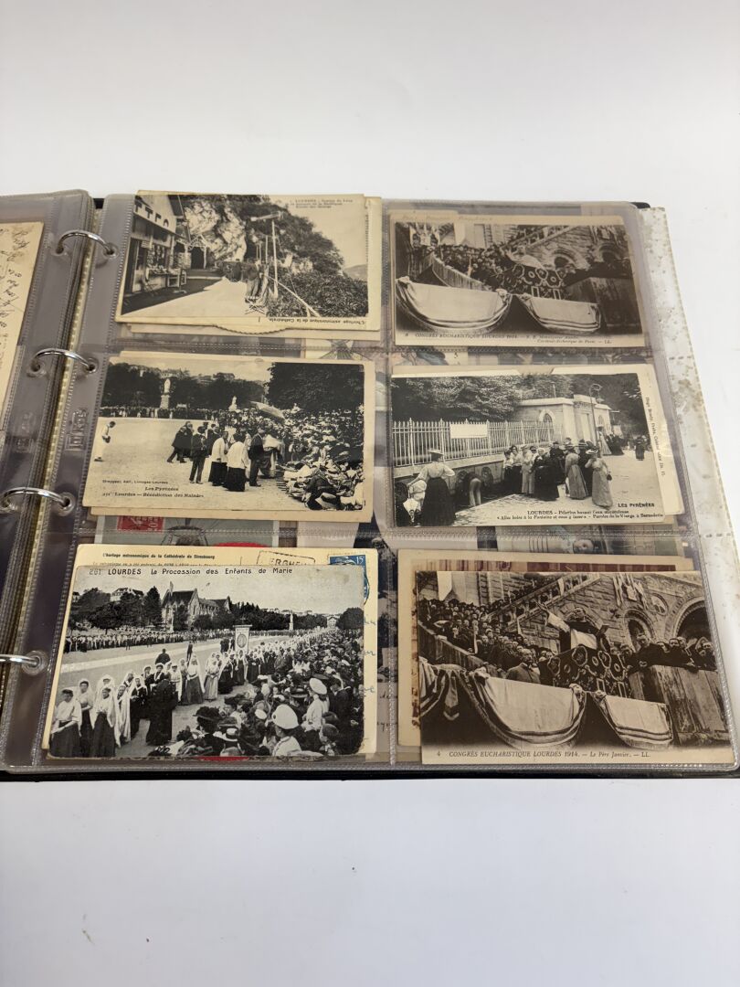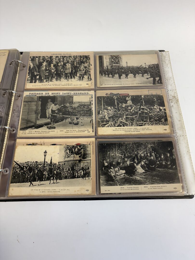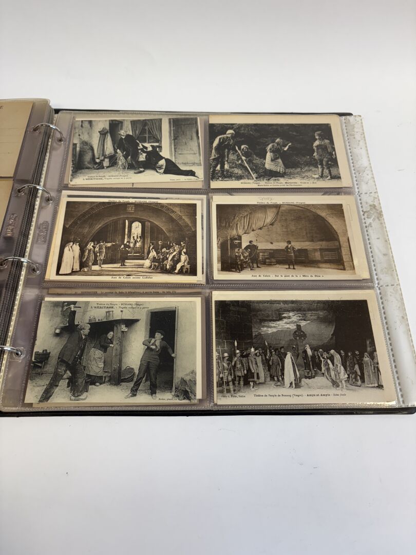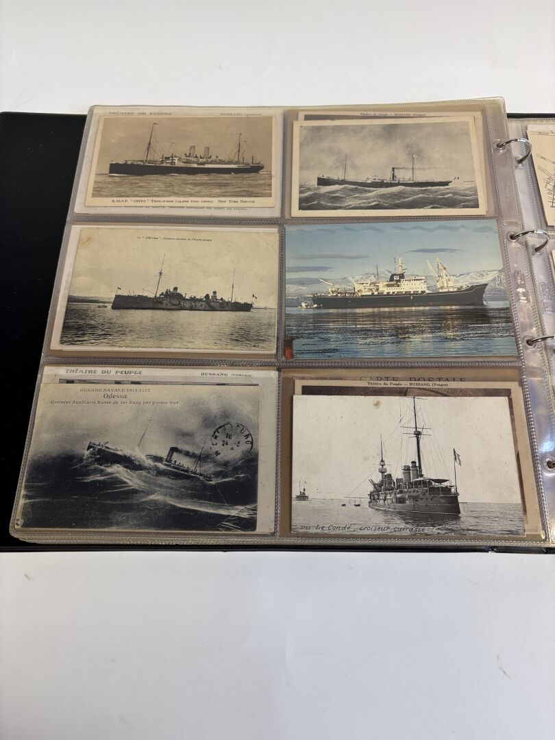Album grenat de plus de 200 cartes postales anciennes contenant des cartes fantaisies, des cartes publicitaires, des cartes d'aventures et divers