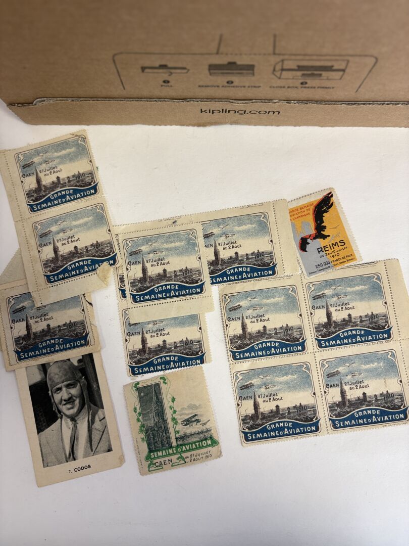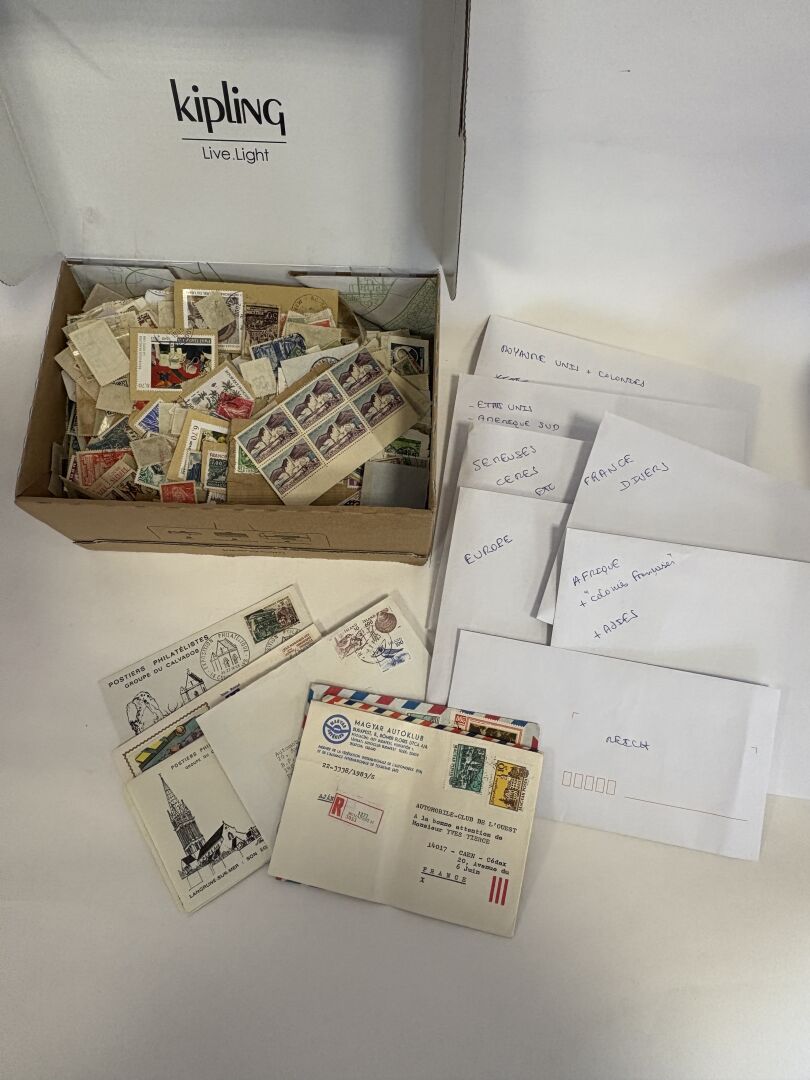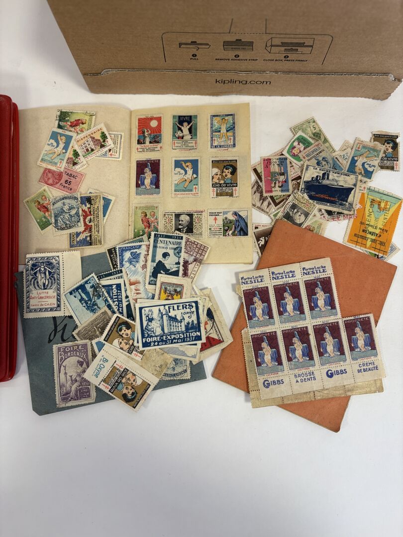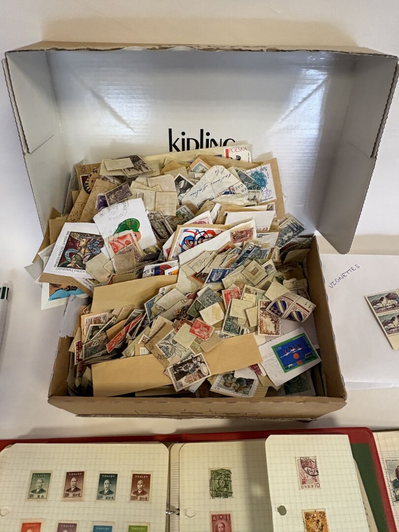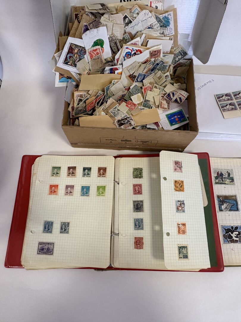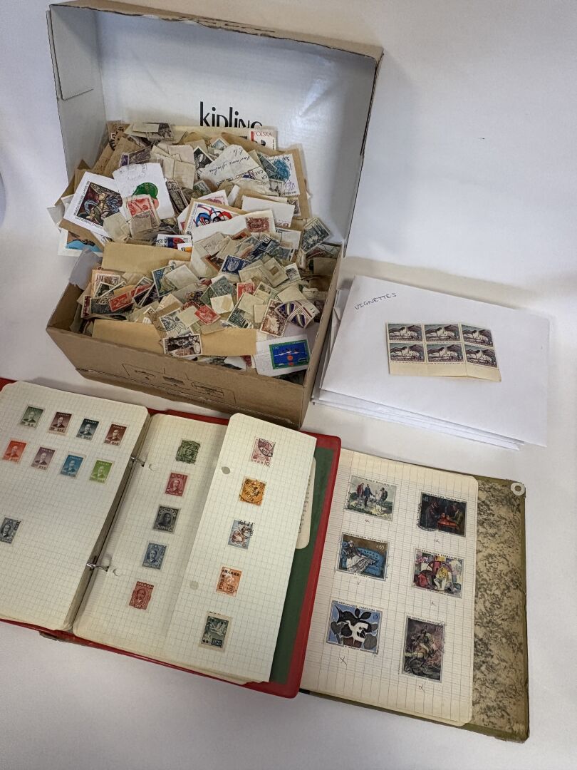 Lot de deux albums de timbres tous pays. On y joint une boite de vrac, dont deux enveloppes de vignettes.