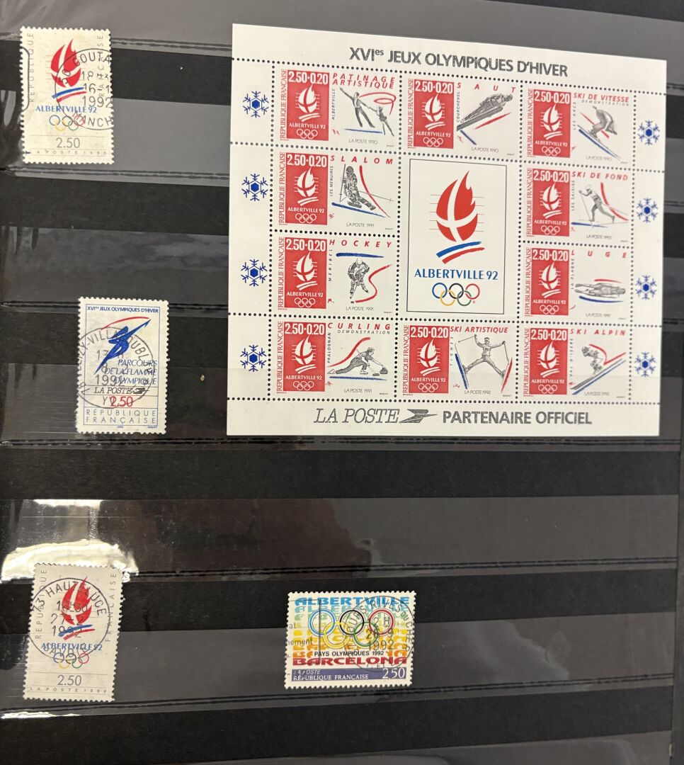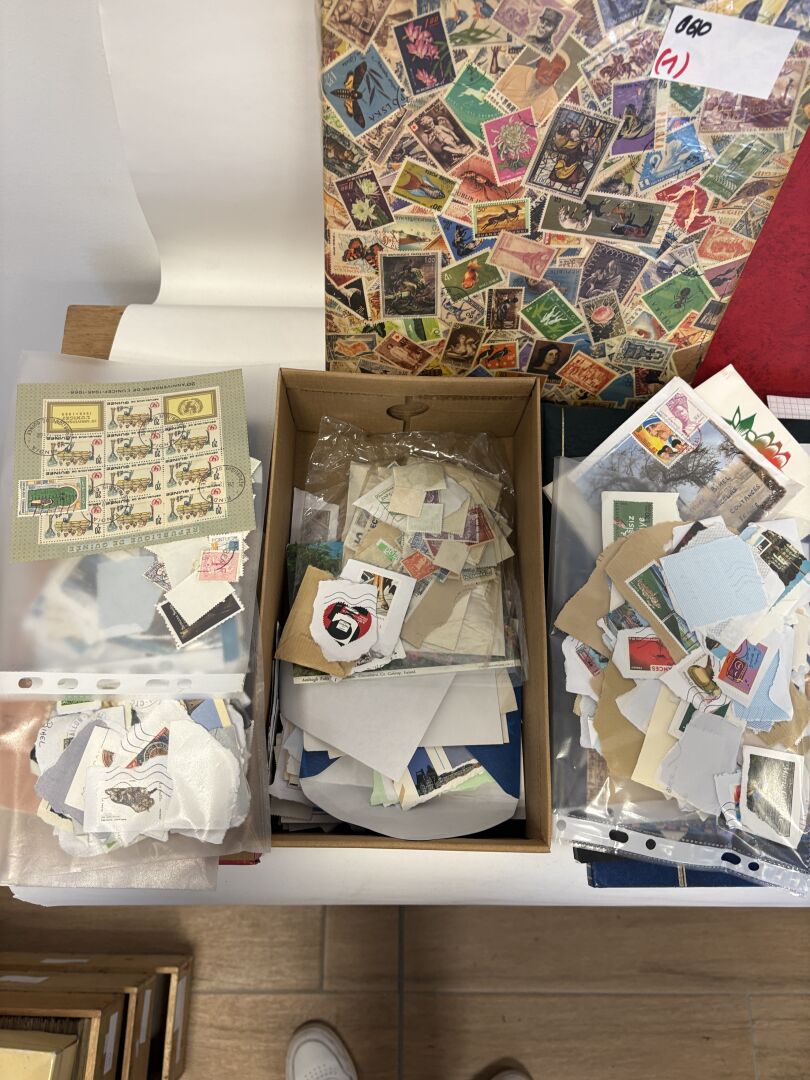 Lot de 4 albums de timbres étrangers dont de la France, en majorité oblitérés et une boite à chaussures.