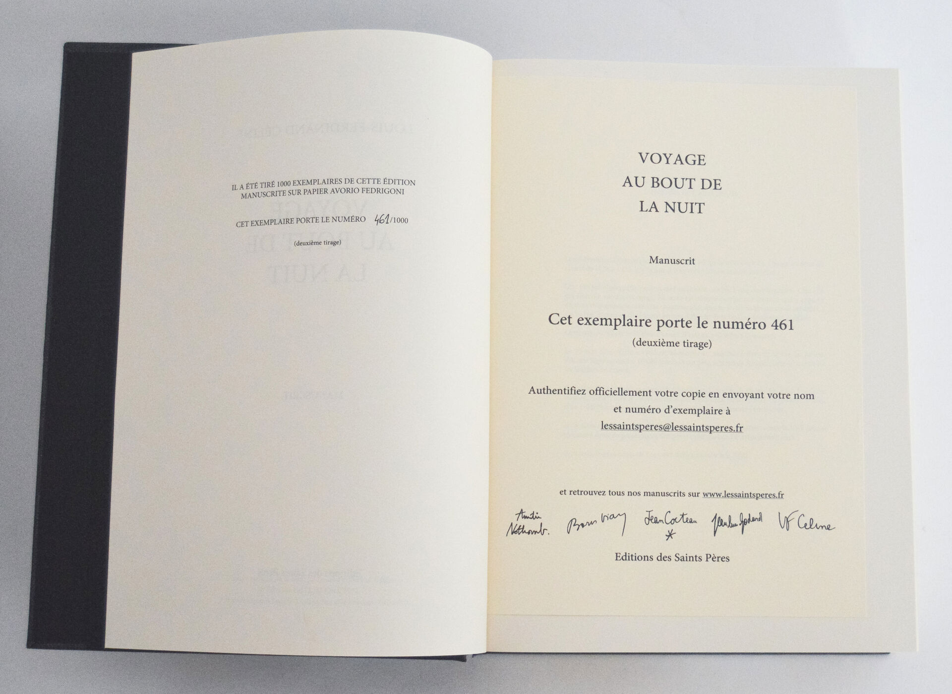 CELINE. Manuscrit du Voyage au bout de la nuit. Les saint pères. Edition sur papier Avorio Fedrigoni numérotée 461/1000.Toile bleue, titre argenté sur plats supérieur et dos, sous étui cartonné recouvert de toile bleue.