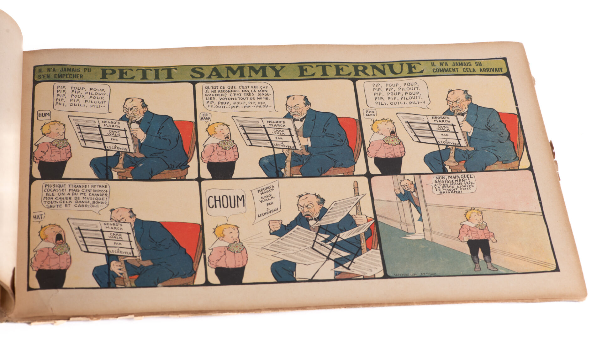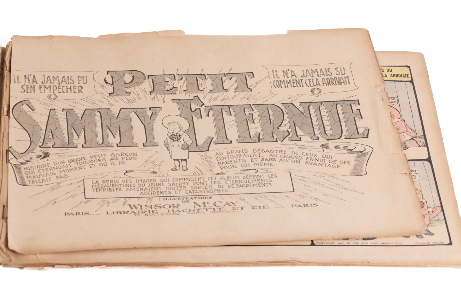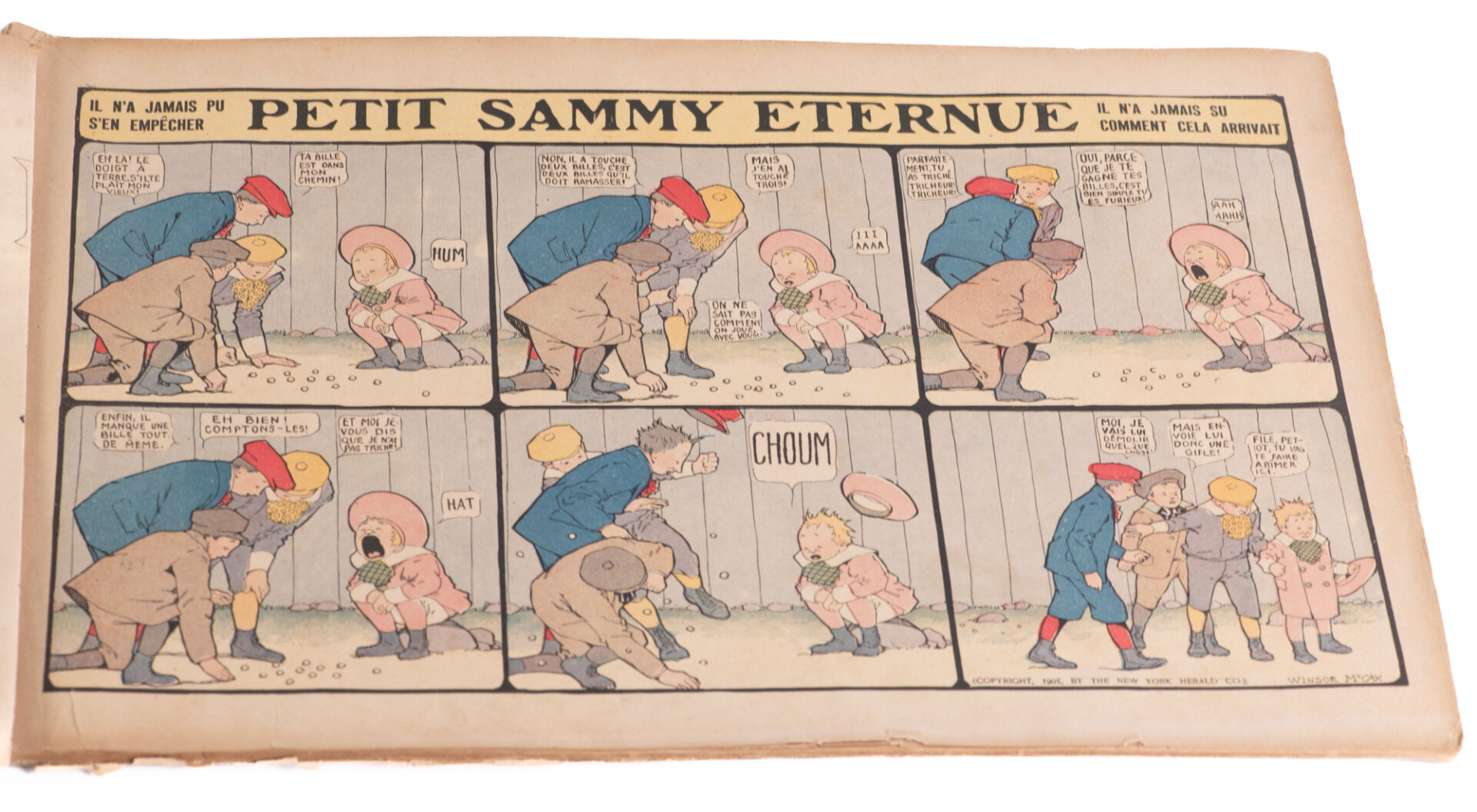 Winsor MCKAY. "Petit Sammy éternue". Paris : Librairie Hachette et Cie, 1906. - In-folio oblong, cartonnage illustré de l'éditeur. Édition originale française. En l'état. 29 cm x 43 cm Les premiers strips de McCay (1867-1934), pionnier du cinéma d'animation et auteur reconnu de bandes dessinées, parurent dans le " New York Herald " à partir du 24 juillet 1904. Chaques semaines, il met en scène les éternuements du petit Sammy aux conséquences désastreuses pour son entourage.