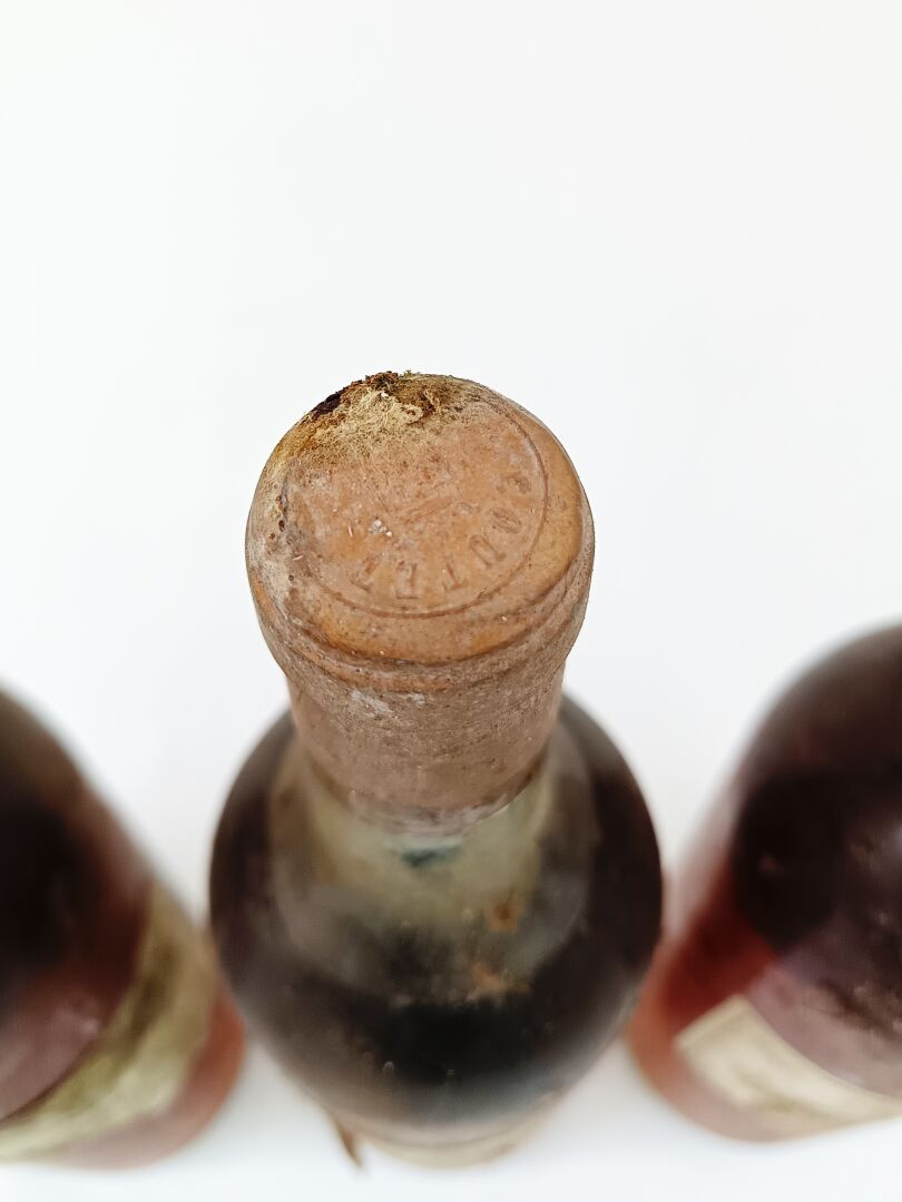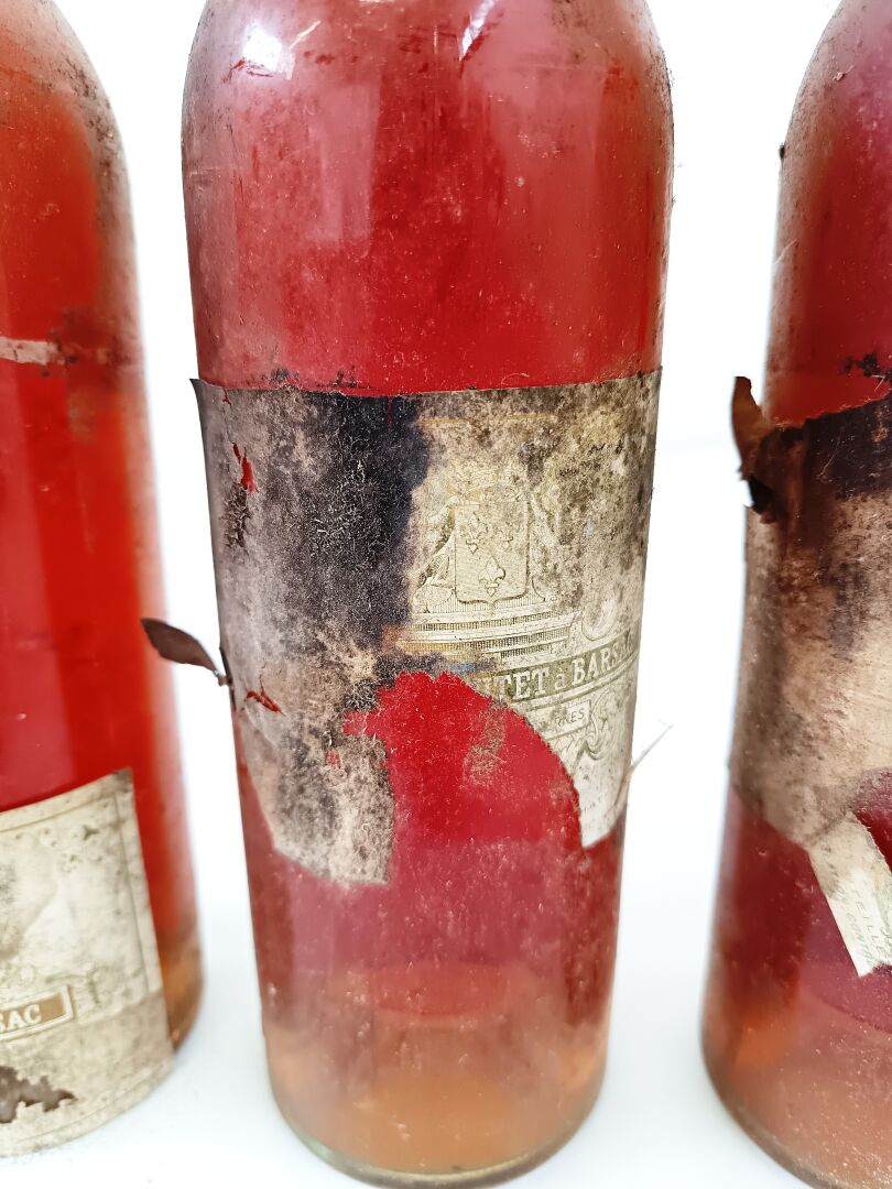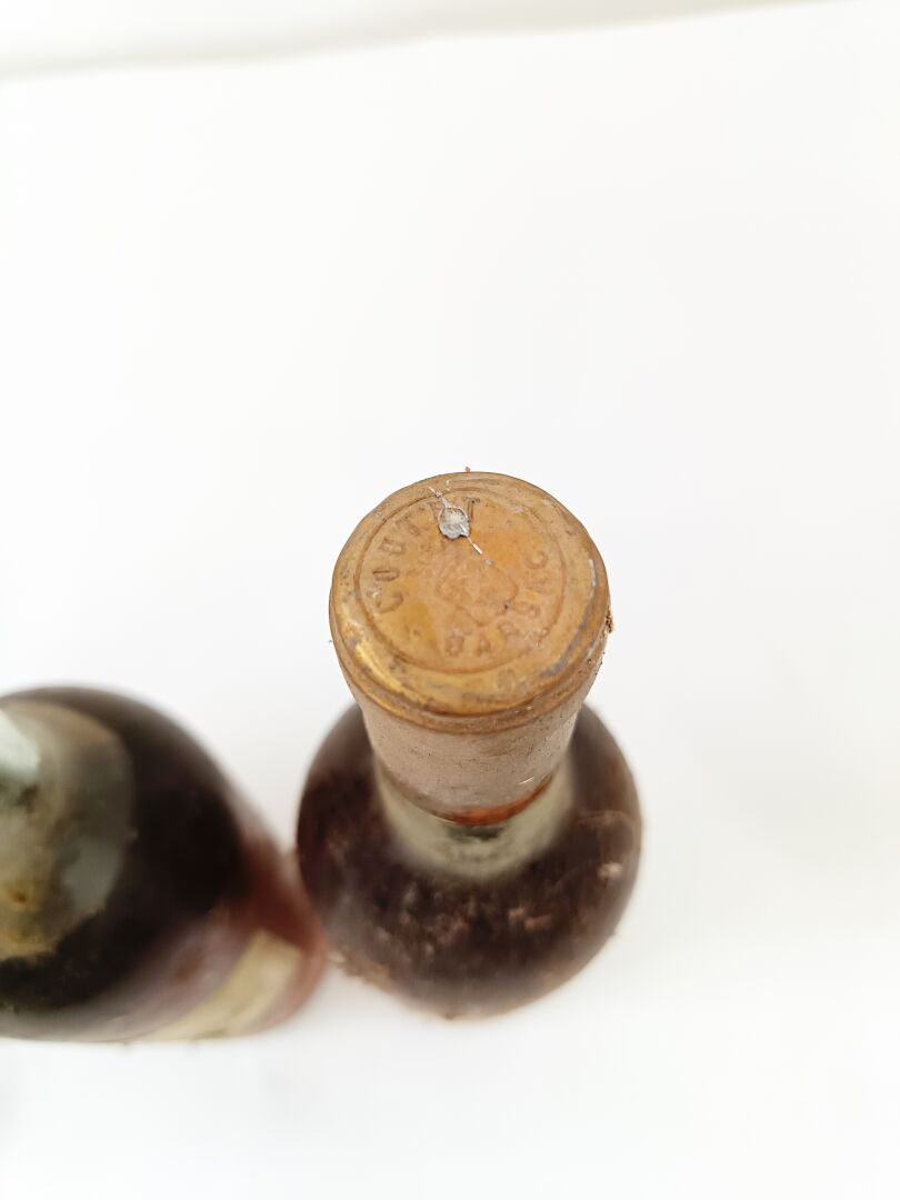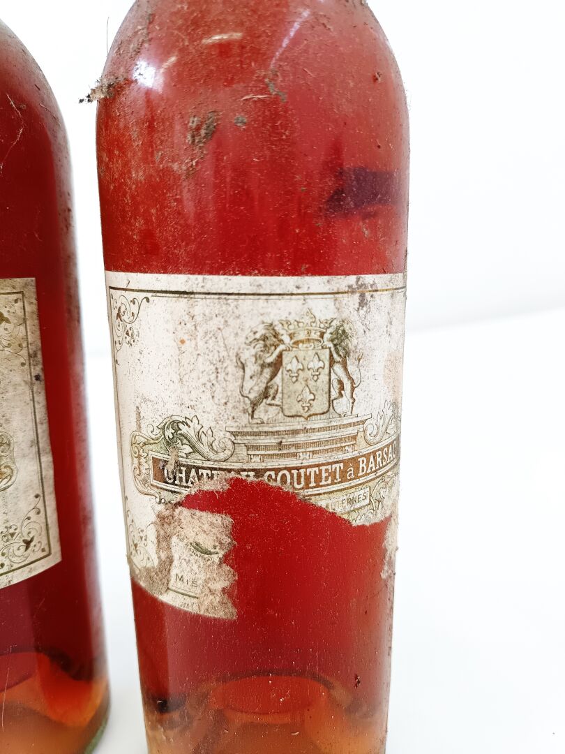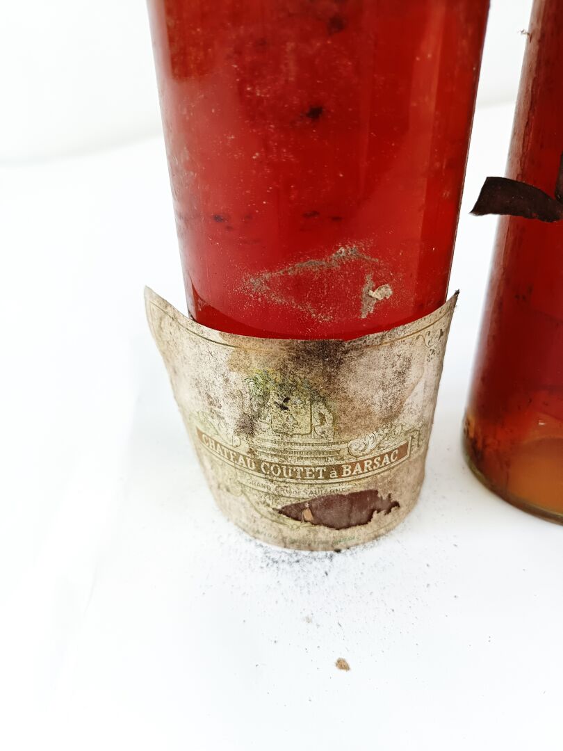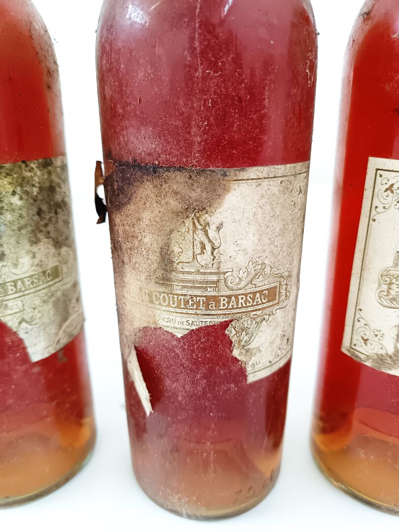 4 bouteilles Chateau Coutet 1957 1er Cru Sauternes (niveaux haute épaule, etiquettes très abimées, déchirées, millésimes sur les bouchon)