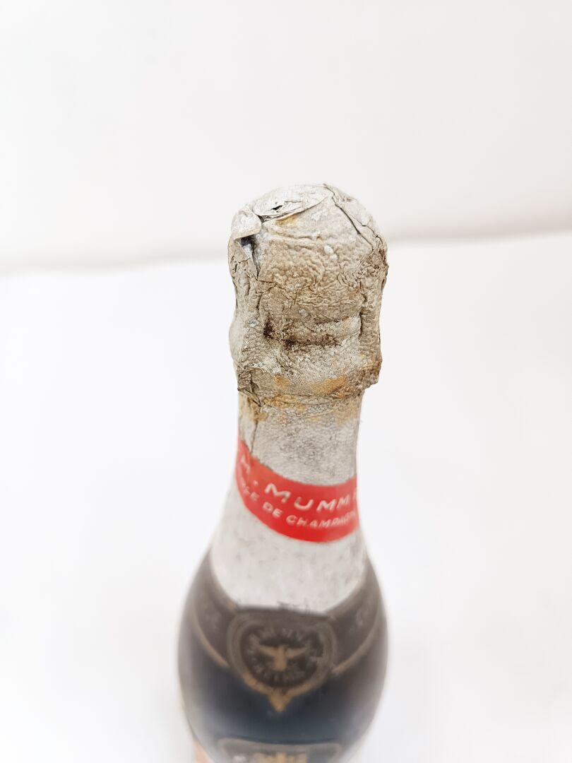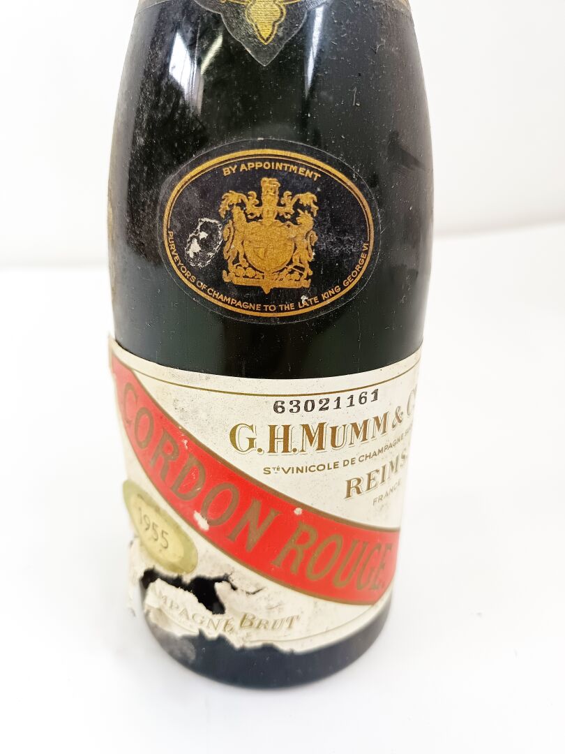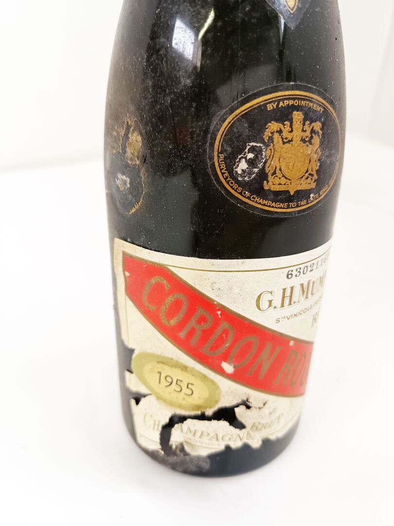 1 bouteille Champagne GH Mumm 1955 Cordon rouge (Niveau sous la coiffe. Etiquette marquée, déchirée, Coiffe abimée)