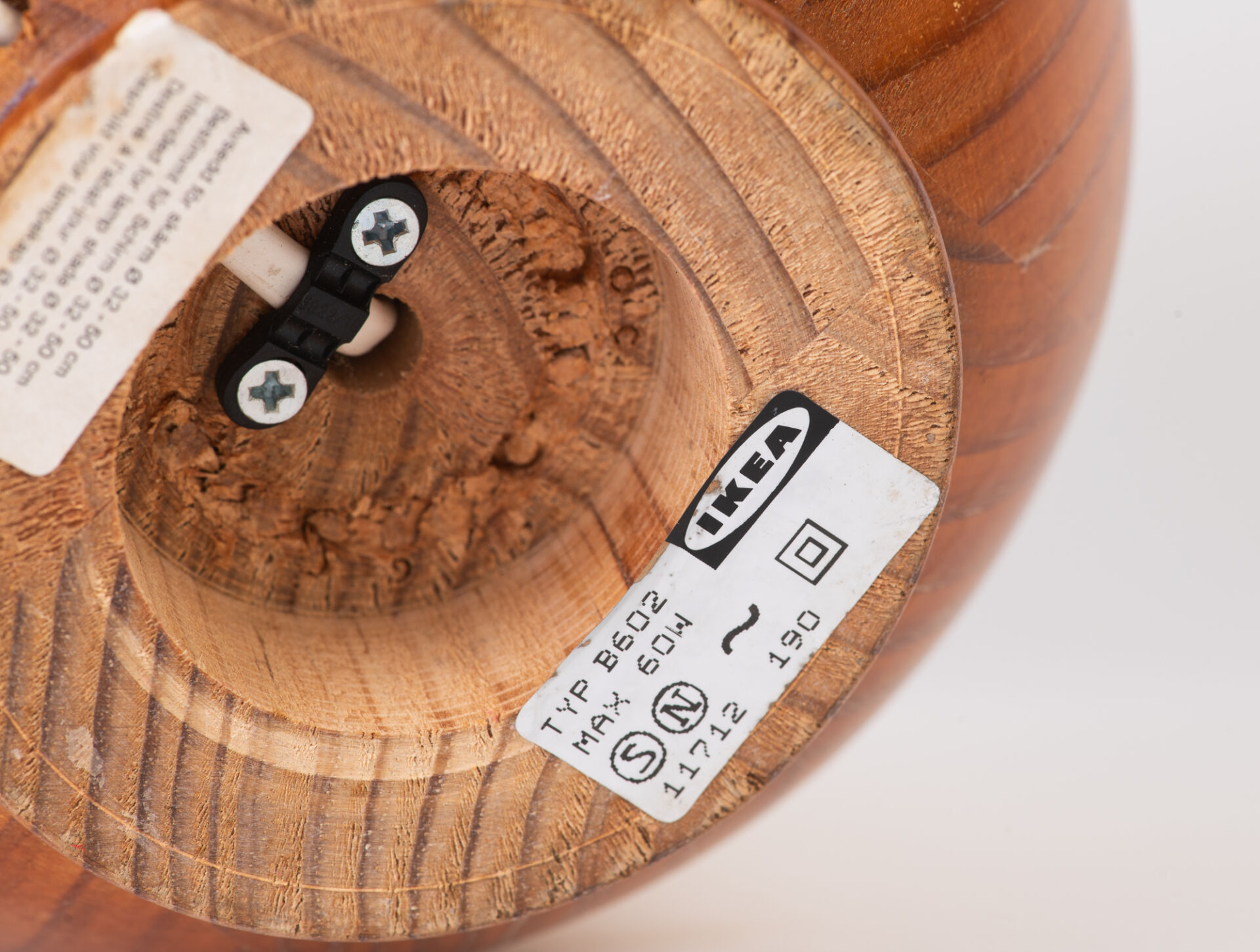 Ikea. Lampe en pin. H : 34 cm ; D : 14 cm On y joint : Paire de lampes boules en bois dont une étiquetée Lumina. H : 16,5 cm ; D : 10 cm