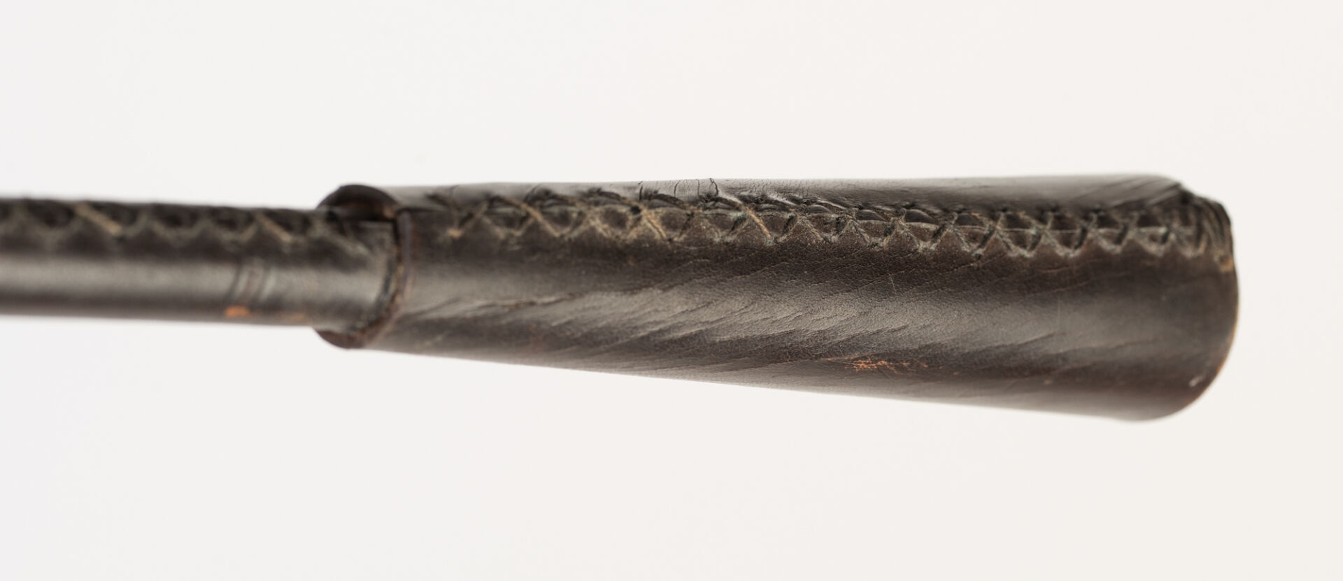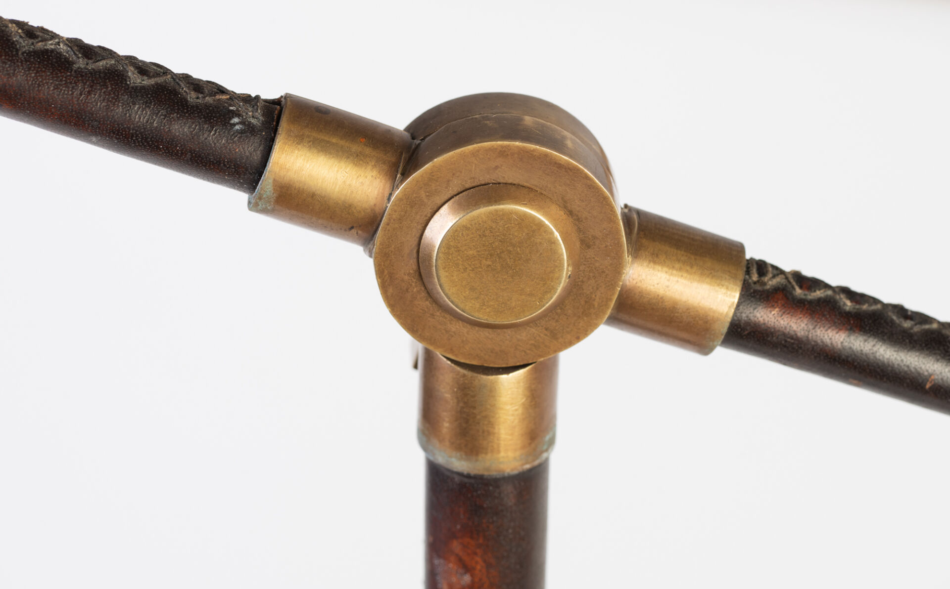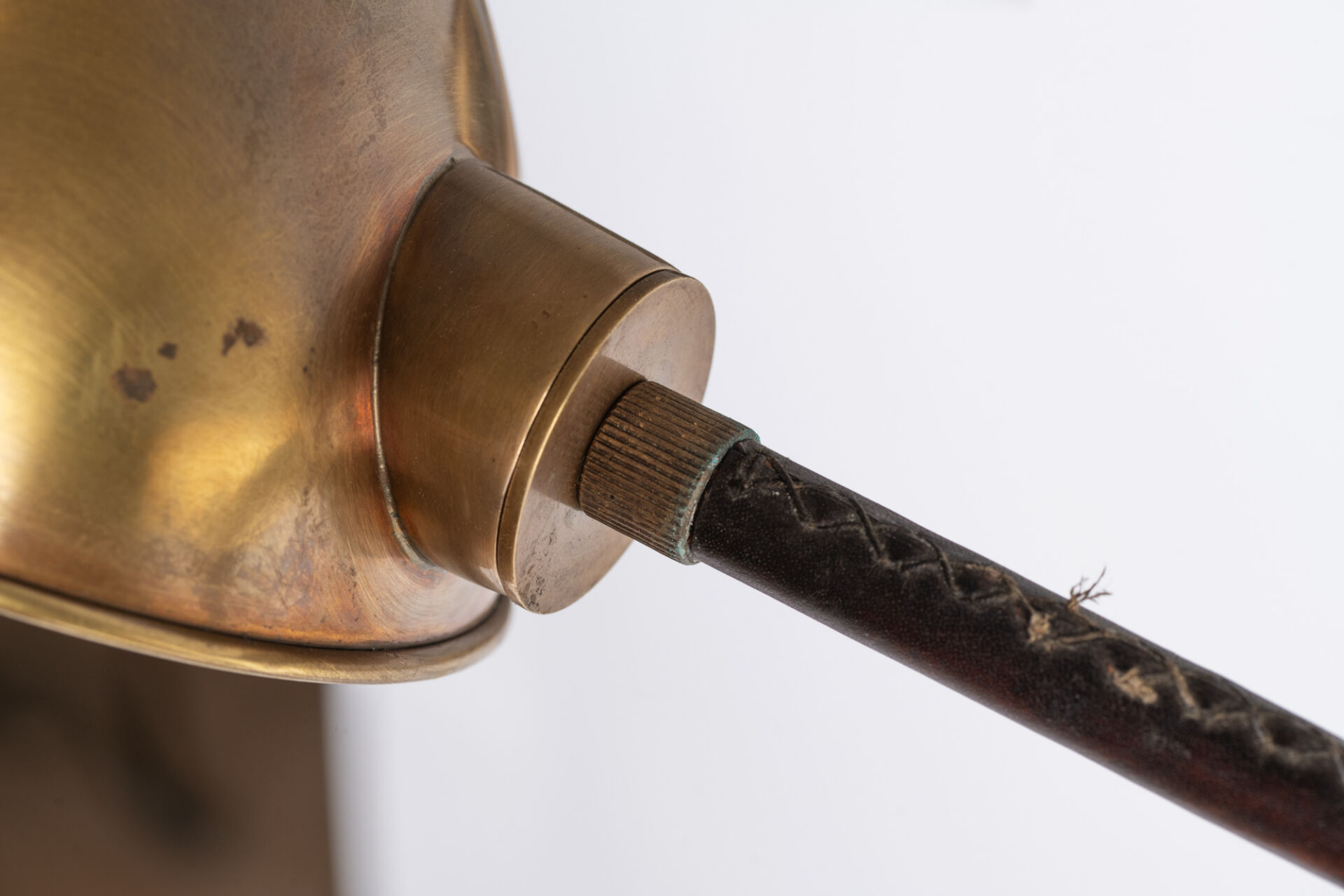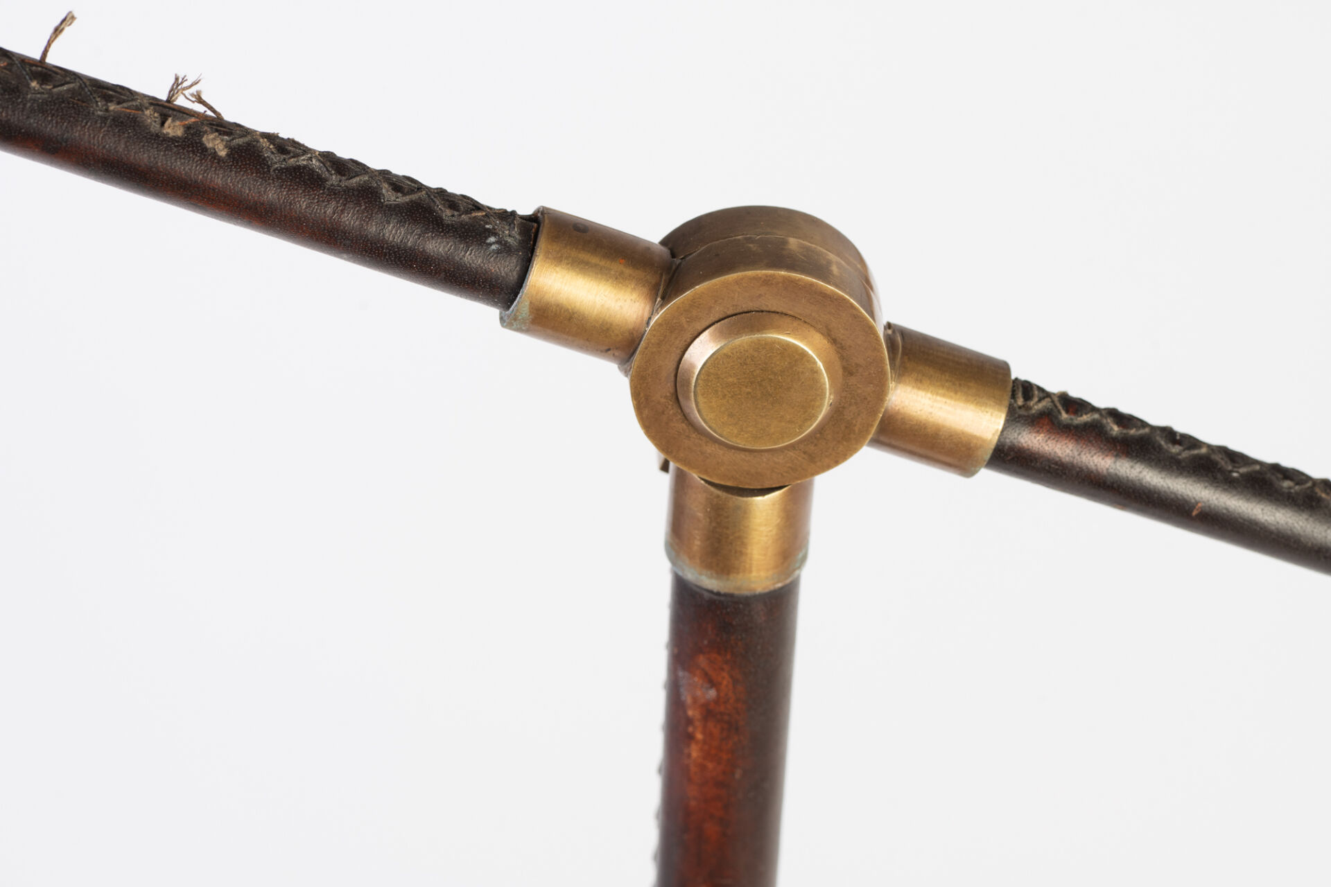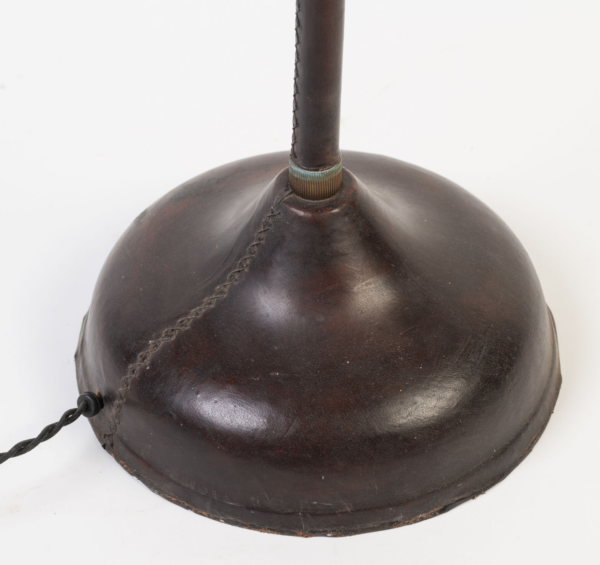 Dans le goût de Jacques ADNET (1900-1984). Lampadaire liseuse en laiton gainé de cuir surpiqué. Modèle similaire vendu lors de la vente "Pierre Bergé - D'UNE DEMEURE L'AUTRE - VOLUME II: LA DATCHA | MABROUKA | MAS THEO" par la Maison Pierre Berger et Associés et Sotheby's. H : 126 cm ; L : 86 cm ; l : 18 cm