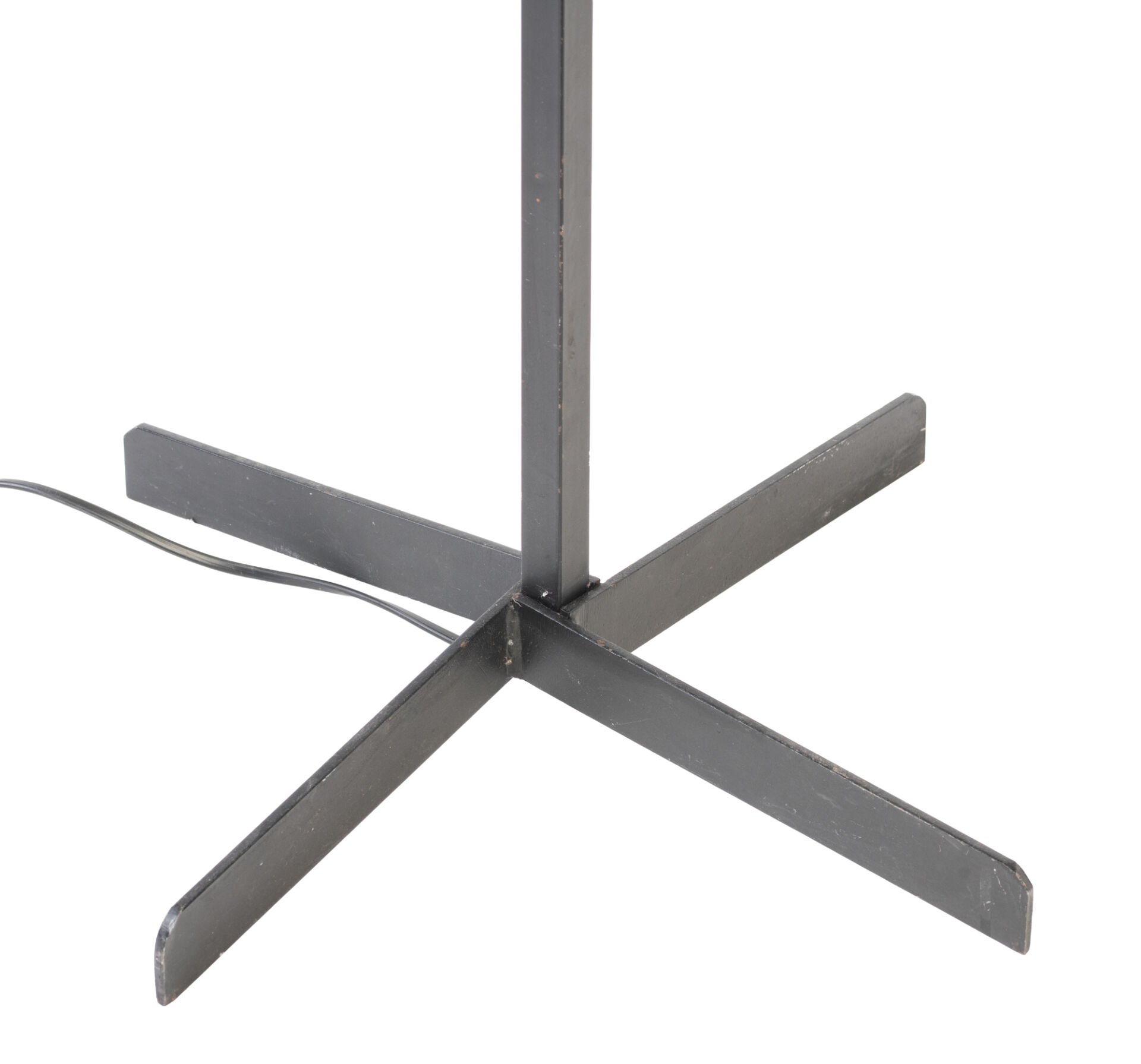 Lampadaire avec structure formée par un tube carré en métal laqué noir, surmonté d'un abat-jour en tissu crème. Vers 1950. H : 153 cm.