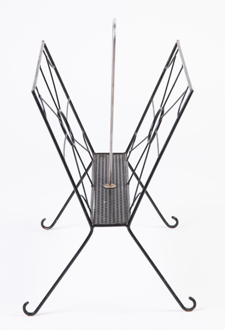 Dans le goût de Mathieu MATEGOT (1910-2001). Porte-revues en métal noir à décor ajouré et géométrique. H : 49 cm ; L : 42 cm ; l : 29,8 cm