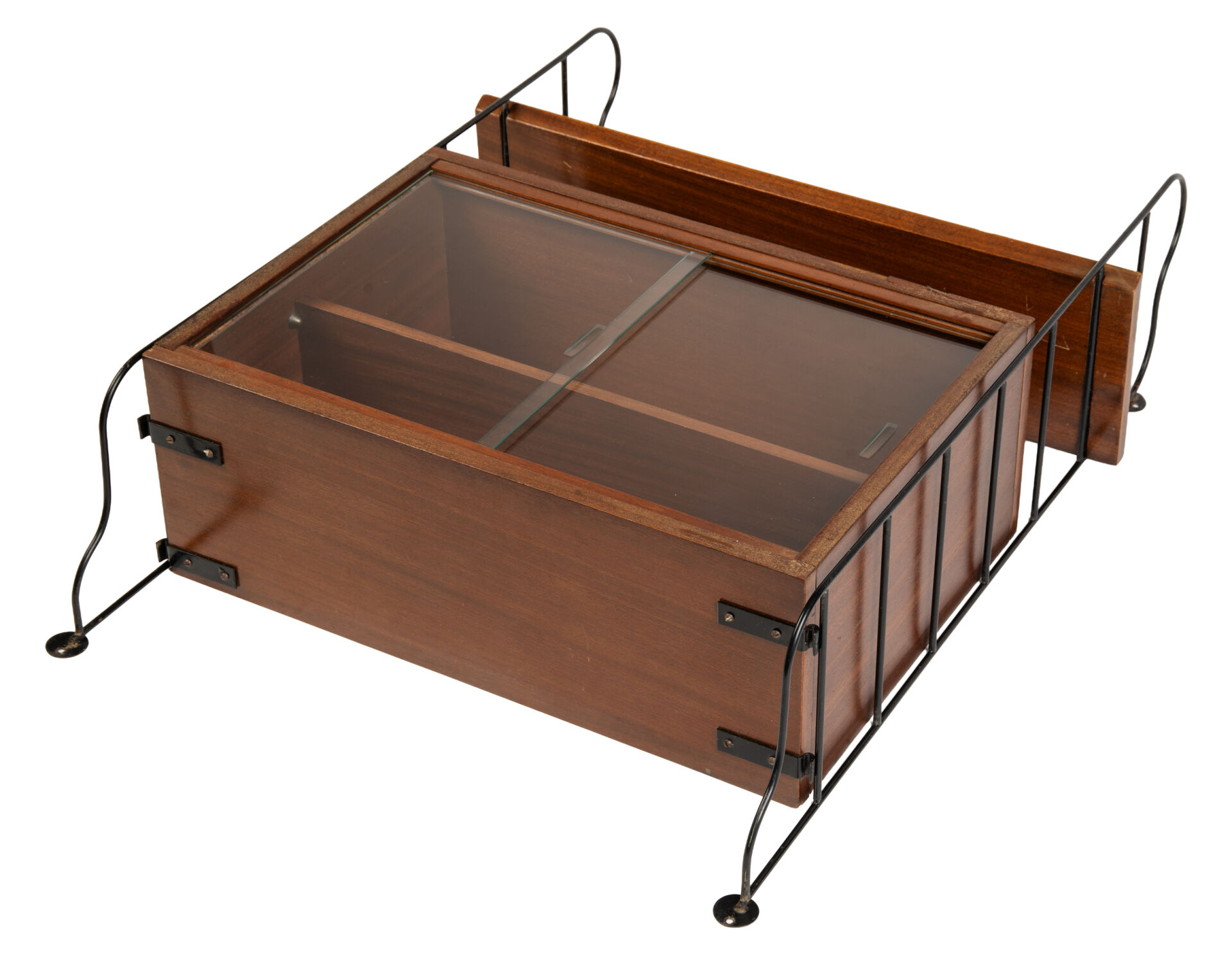 Dans le goût de String ou Tomado. Étagères - Vitrine dites "String" à une tablette et une vitrine ouvrant à deux vantaux vitrés coulissants. Vers 1960-1970. H : 82 cm ; L : 58 cm : l : 21 cm