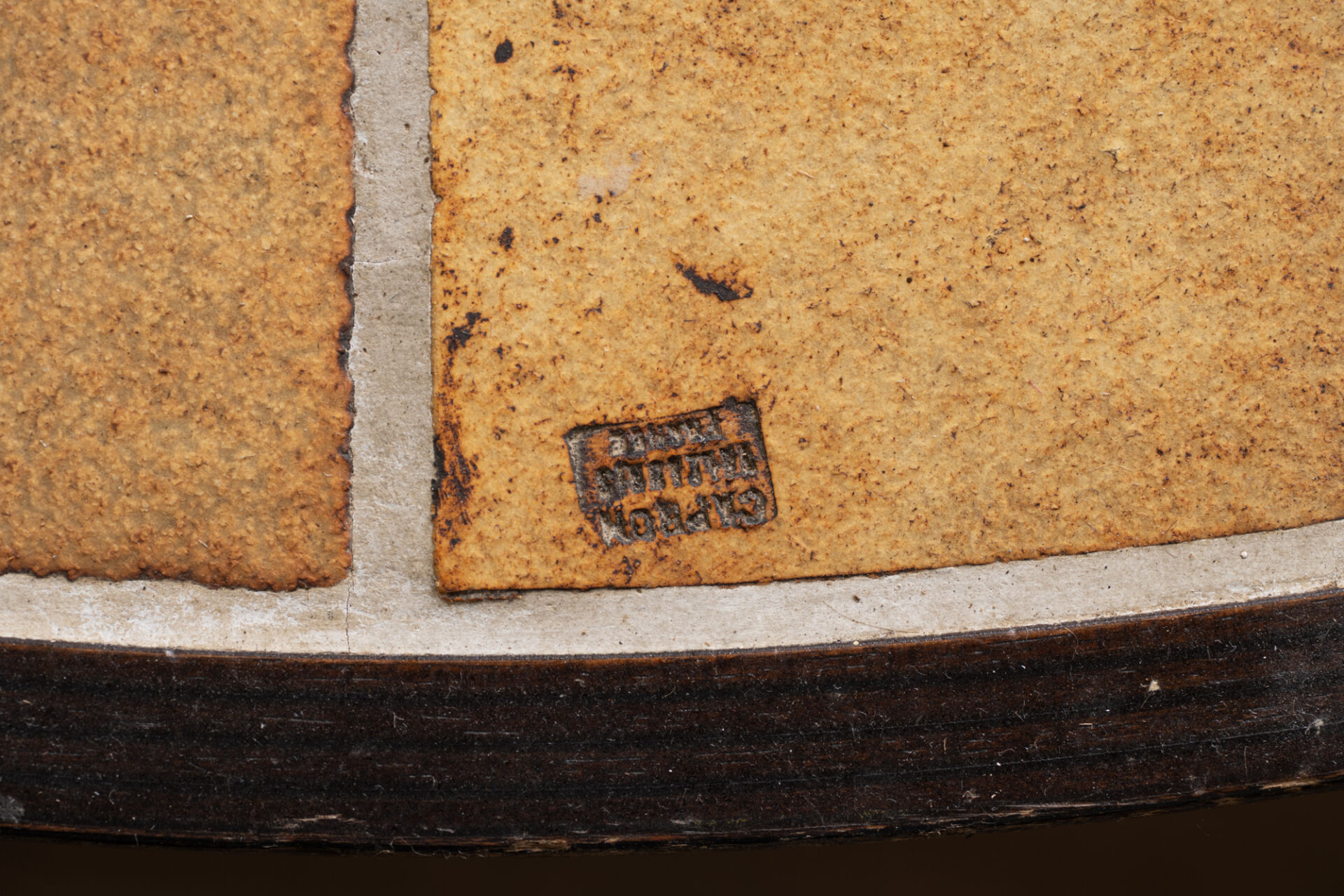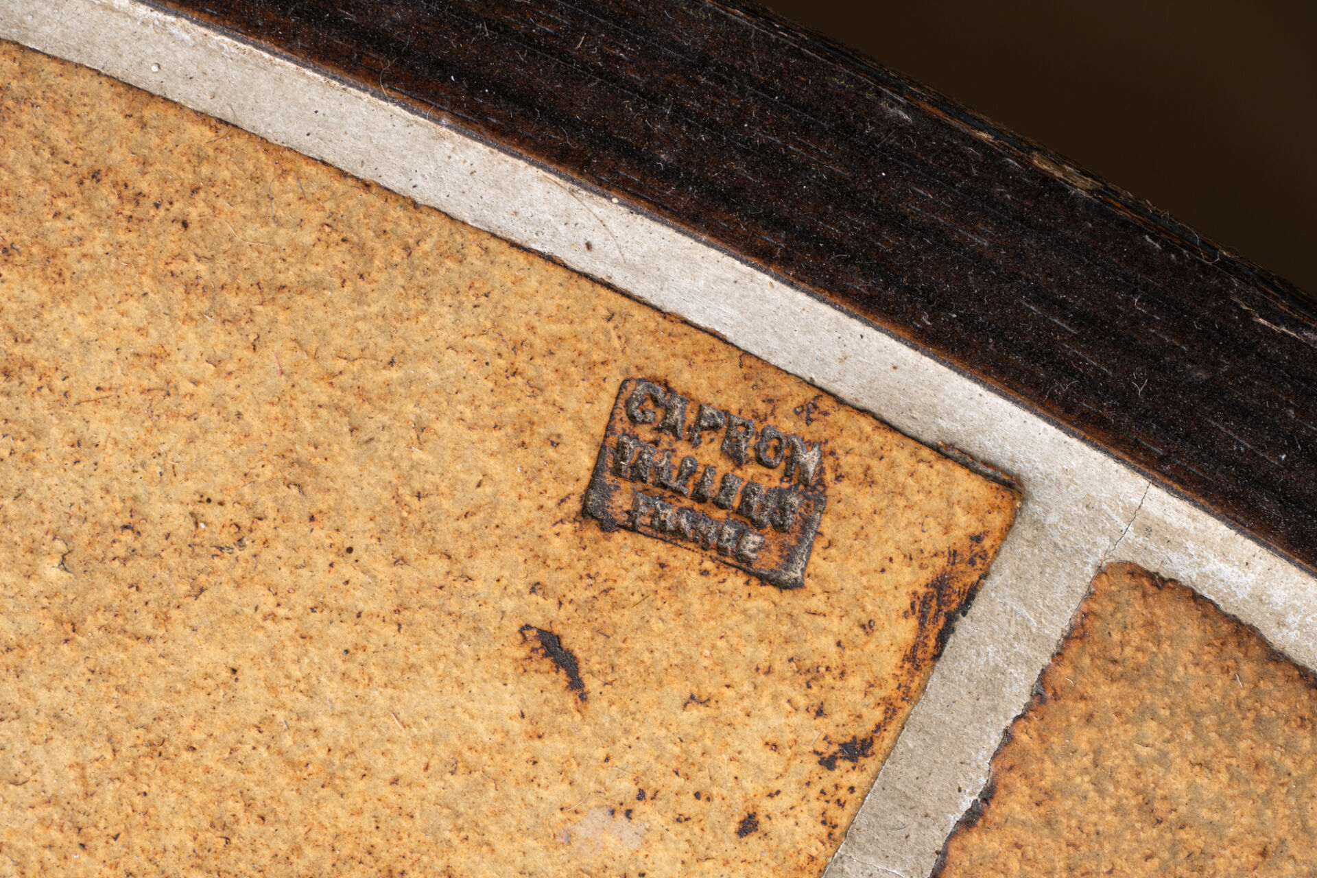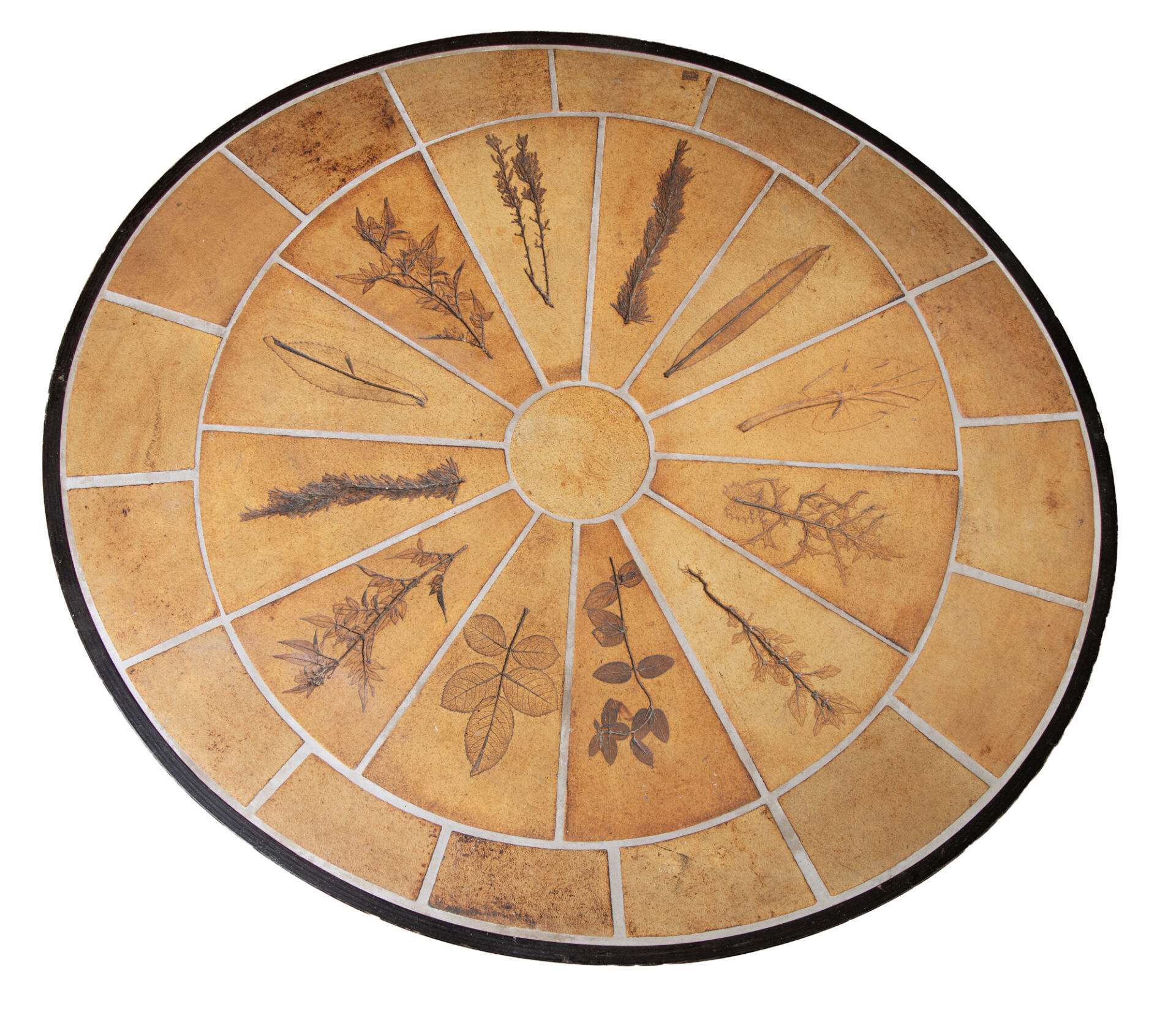Roger CAPRON (1922-2006), Vallauris. Table basse ovale, dessus en céramique émaillée à décor estampé de feuilles et piètement en bois. Porte tampon. H : 30 cm ; L : 103 cm ; l : 92 cm