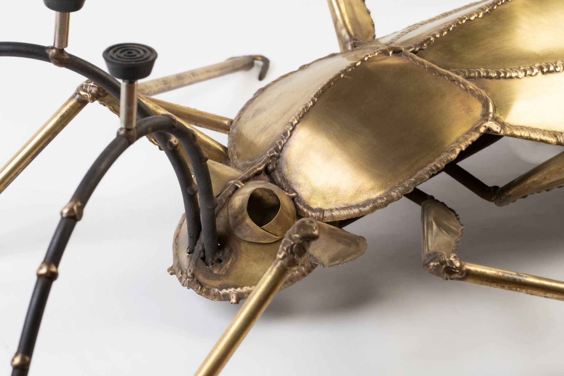 Dans le goût de Jacques DUVAL BRASSEUR (1934) ou Henri FERNANDEZ (1946). Table basse - lampe avec dessus verre et piètement figurant un scarabée en laiton doré. H : 28 cm ; D : 80 cm