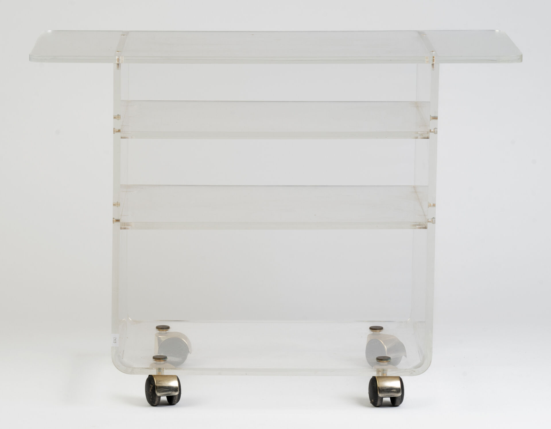 Attribué à David LANGE pour les éditions Marais, France. Meuble TV sur roulettes modèle "Les invisibles" en plastique transparent. Vers 1980. H : 59 cm ; L : 80 cm ; l : 39 cm