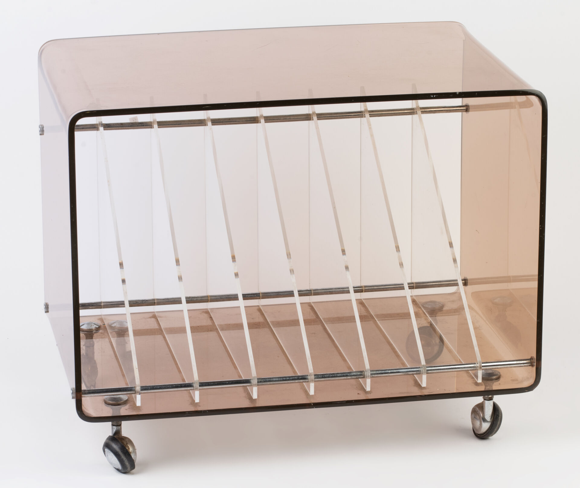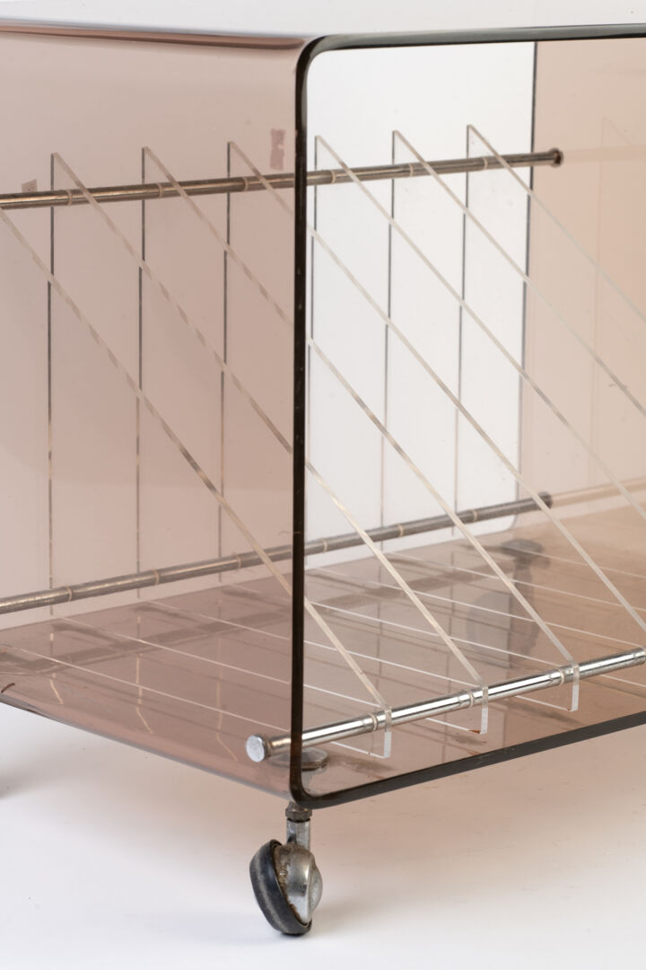 Attribué à Michel DUMAS pour ROCHE BOBOIS. Meuble porte-vinyles en plexiglas fumé sur roulettes. Vers 1970. H : 49 cm ; L : 59 cm ; l : 40 cm