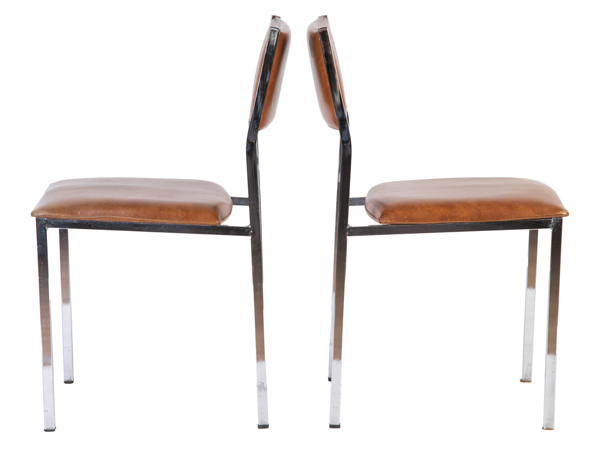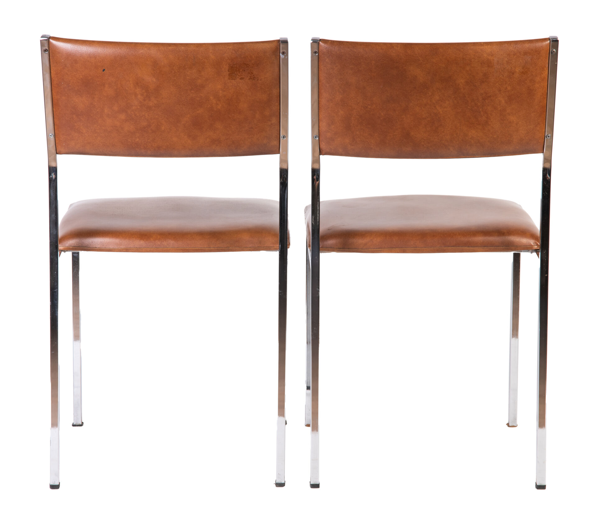 Paire de chaises en métal chromé et garniture en similicuir fauve. Vers 1970. H : 78,5 cm ; L : 41,5 cm ; l : 44 cm