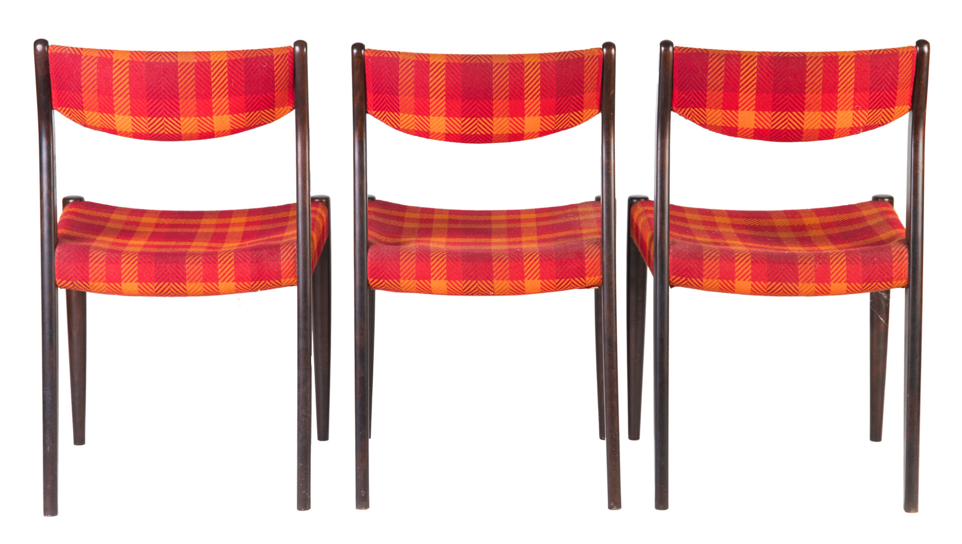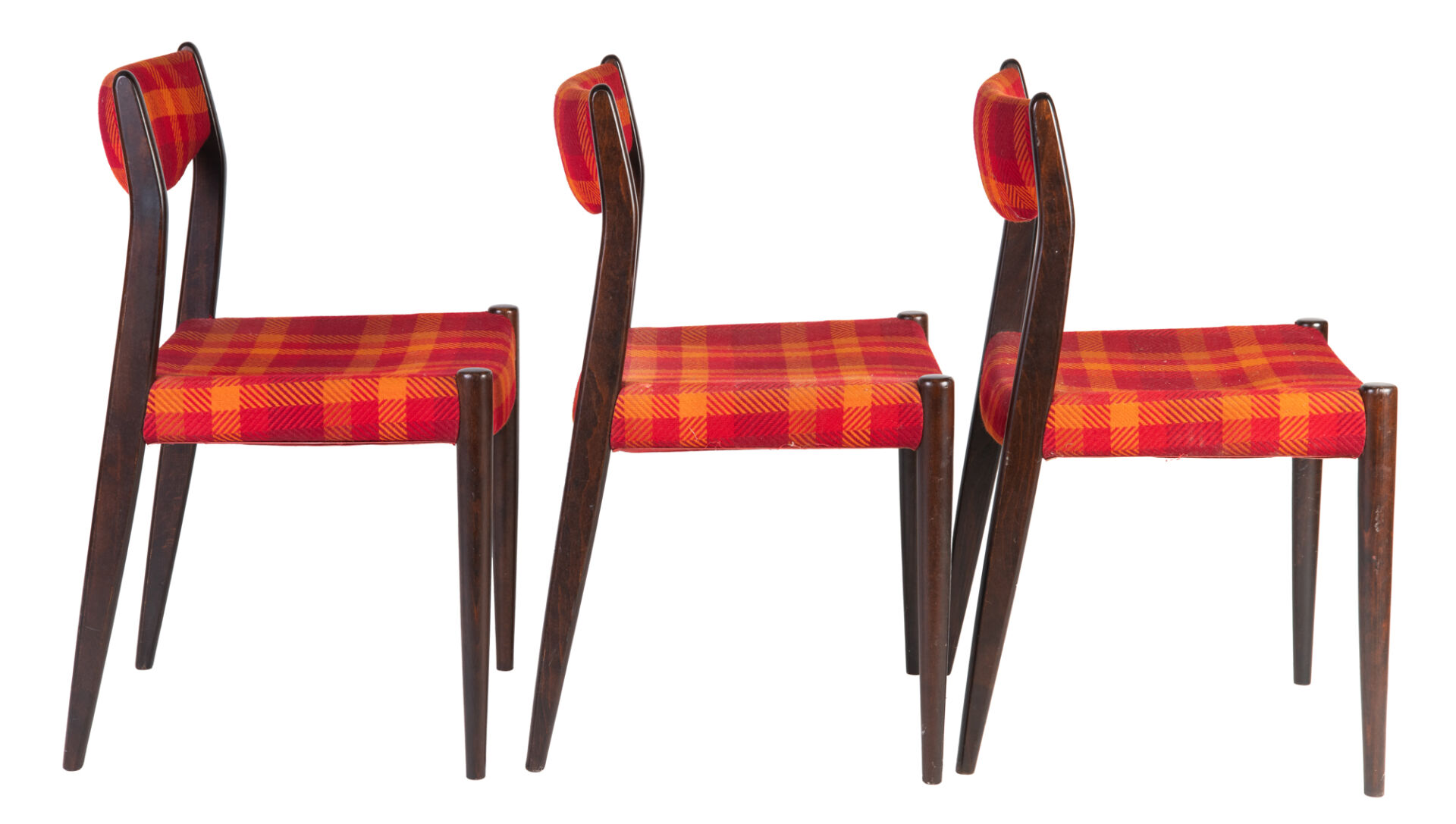 Scandinavie. Suite de trois chaises en bois teinté, garniture en tissu à carreaux orangés et rouges. Vers 1970. H : 77 cm ; L : 48 cm ; l : 47 cm