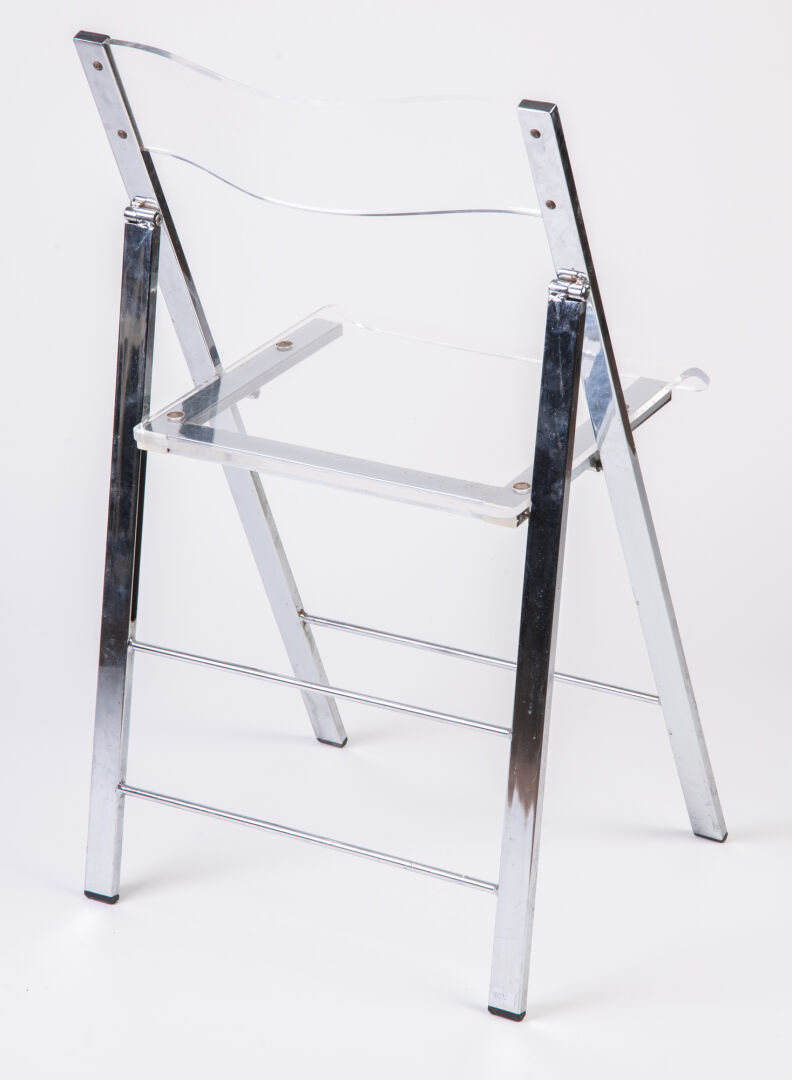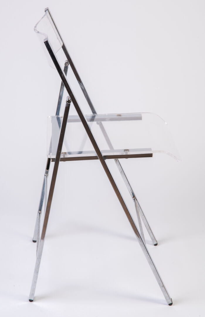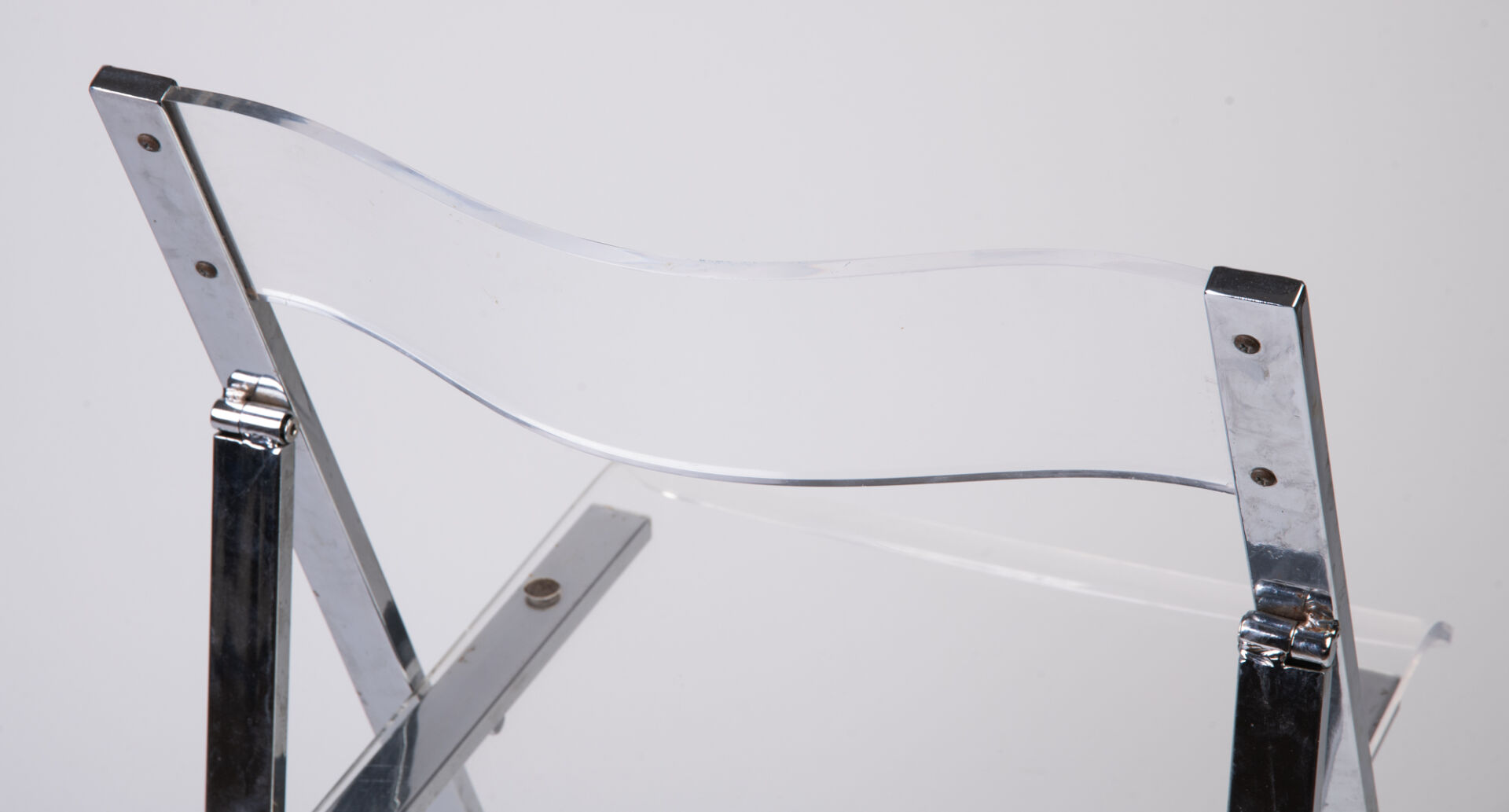 Dans le goût d'Emile SOUPLY (1933-2013). Chaise en plexiglas transparent pliante. H : 79 cm ; L : 45,5 cm ; l : 41,5 cm