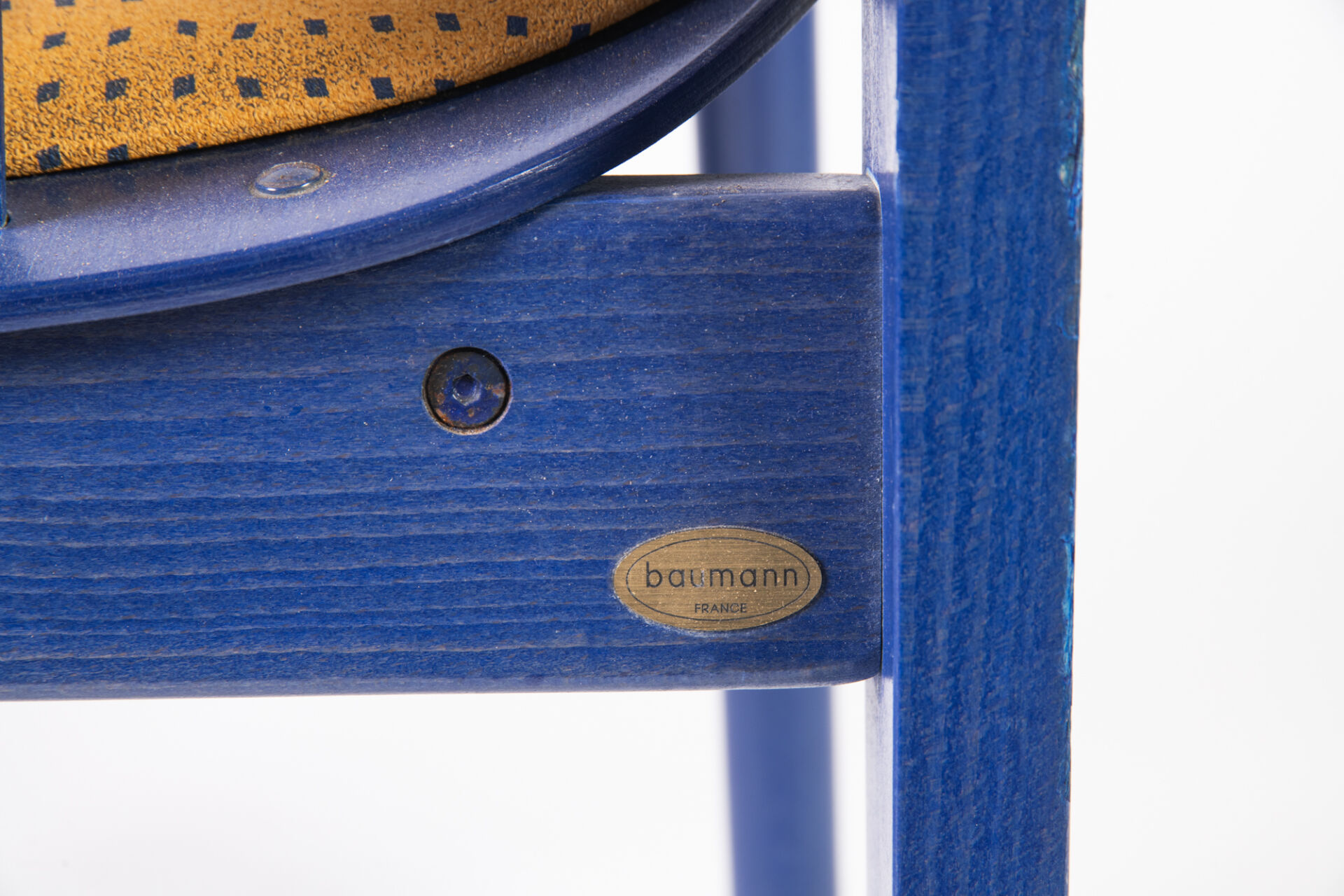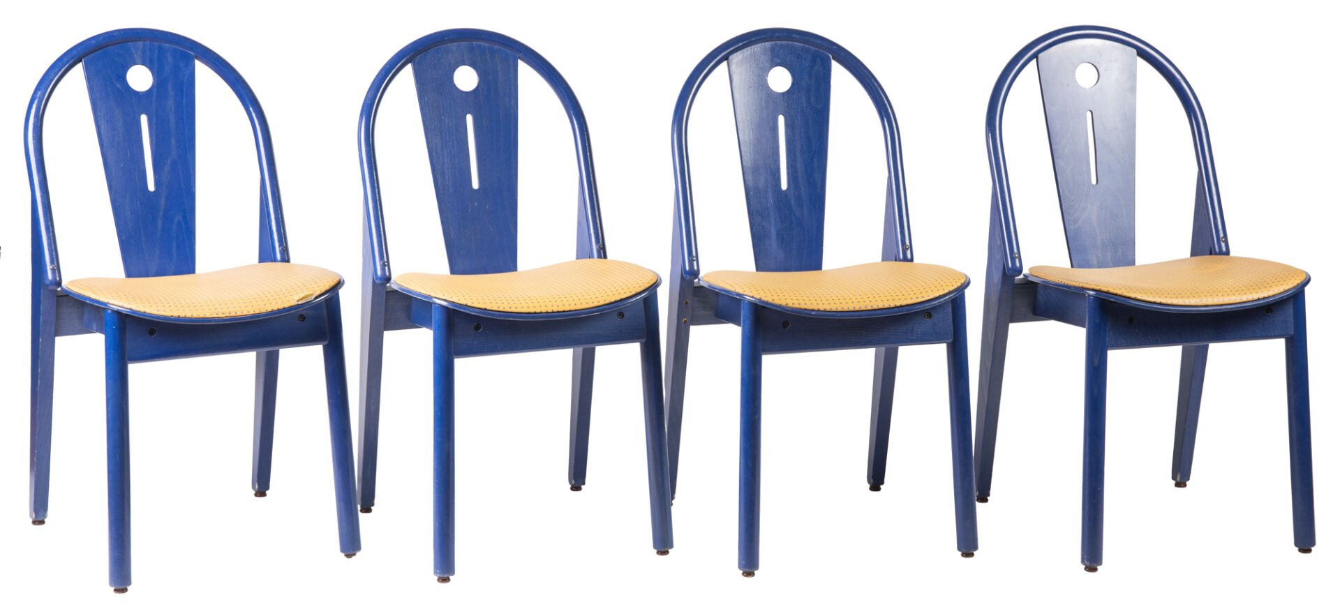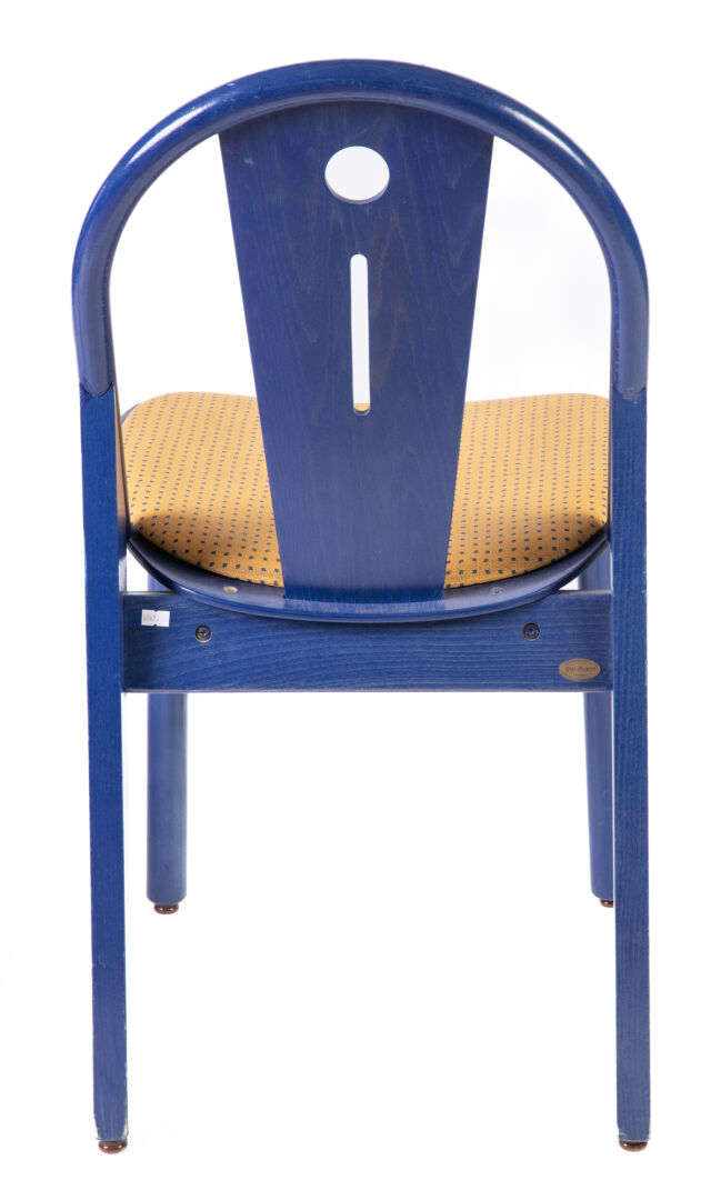Baumann. Suite de huit chaises en bois teint en bleu et assise en tissu. Portent plaque. H : 86 cm ; L : 43 cm ; l : 53 cm