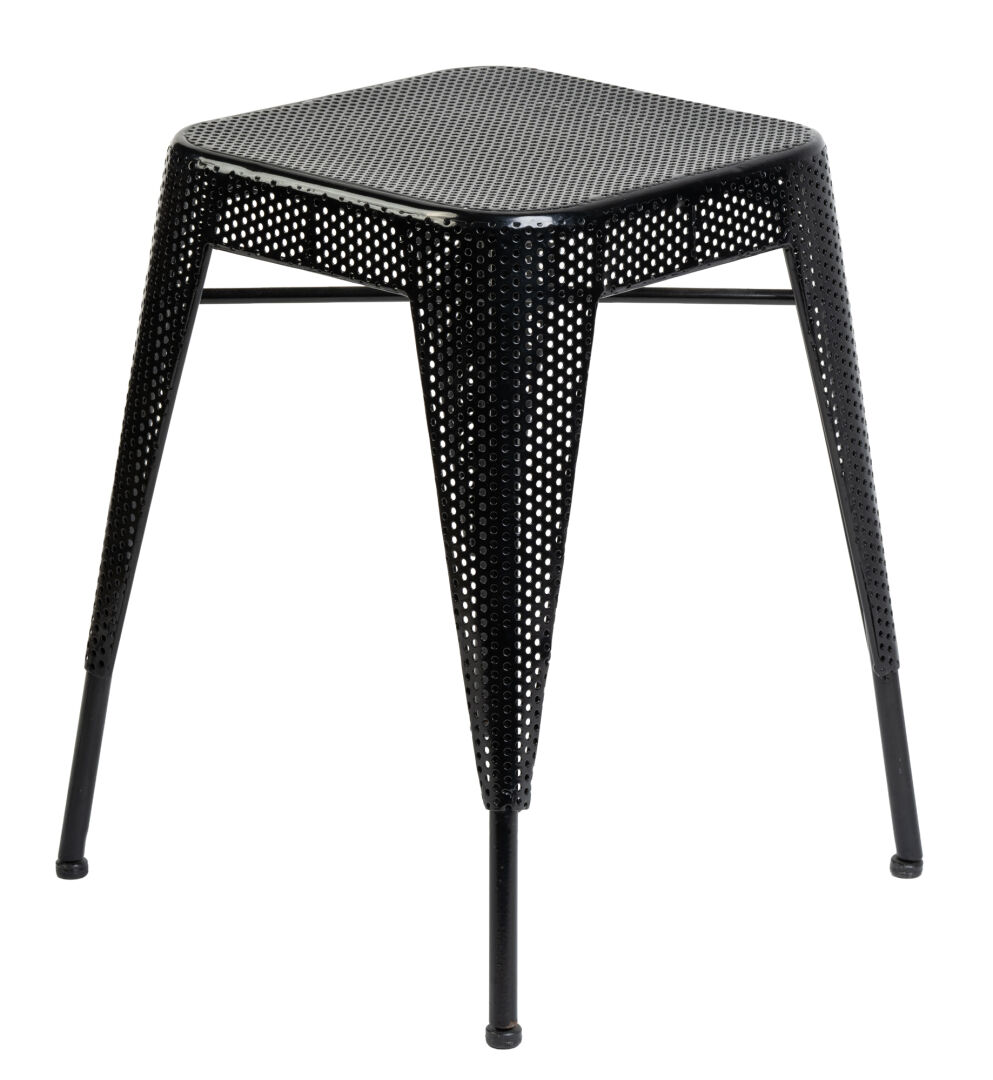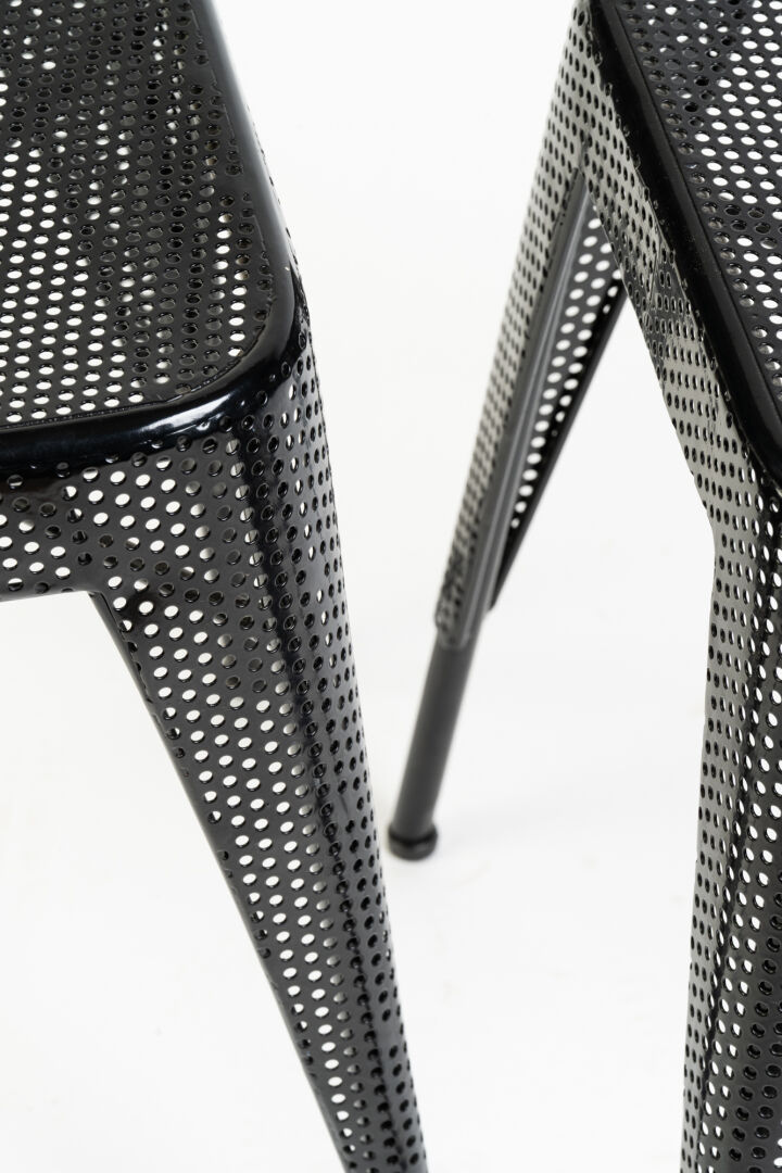 Tolix. Paire de tabourets en métal noir perforé. H : 47 cm ; L : 30 cm ; l : 30 cm