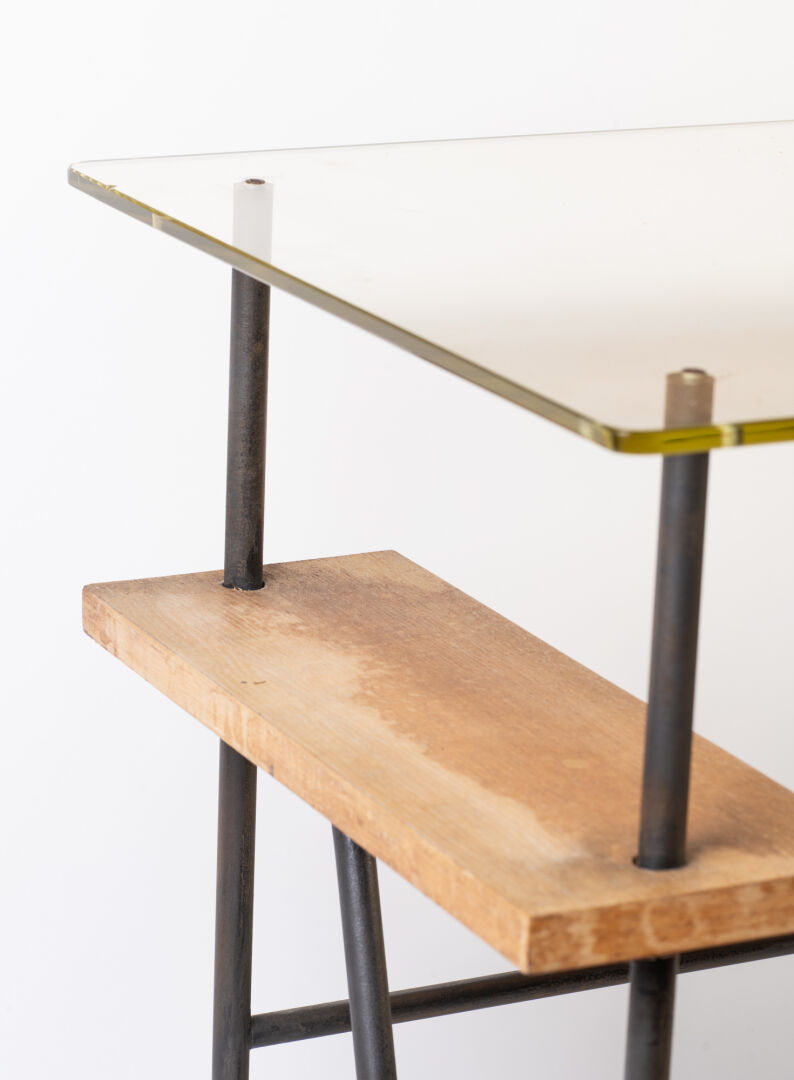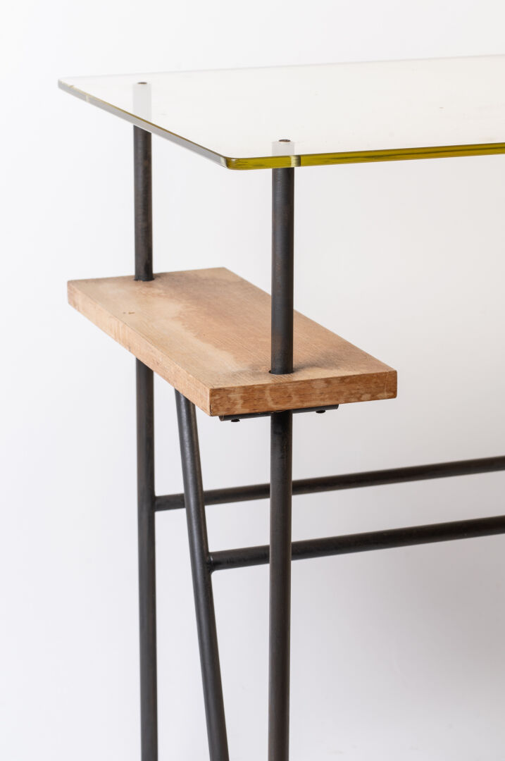 Attribué à Azzano Frères. Bureau dans le goût de Jacques HITIER, avec dessus en verre et caisson en bois suspendu, structure en métal tubulaire noir. Vers 1950-1960. Petit éclat sur le verre. H : 75 cm ; L : 108 cm l : 54 cm