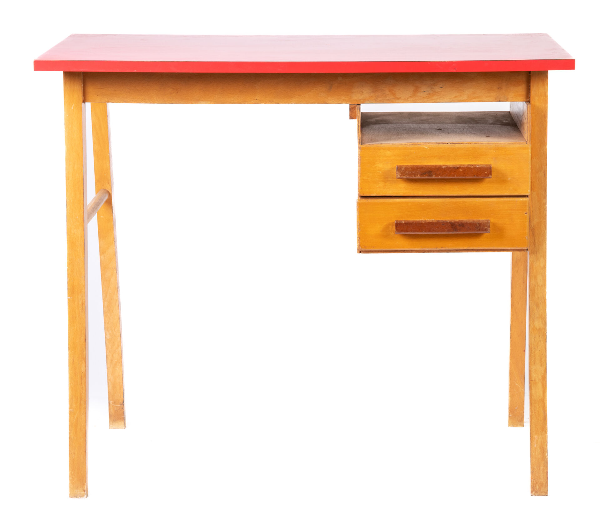 Bureau pour enfant en bois avec dessus formica rouge, ouvrant à deux tiroirs. Vers 1950-60. H : 72 cm ; L : 84,5 cm ; l : 50 cm