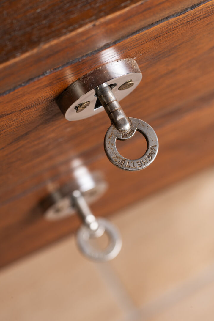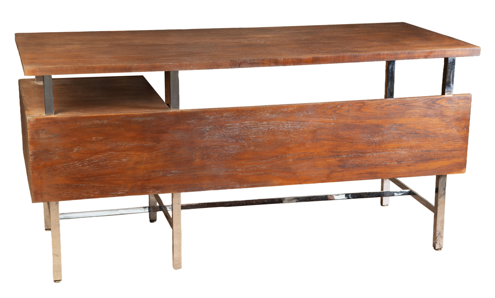 Dans le goût de Florence KNOLL ou Jules WABBES (1919-1974) pour Mobilier Universel. Bureau en bois et structure en métal chromé avec caisson suspendu. Vers 1960-1970. H : 79 cm ; L : 160 cm ; l : 70 cm