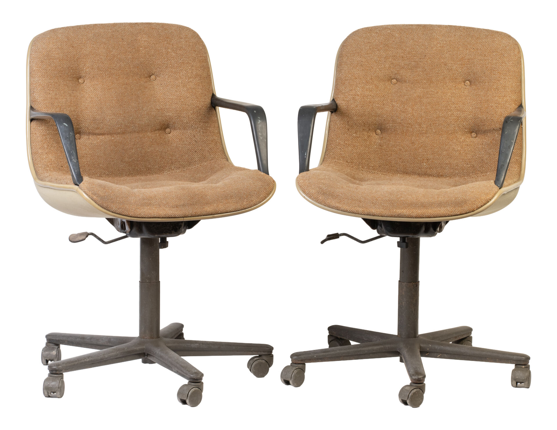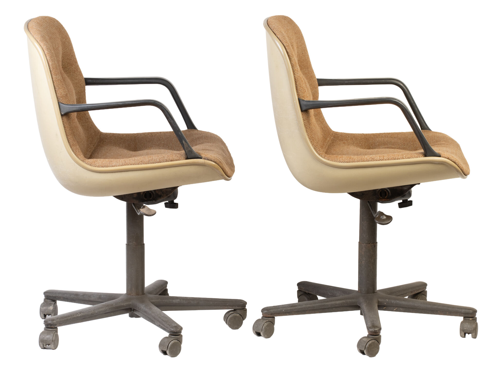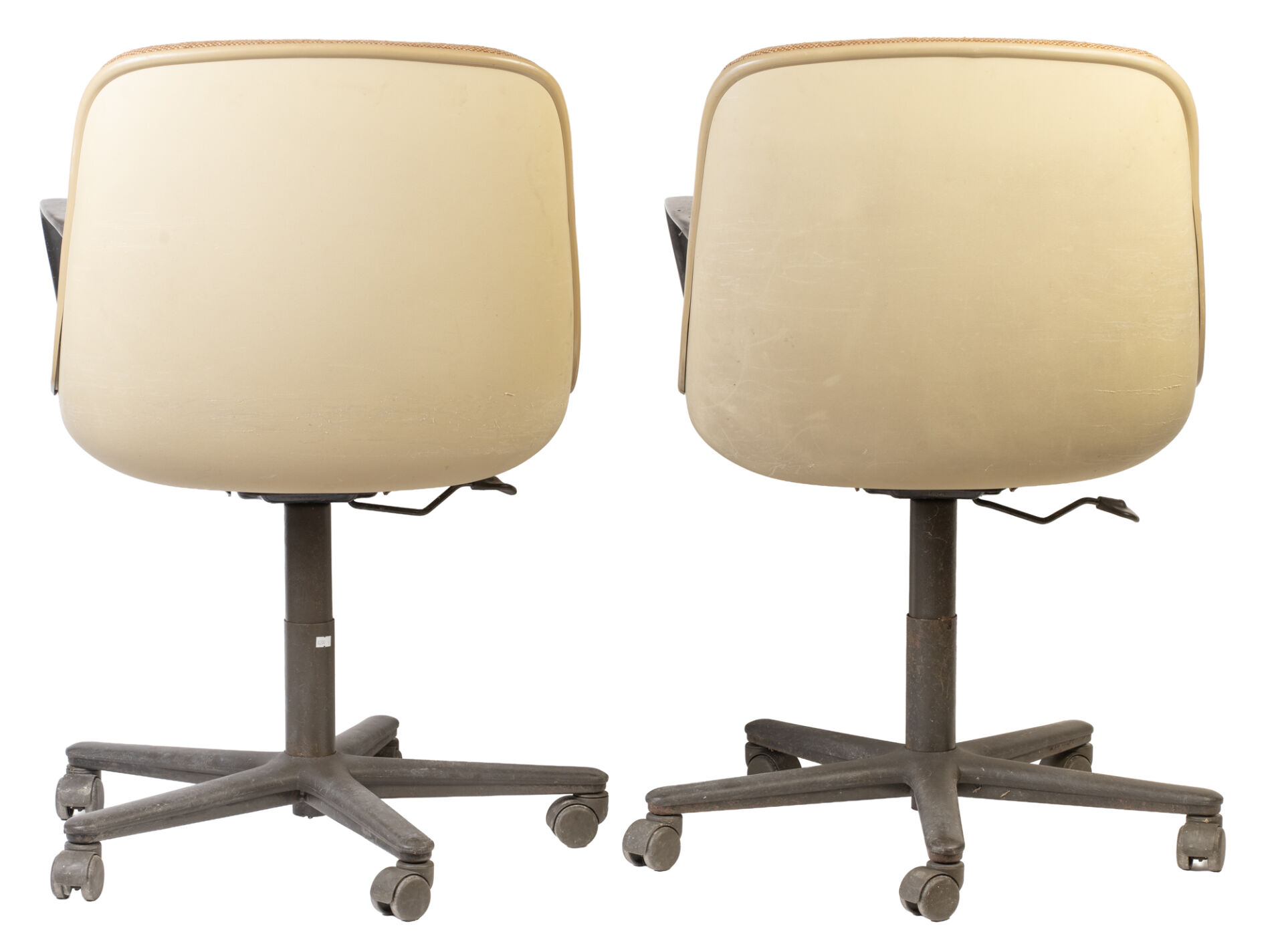 Randall BUCK pour Steelcase-Strafor. Paire de chaises de bureau pivotante. Coque beige et garniture en laine reposant sur un piètement en plastique à roulettes. Vers 1970-1980. H : 97 cm ; L : 57 cm ; l : 60 cm