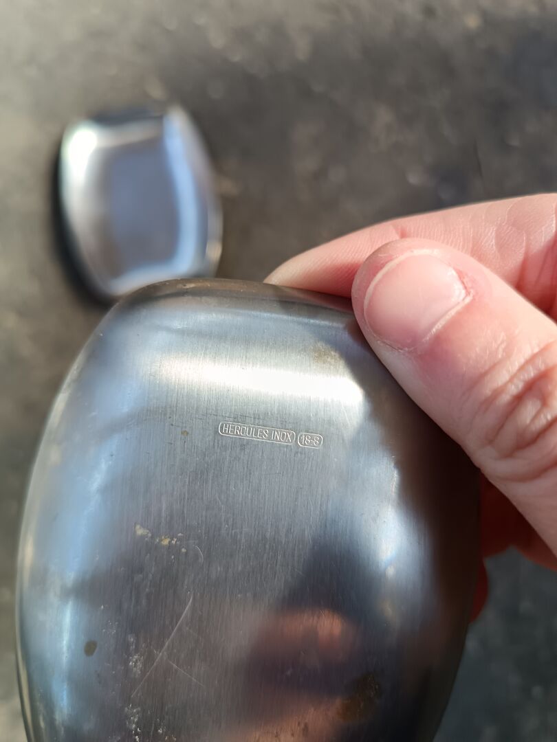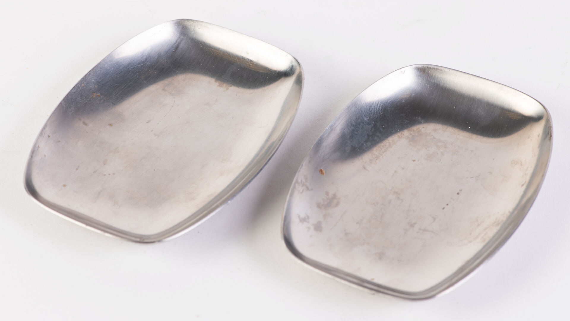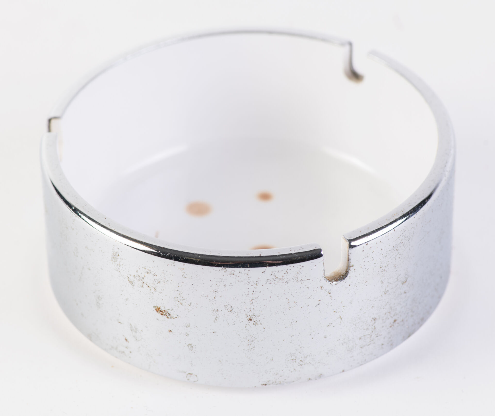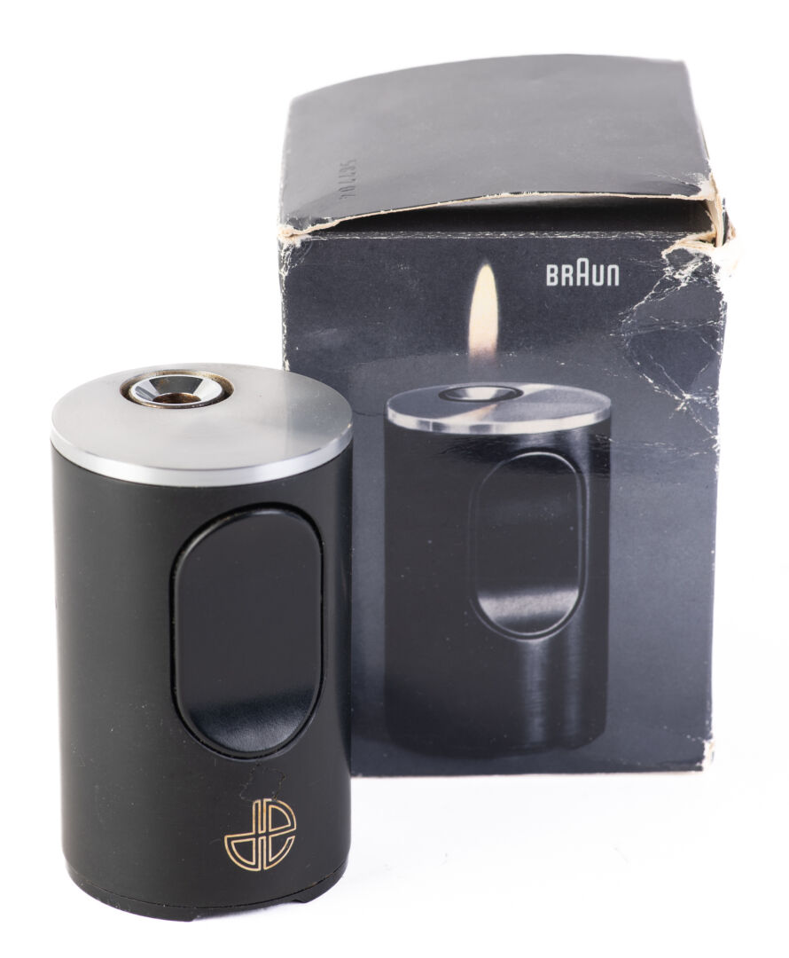Braun. Briquet de table On y joint un cendrier et deux coupelles en inox. H : 8,7 cm ; D : 5,4 cm (briquet) H : 4,5 cm ; D : 11 cm (cendrier) H : 1 cm ; L : 10 cm ; l : 7,2 cm (coupelles)