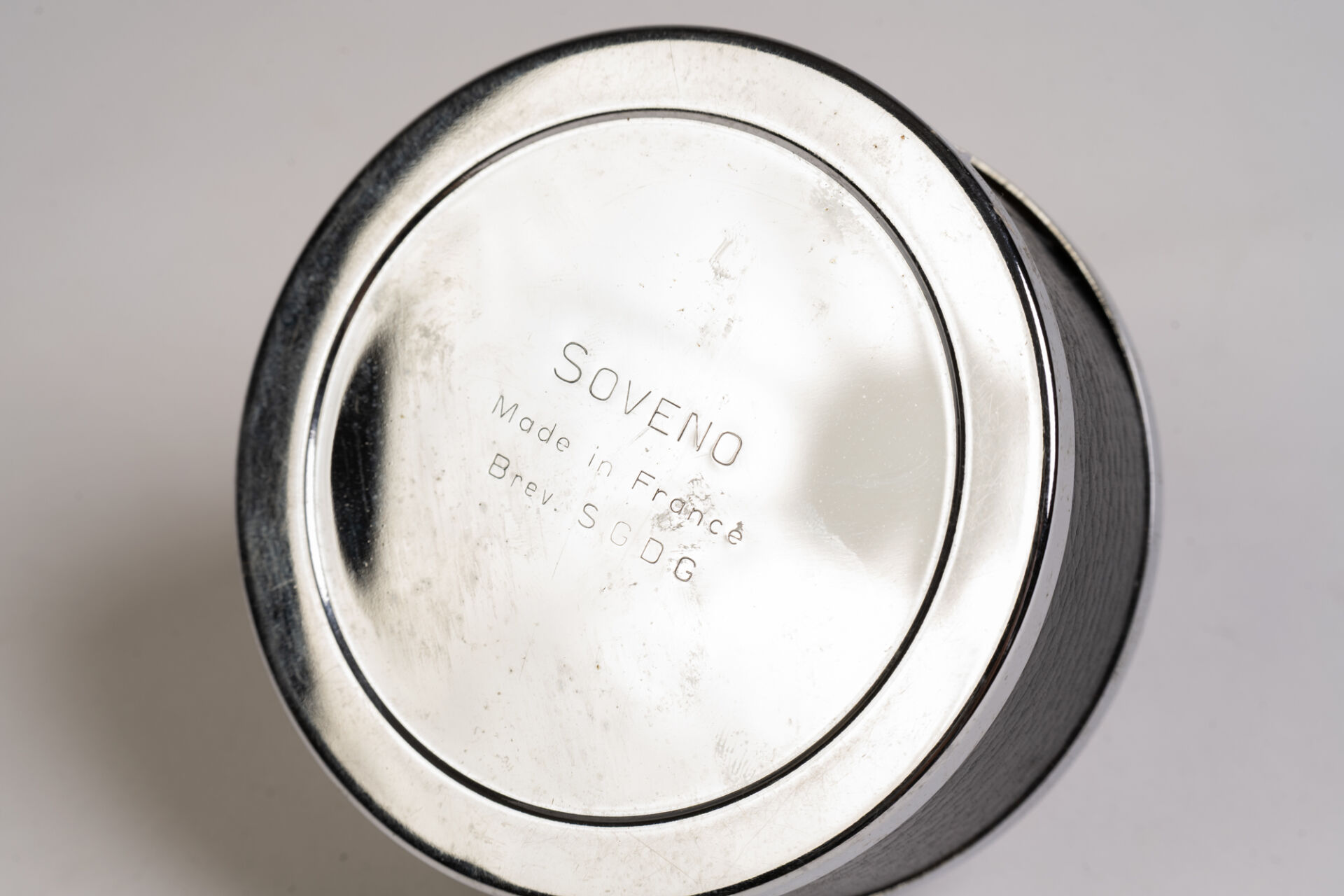 Soveno, France. Cendrier en métal chromé et similicuir noir. Vers 1970. H : 10 cm ; D : 10 cm