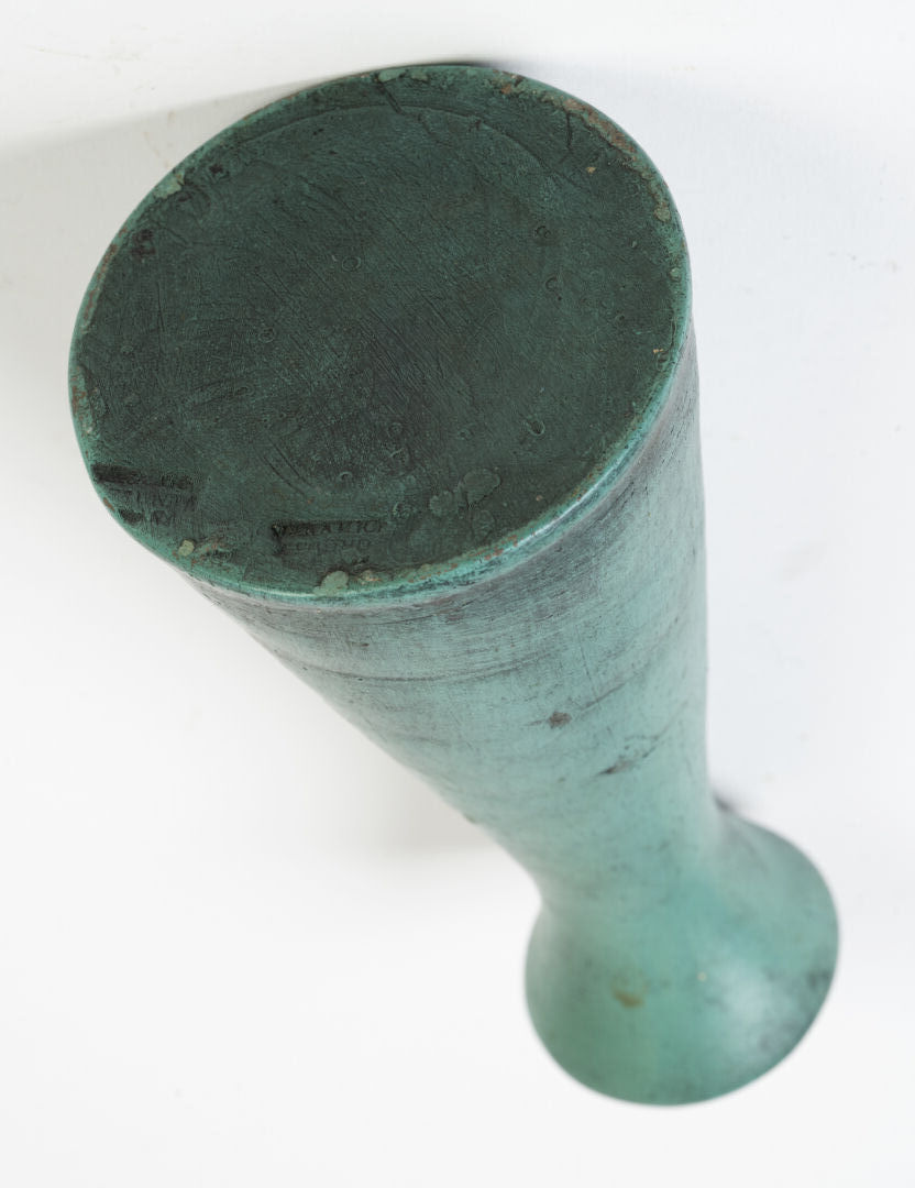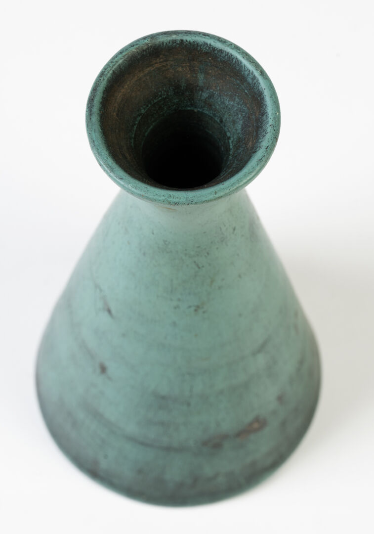 Vase en céramique émaillée bleue essuyée noire. Porte tampon illisible sous la base. H : 20 cm ; D : 10 cm