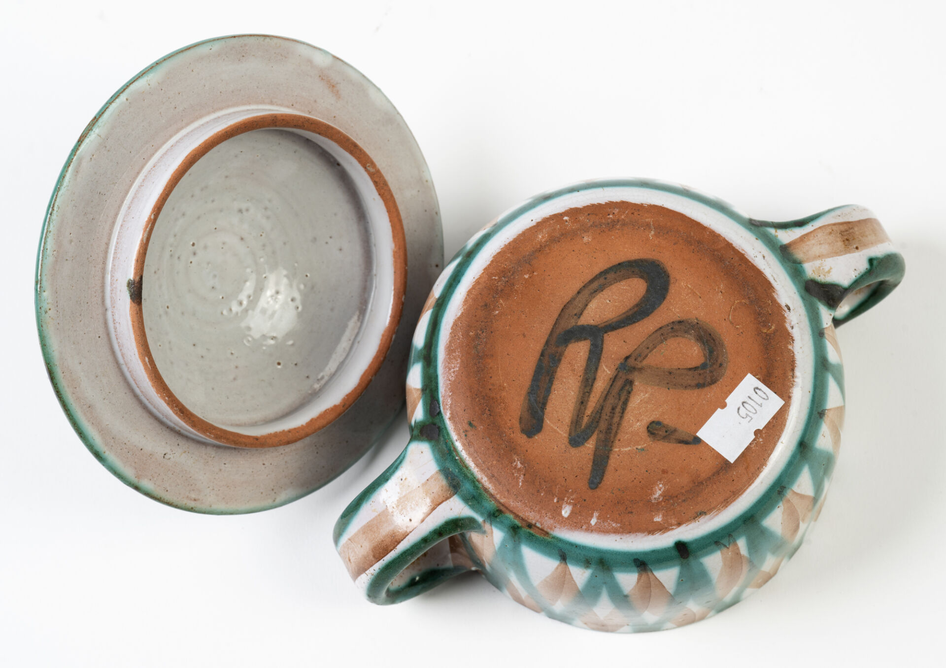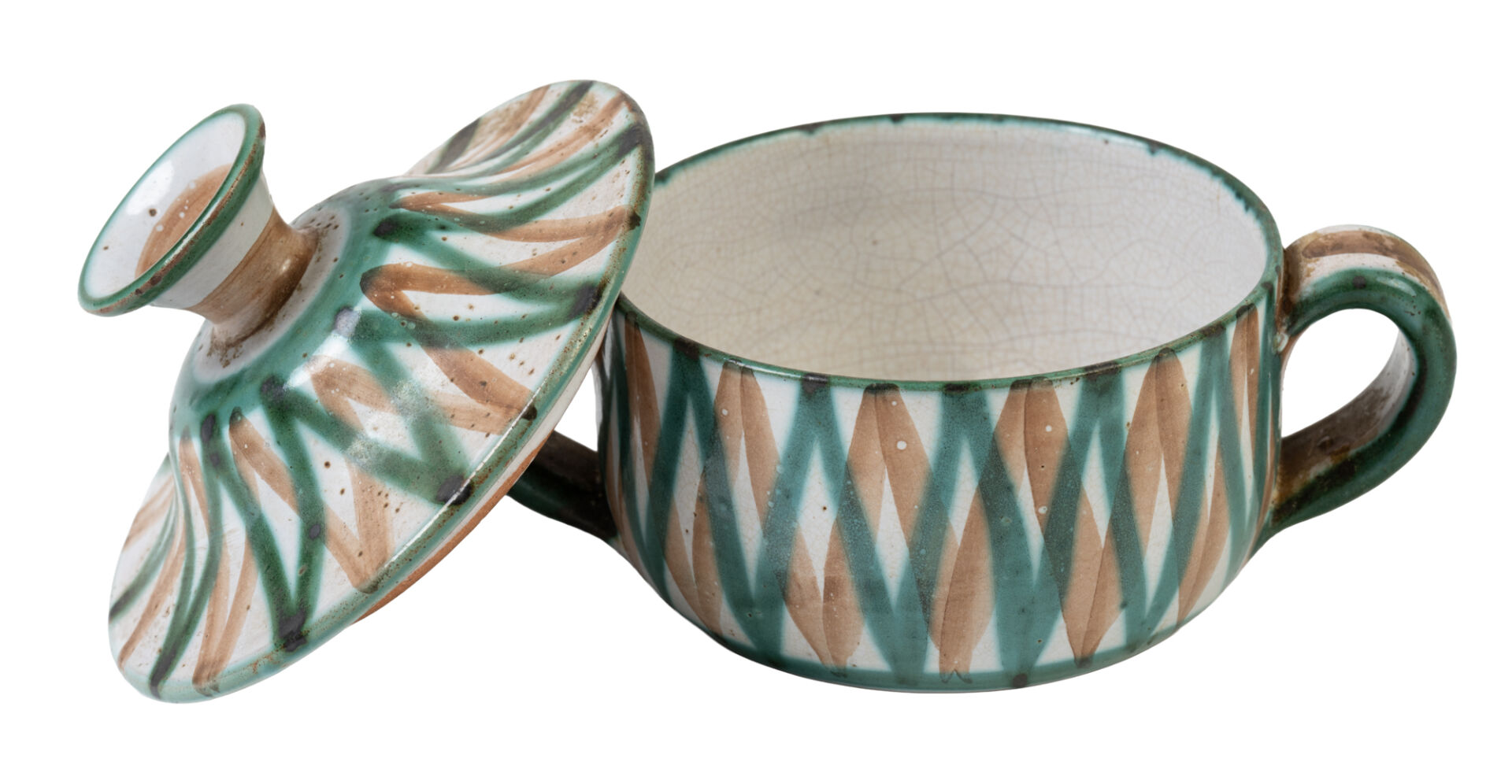 Robert PICAULT. Pot couvert en céramique émaillée blanche, verte et marron à décor géométrique. Monogrammée "RP" sous la base. H : 12 cm ; D : 18 cm (avec anses)