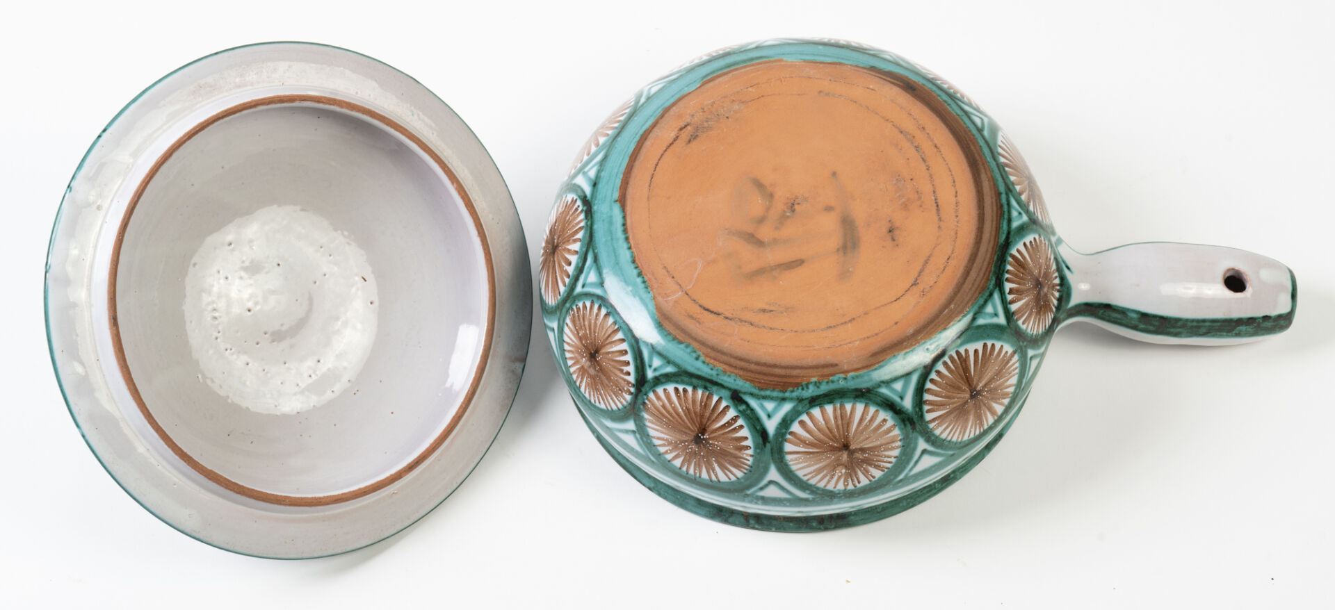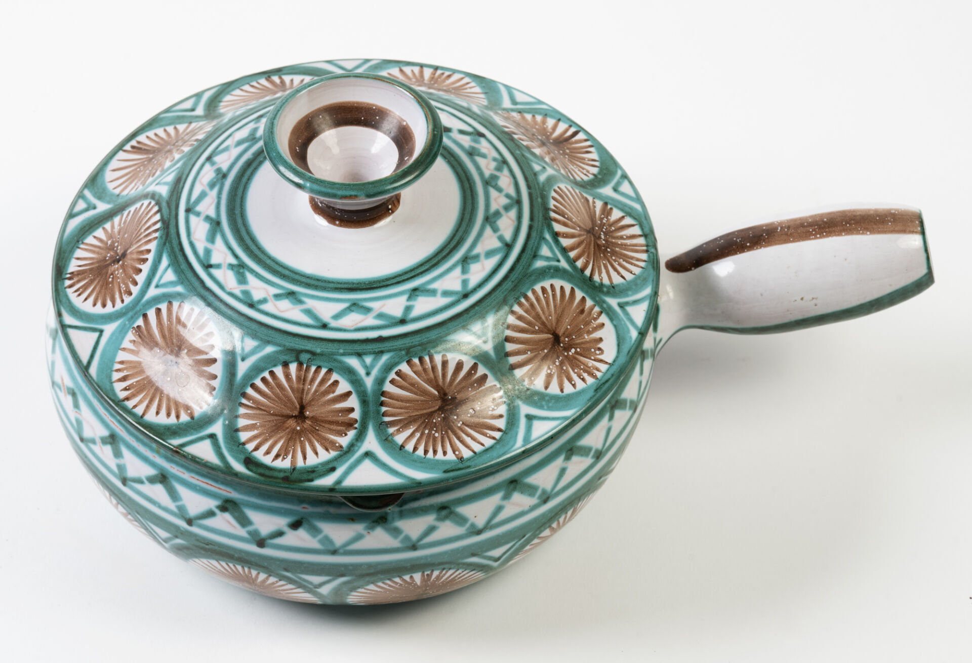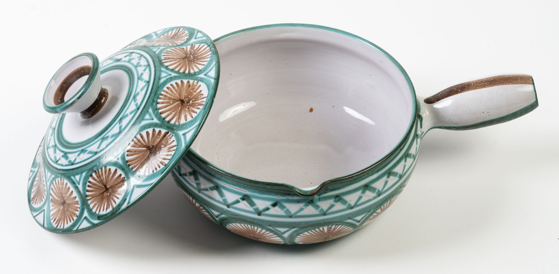 Robert PICAULT. Caquelon en céramique émaillée blanche, verte et marron à décor géométrique. Monogrammée "RP" sous la base. H : 17 cm ; D : 31 cm (avec anse)