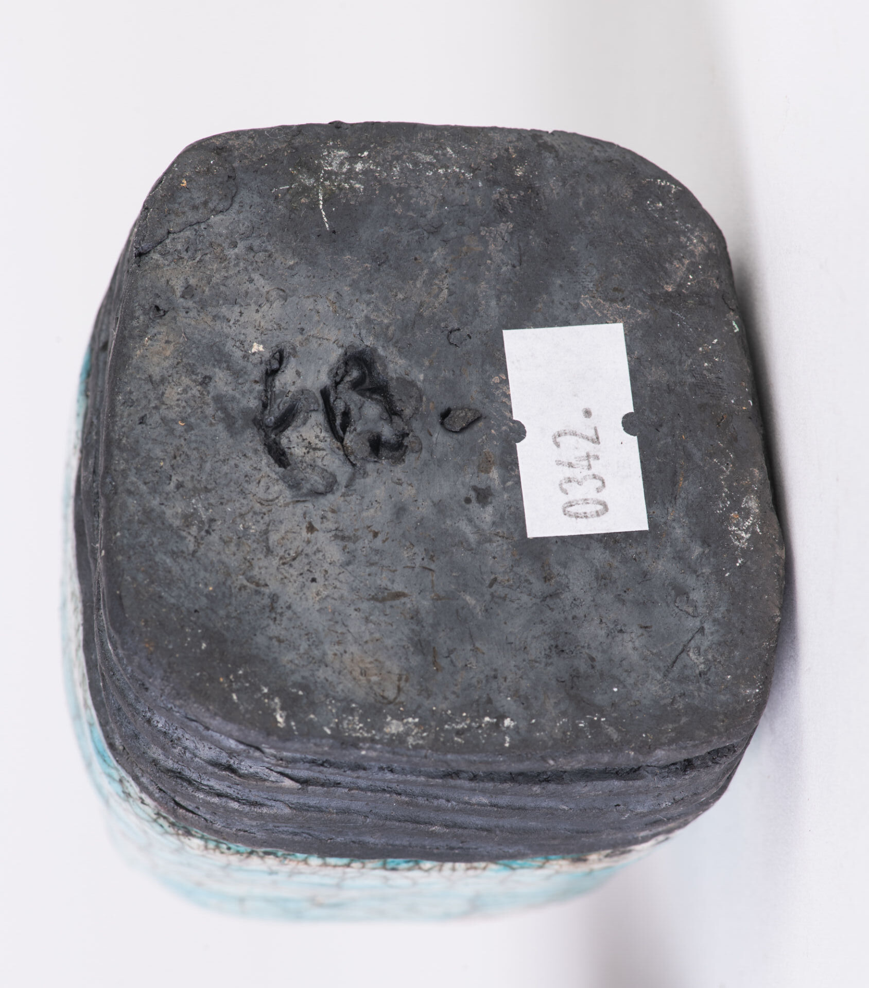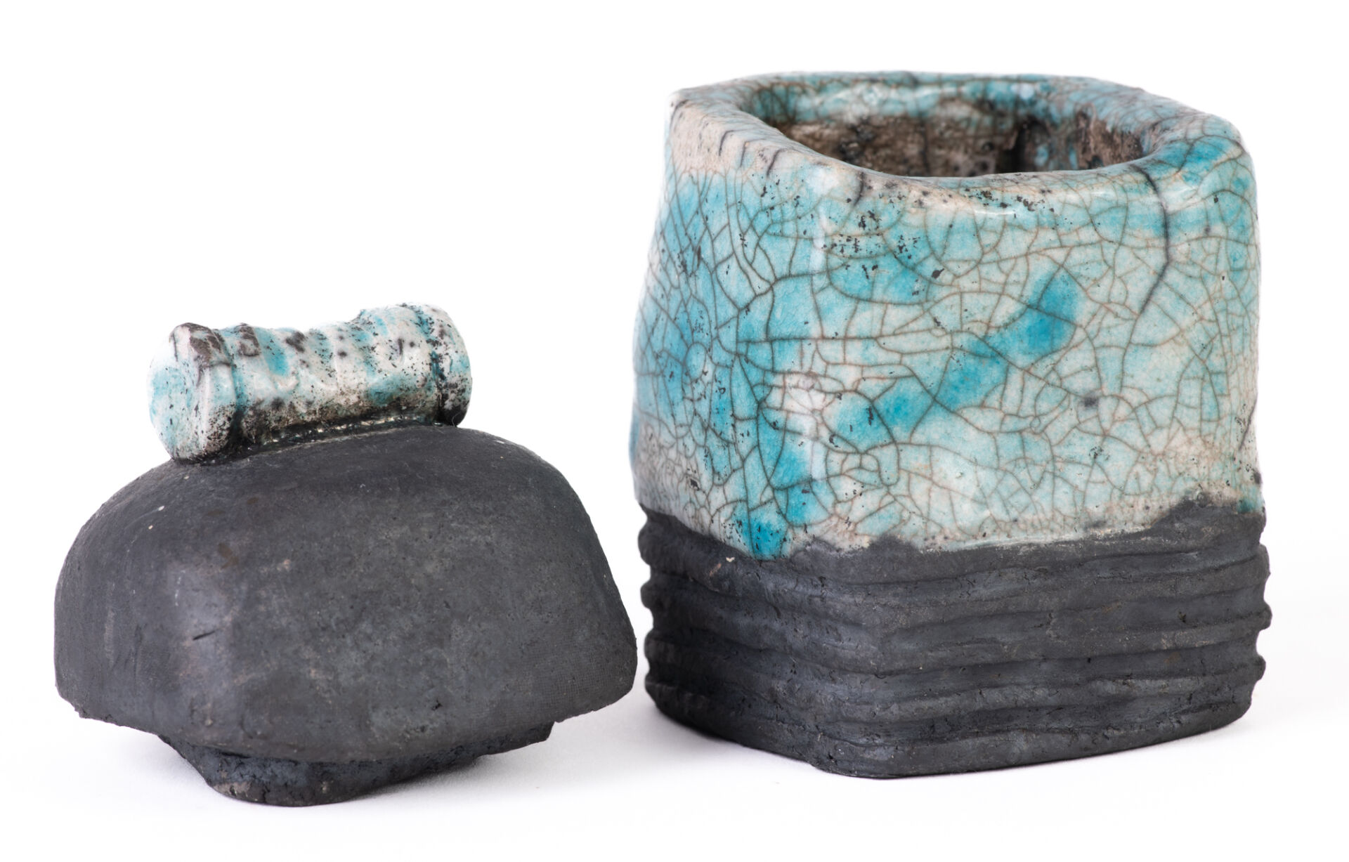 Pot couvert en céramique dite "raku". Monogrammé "F.R" sous la base. H : 12 cm ; L : 6,5 cm ; l : 6,5 cm