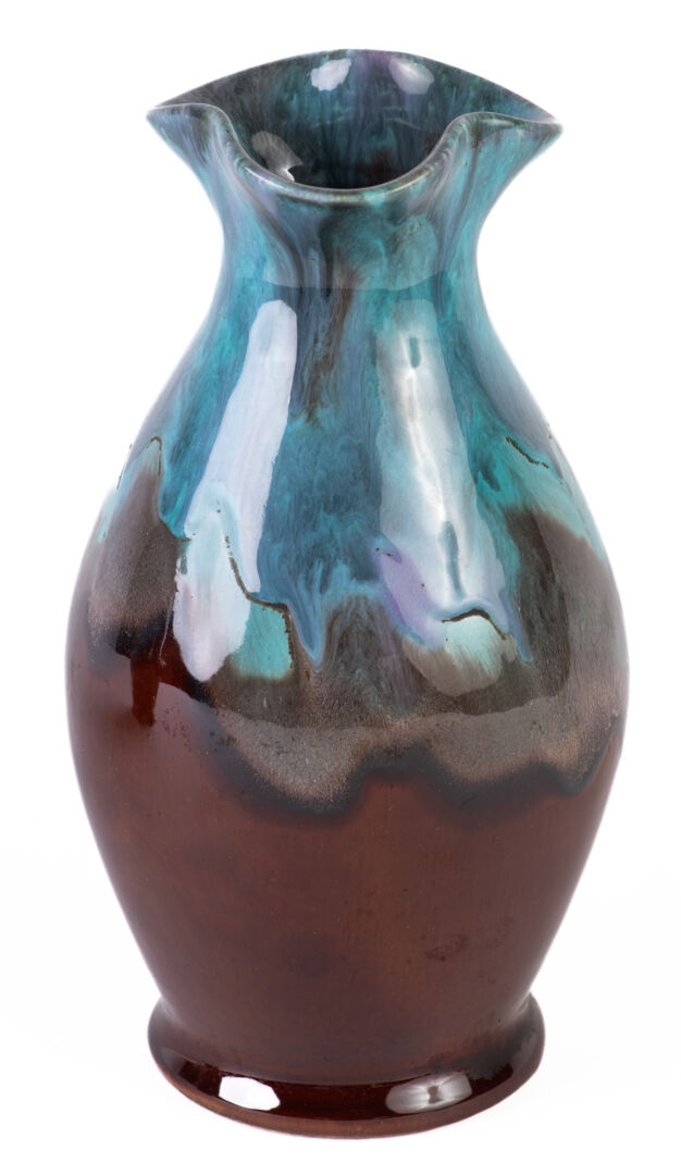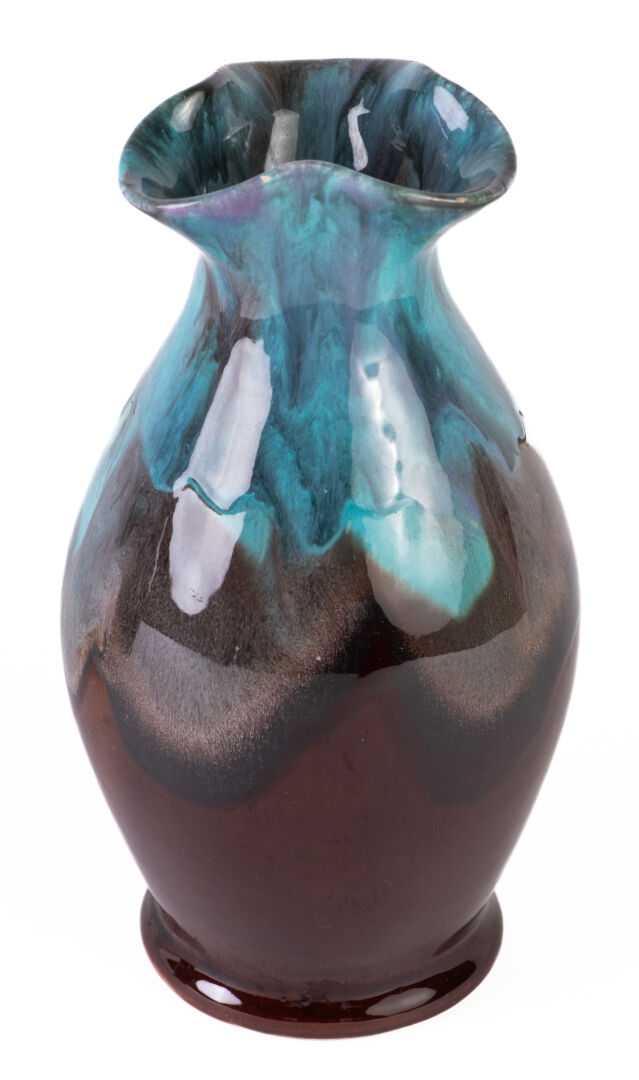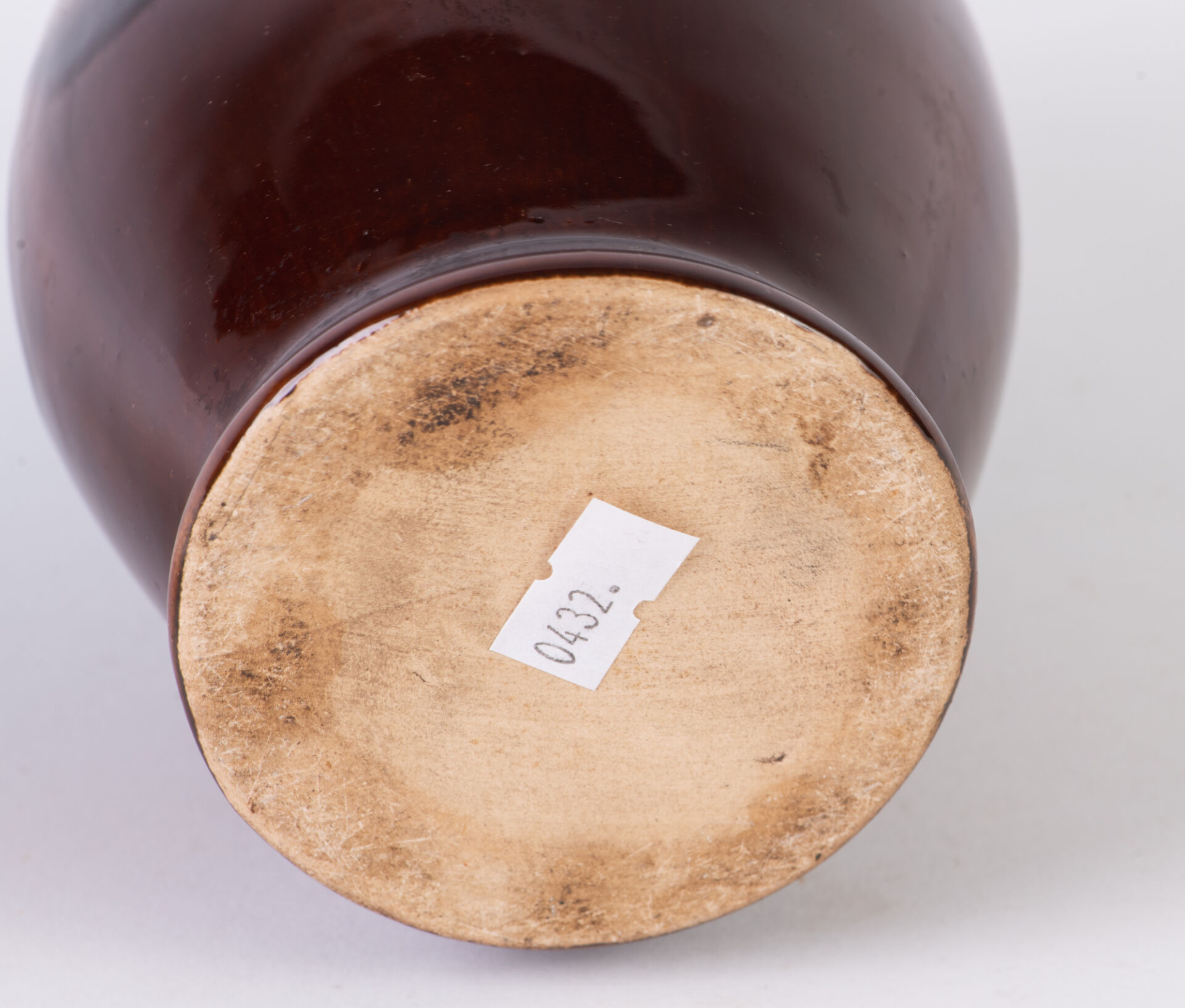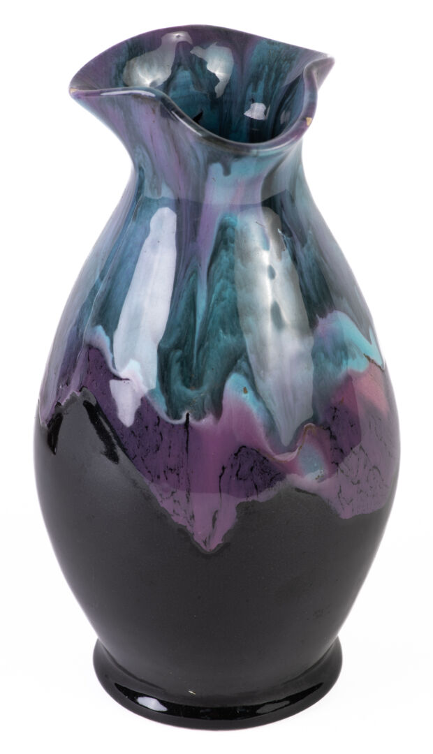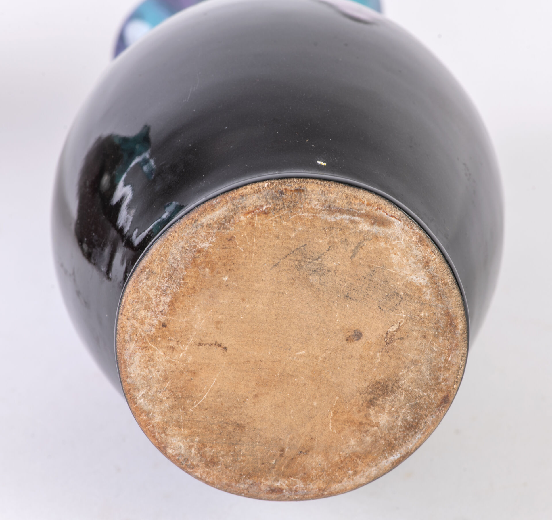 Deux vases en céramique émaillée noire, violette et bleue pour l'un, émaillée marron et bleue pour l'autre. H : 20 cm ; D : 7,4 cm H : 19,3 cm ; D : 7,6 cm