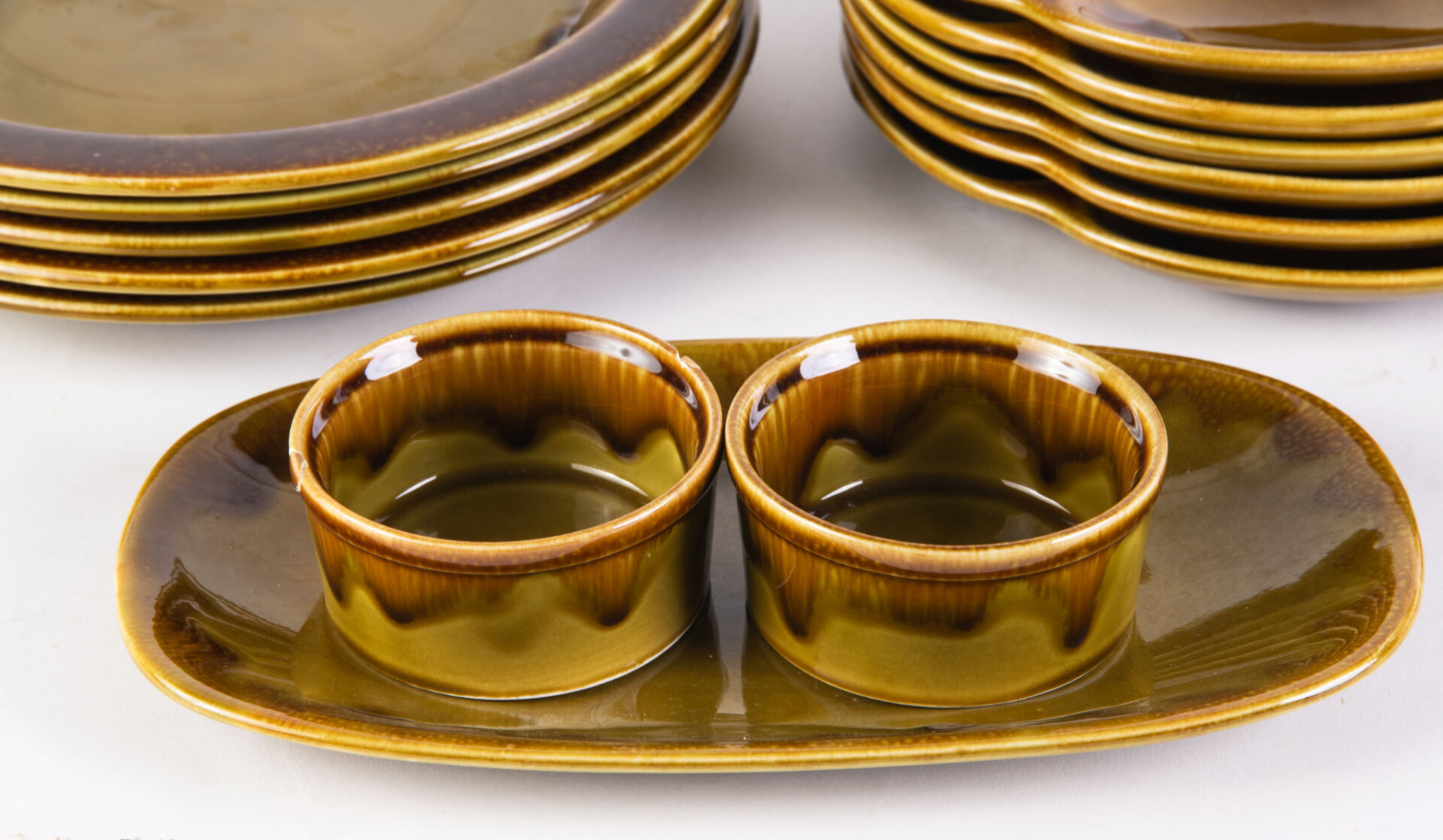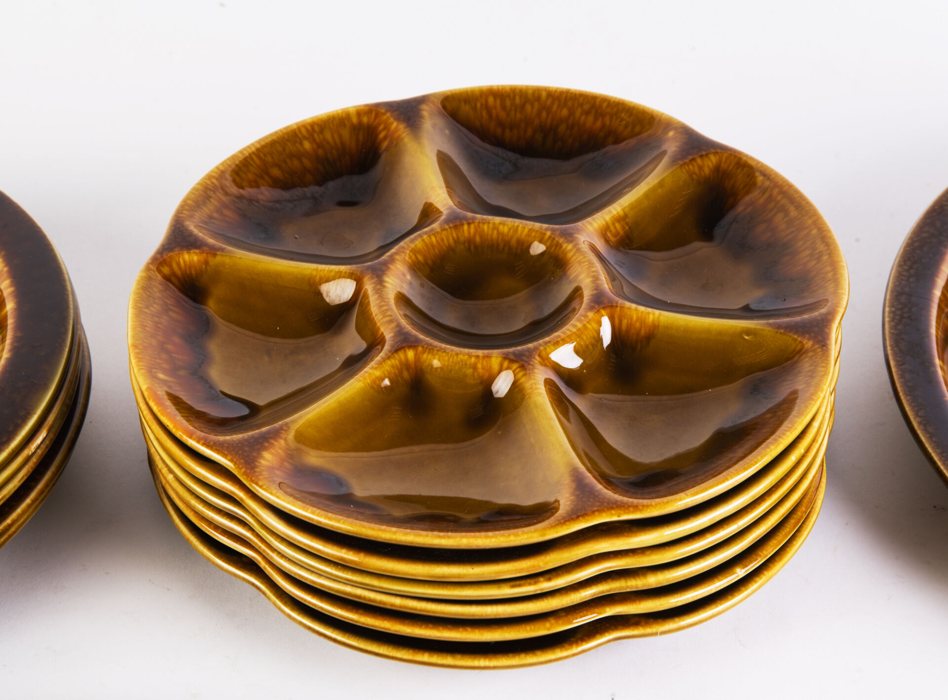 Gien, France. Service à fruits de mer en faïence émaillée marron. Porte tampon sous la base. Vers 1960-1970. D plat : 34,5 cm D assiettes : 25 cm D assiettes creuses : 25 cm