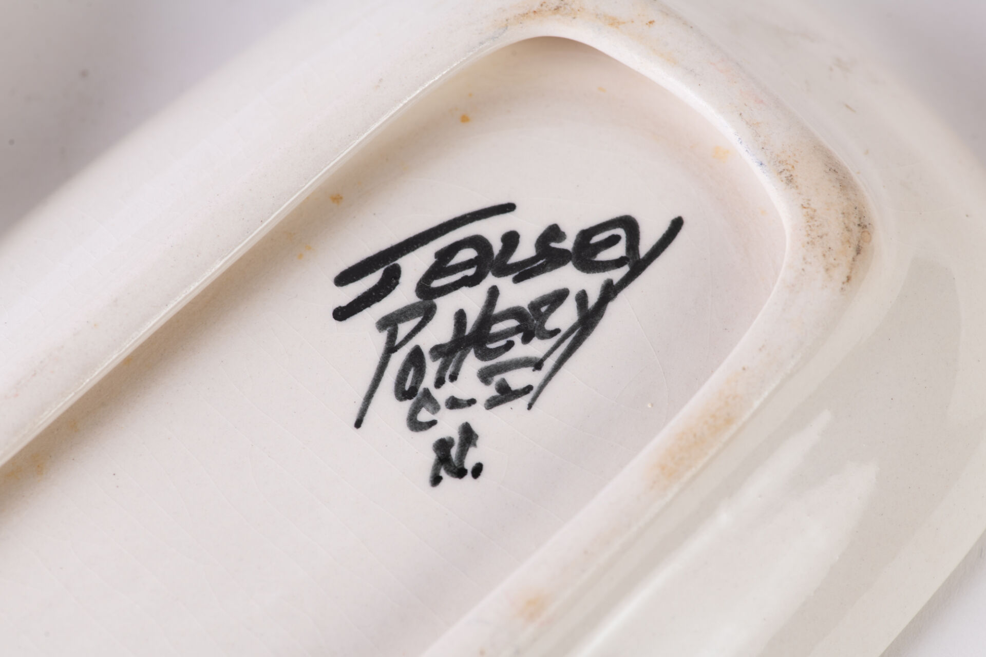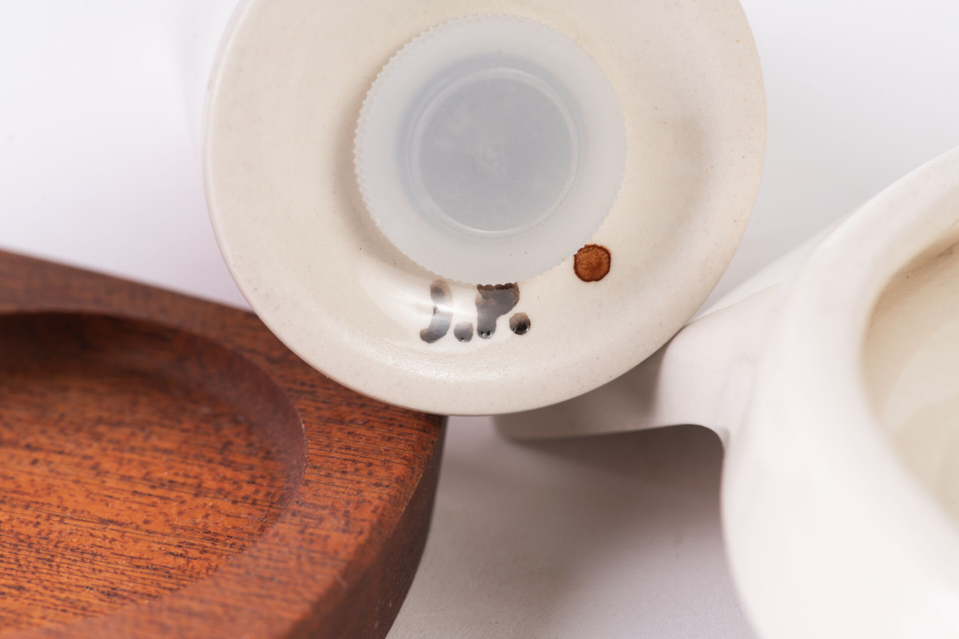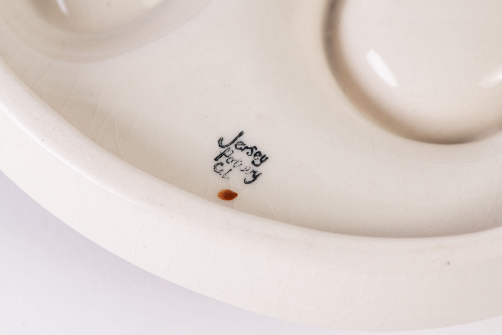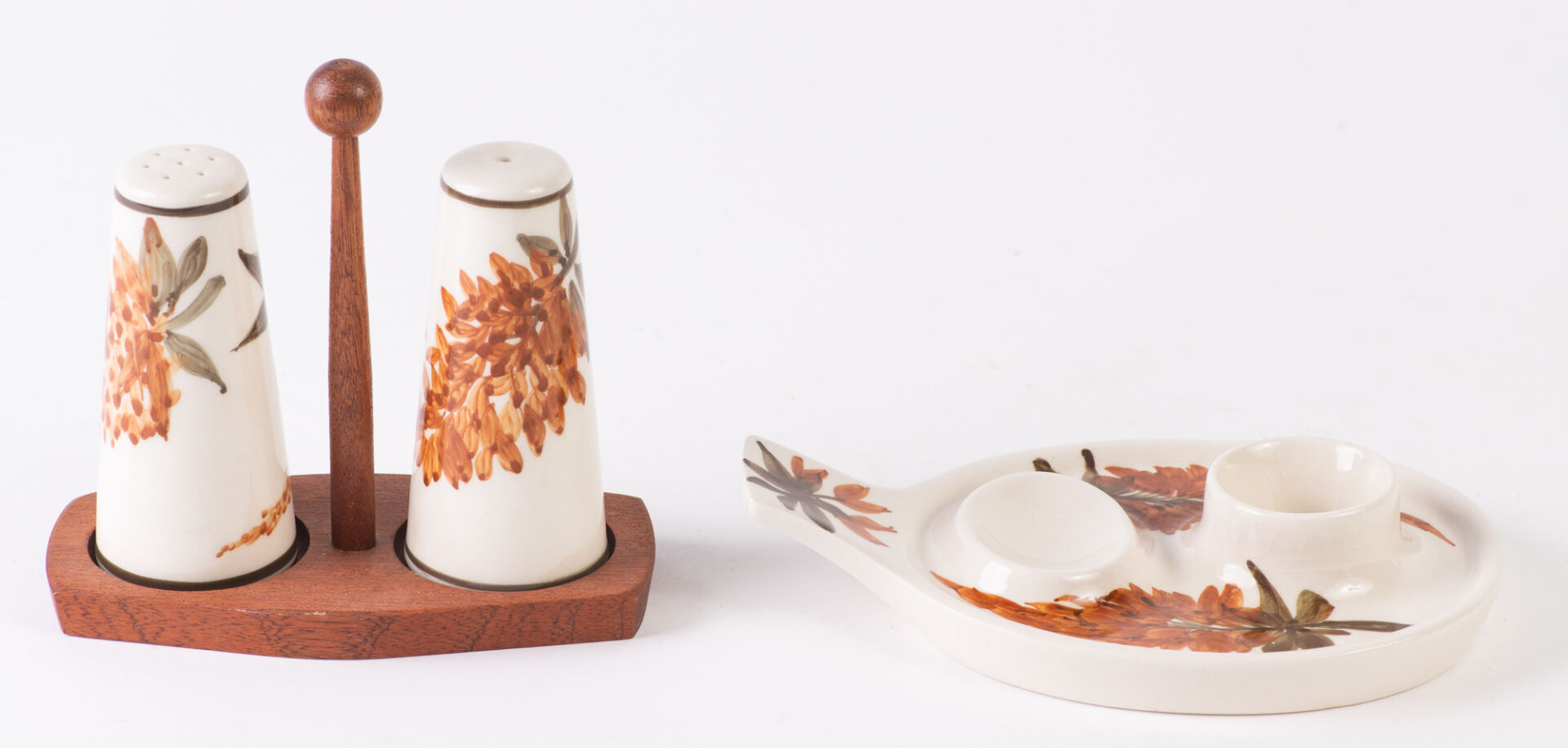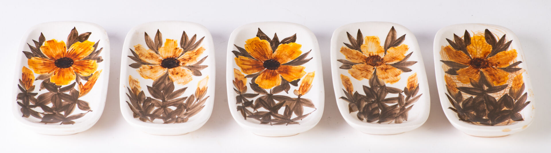 Poterie de Jersey. Suite de cinq petites coupes en céramique émaillée à décor floral. On y joint une salière - poivrière et un coquetier en céramique émaillée à décor floral. H : 12,6 cm ; L : 20,4 cm : l 10,5 cm (coupes) H : 14,5 cm (salière -poivrière)