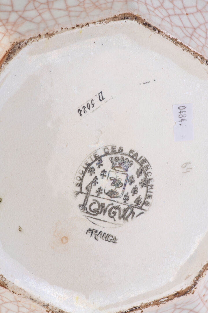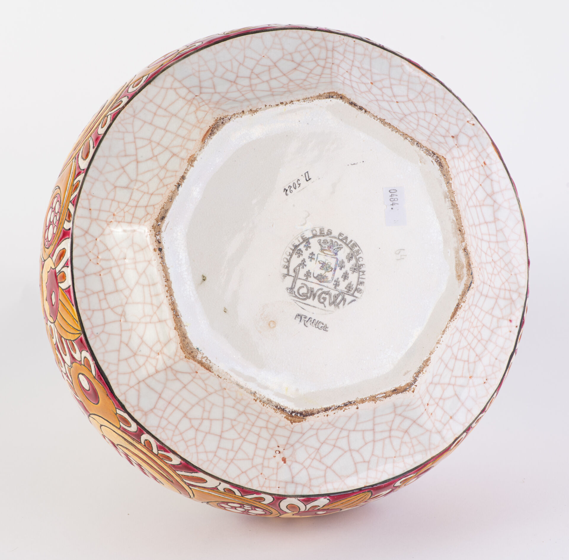 Longwy. Vase "toupie" en faïence émaillée et craquelée à décor floral dans le goût Art Déco. Porte le tampon "Société des faïenceries de Longwy" sous la base. H : 33 cm ; D base : 17 cm