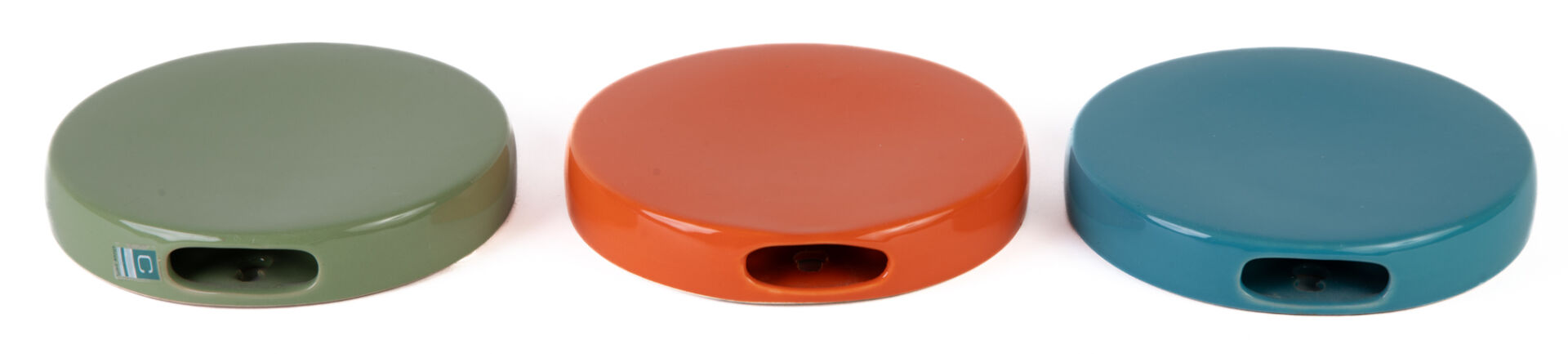 Trois vases muraux en céramique émaillée verte, orange et bleue. Portent l'étiquette "Chive.com". H : 3 cm ; D : 15,5 cm