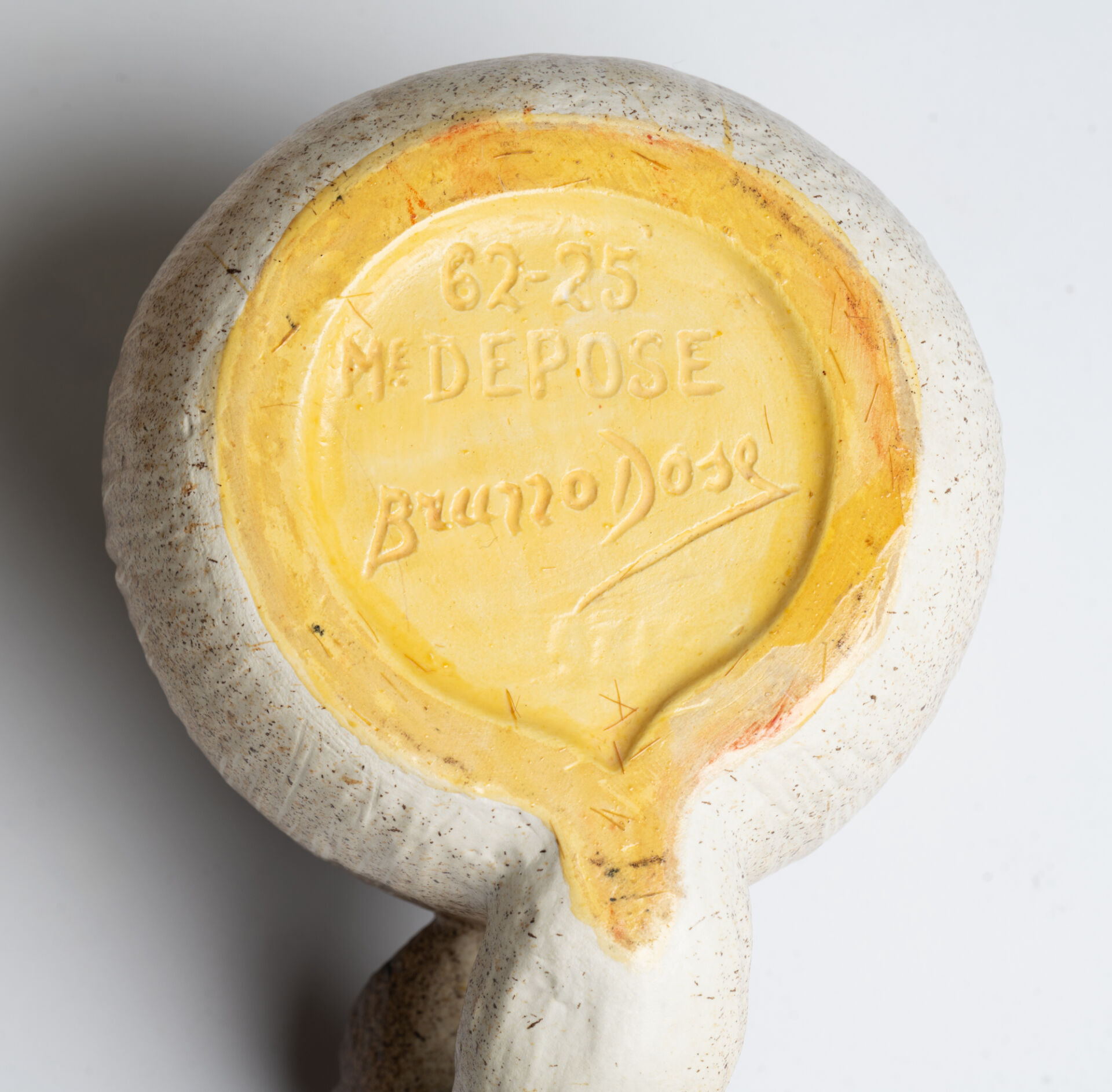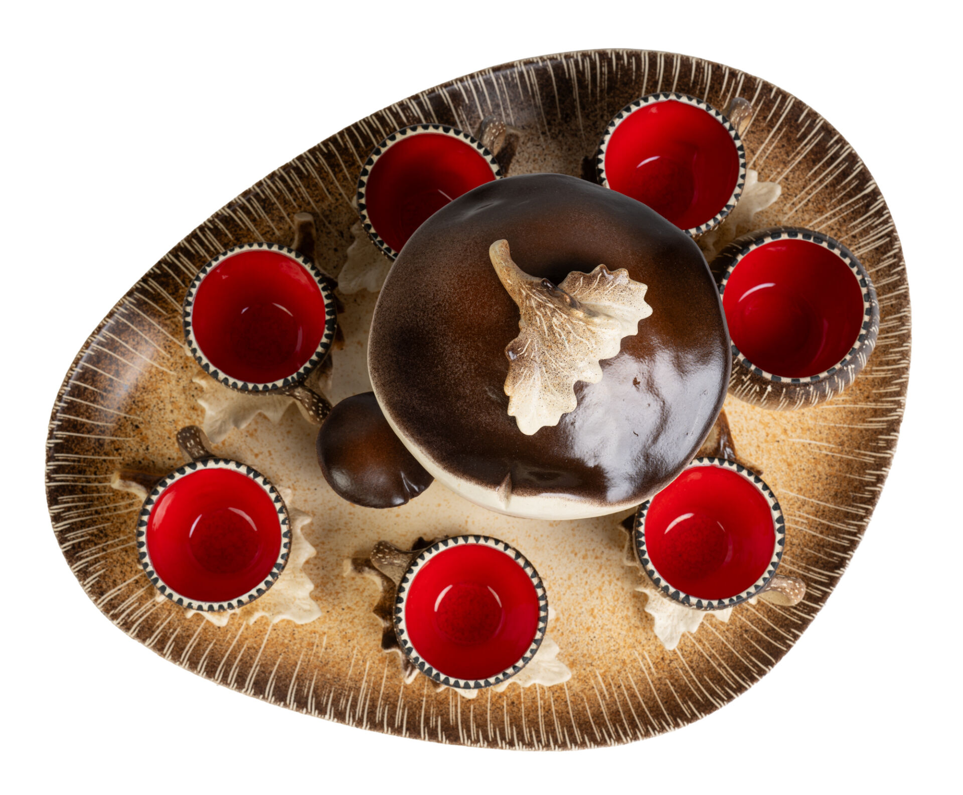 Bruno DOSE, Poterie du Breuil. Service en céramique émaillée modèle "Champignon" comprenant un sucrier, une cafetière, six tasses, six sous-tasses en forme de feuilles et un plateau. Vers 1970.