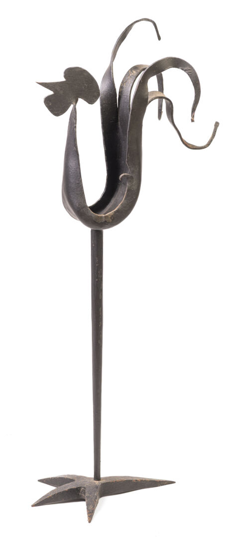 Les artisans de Marolles & de Loir et Cher sous la direction artistique de Jean TOURET (1916-2004), probablement réalisé par Francis DEWAELE (XXe), artisan ferronnier de Marolles dès 1959. Coq en fer forgé. Vers 1970. H : 78 cm ; L : 33 cm ; l : 17 cm. Bibliographie : Collectif, Jean Touret, Éditions de l'Amateur, Paris, 2022, variantes de notre modèle référencées sous le n° 103 et reproduites p. 117.