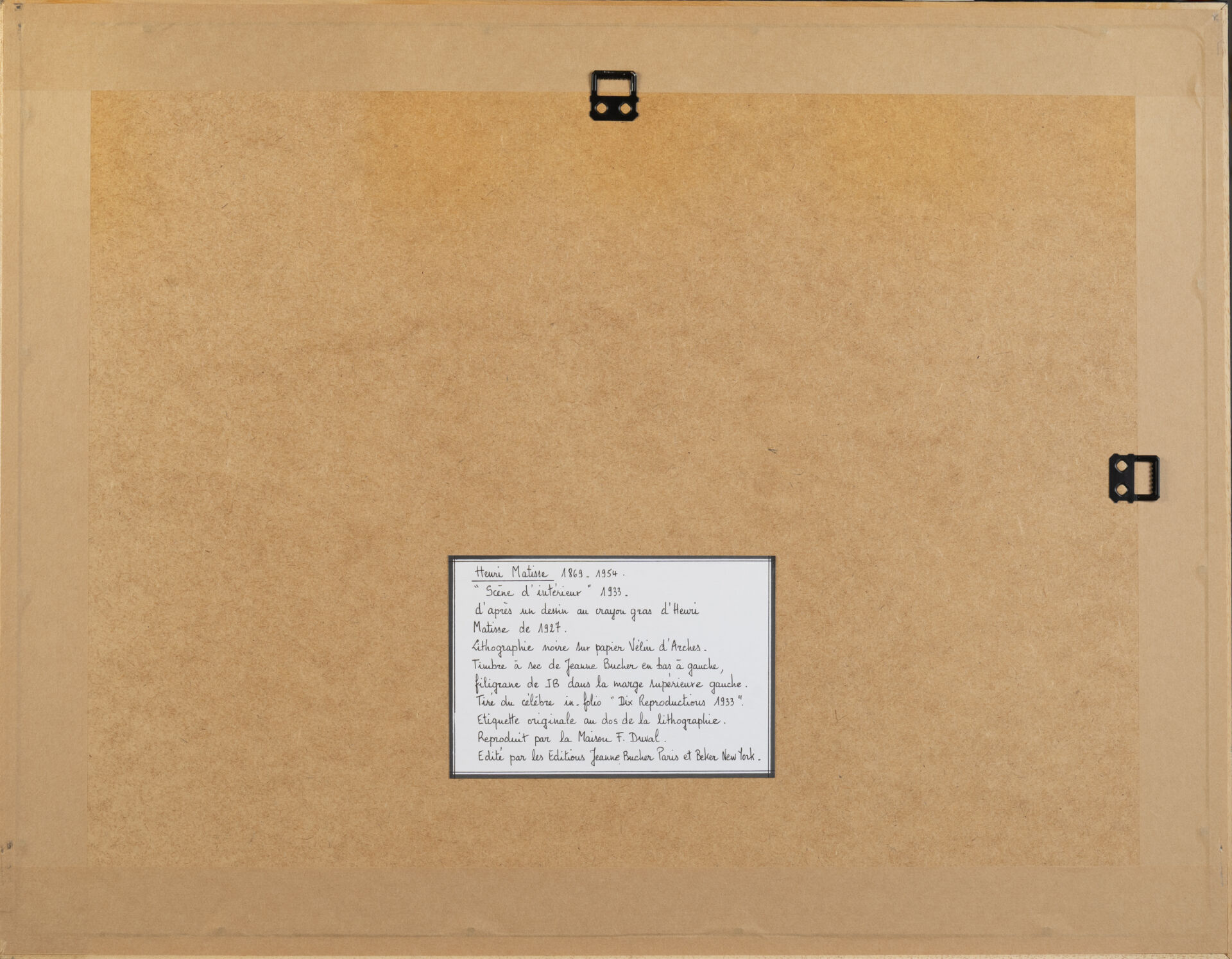 D'après Henri MATISSE (1869-1954). "Scène d'intérieur". Lithographie sur papier vélin Pochoir d'Arches portant "JB" en filigrane de la Galerie Jeanne BUCHER en bas à gauche, tiré de l'in-folio "Dix Reproductions 1933" édité par les Éditions Jeanne BUCHER (Paris) et John BECKER (New-York). 38 x 55,5 cm à vue
