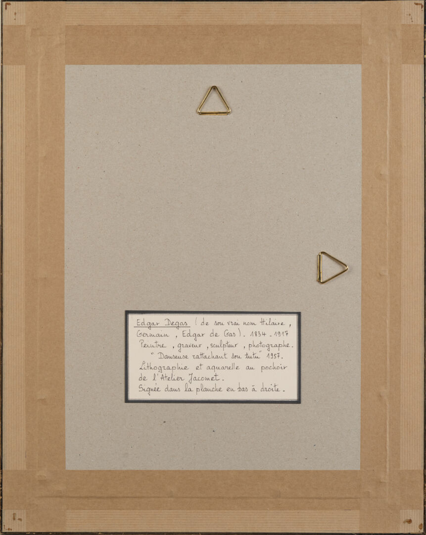 D'après Edgar DEGAS (1834-1917). "Danseuse rattachant son tutu, vers 1896-1899". Procédé Jacomet édité en 1957 et limité à 600 exemplaires non numérotés. 31 x 23 cm