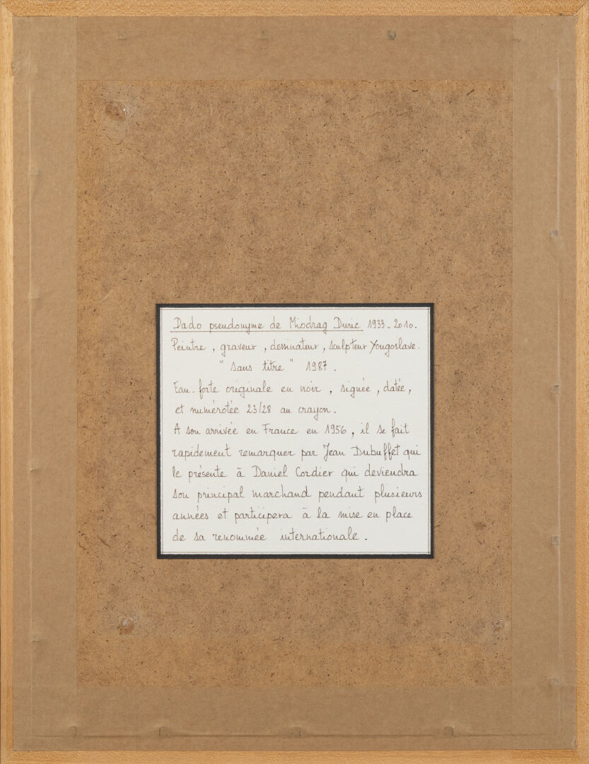 D'après Miodrag DURIC (1933-2010) dit DADO. "Sans titre". Eau-forte originale en noir sur papier signée, datée et numérotée "23/28" au crayon. A son arrivée en France en 1956, DADO se fait rapidement remarquer par Jean DUBUFFFET qui le présente à Daniel CORDIER. Ce dernier deviendra son principal marchand pendant plusieurs années et participera à la mise en place de sa renommée internationale. 23 x 15 cm à vue