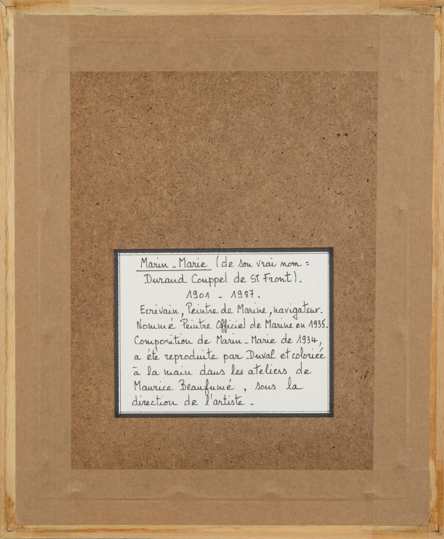 D'après Marin Marie (1901-1987). "Les dauphins". Reproduction sur papier par Moudebaigt et colorée à la main dans les ateliers Beaufumé. 19 x 15 cm.