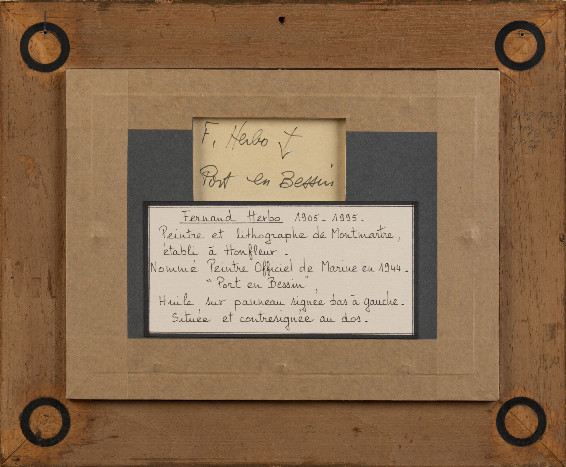 Fernand HERBO (1905-1995), peintre de la marine. "Port en Bessin". Huile sur toile signée en bas à gauche. On y joint une carte de voeux. 19,5 x 25,5 cm