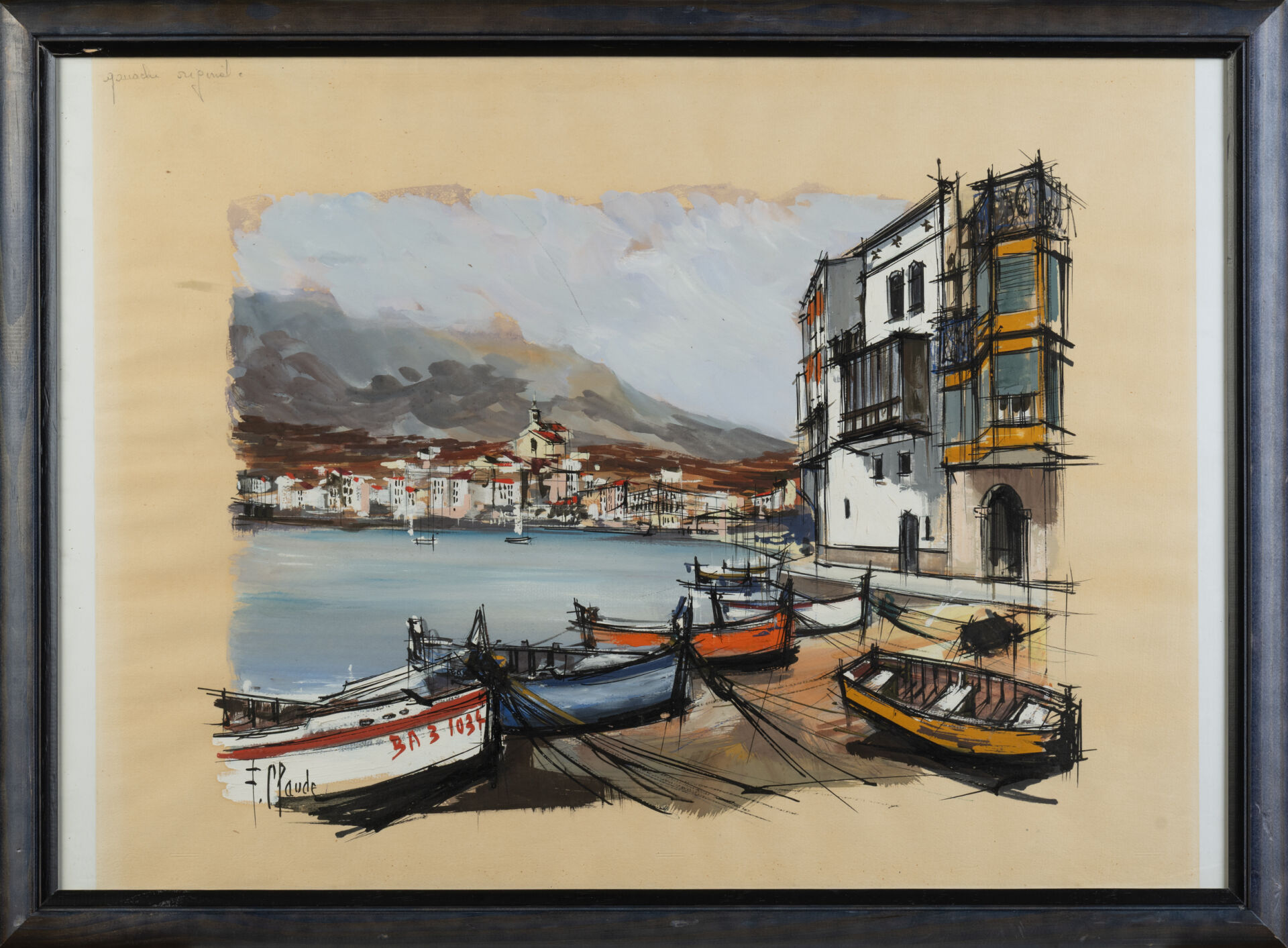 Claude FAUCHERE (1936-2019), peintre de la marine. "Notre Dame de Paris" et "Port du Sud". Deux gouaches sur papier signées "F. Claude" en bas à gauche. 64 x 52 cm