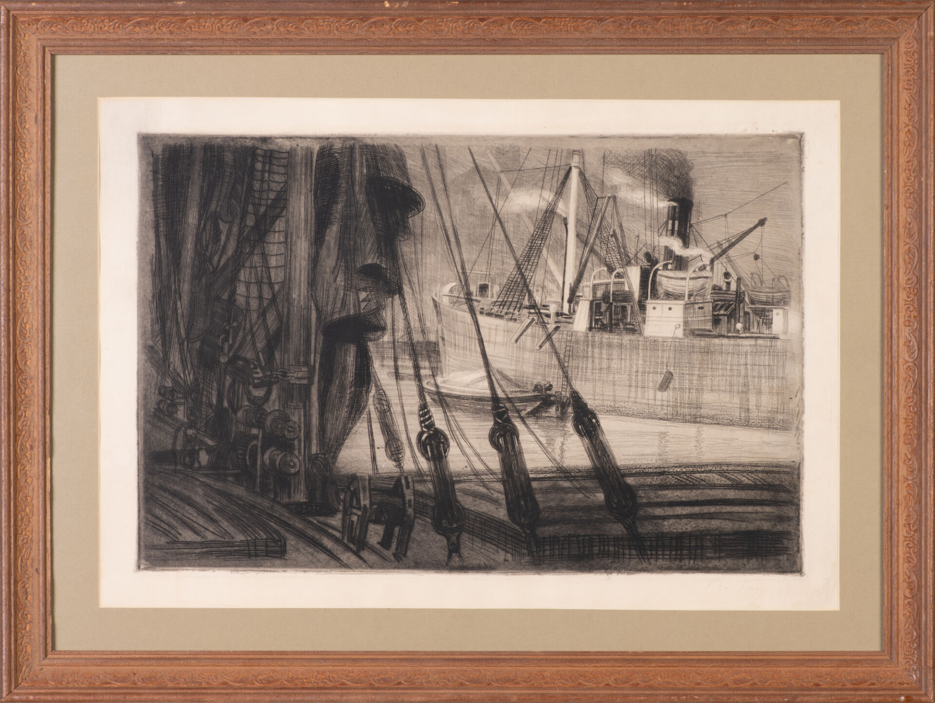 Suite de deux gravures comprenant : - D'après Louis VUILLERMOZ (1925-2016). "Paysage à la baie". Épreuve d'artiste sur papier signée en bas à droite. 48.5 x 63 cm à vue Louis Vuillermoz était un peintre et lithographe français figuratif de l'Ecole de Paris. Il est le fils du lithographe Vuillermoz et l'époux de l'artiste Josette Baun. Dans les années 50, il collabore avec Jean Cocteau, Salvador Dali et Léonor Fini dont il interprète certaines œuvres en lithographie. - École du XXème. "Marine". Gravure sur papier signée en bas à droite "Ph. TROY". 39 x 58 cm à vue