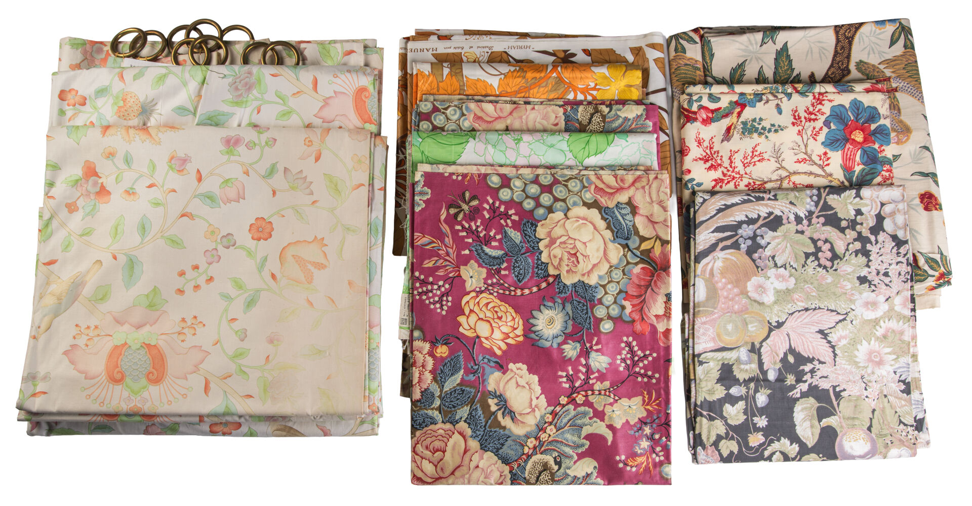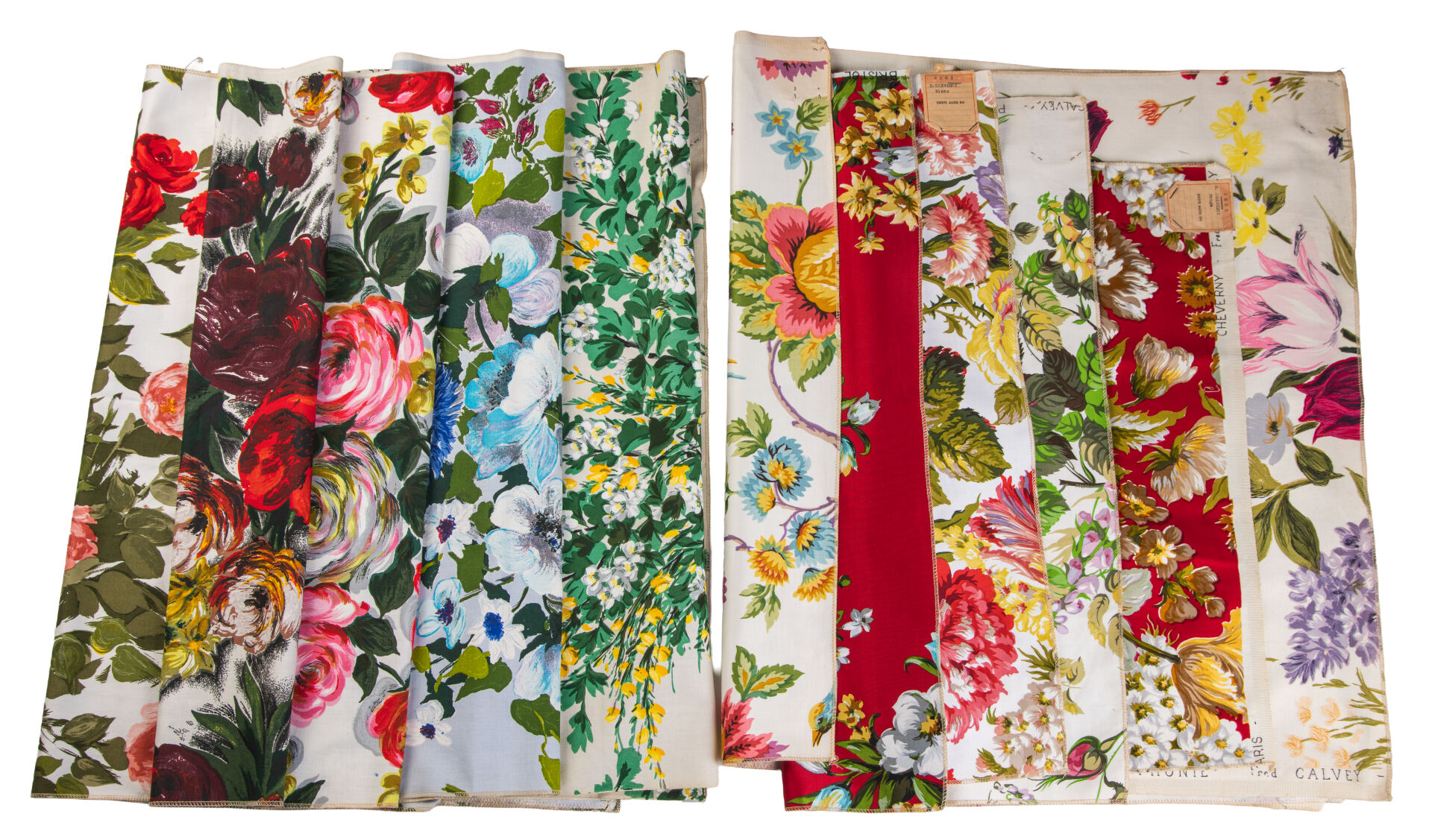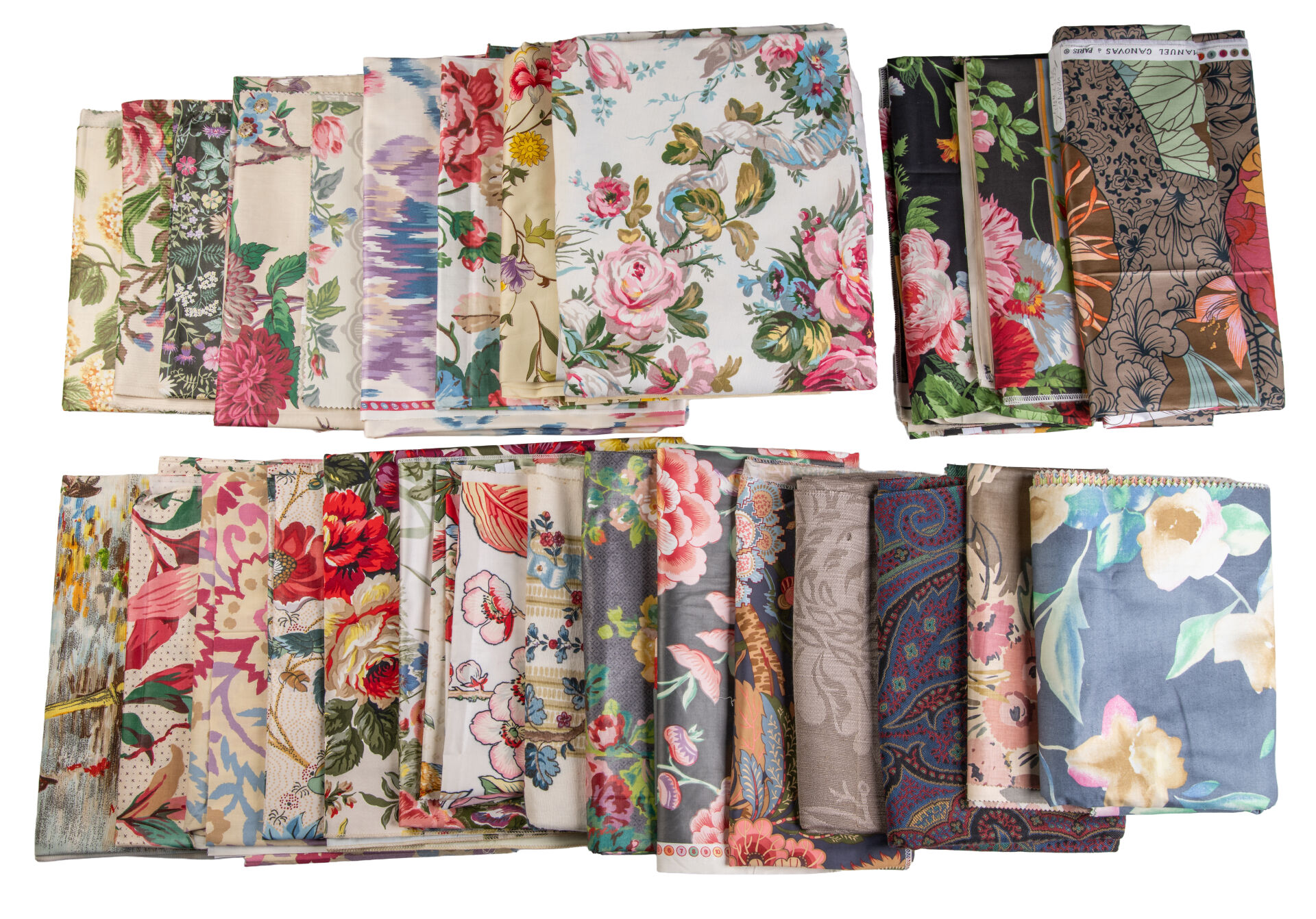 Lot de tissus comprenant : - Carrés fleuris avec impression - Onze coupes FRED CALVEY, 1959 - Coupes tissus ROMANEX BOUSSAC ( 210 x 90 cm ; 140 x 125 cm) - Voilage froissé rose 200 x 280 cm - Voilage vert 210 x 250 cm - Vingt-trois coupes Pierre FREY - Trois DR et une paire de DR CANOVAS - Une paire de DR et deux DR Pierre FREY - Coupes de tissus fleuris multicolores avec fond noir fleuri - Treize coupes CHOTARD - Cinq coupes SANDERSON Tissus d'ameublement pour tapissier décorateur provenant du stock de magasin "Maison Lechevallier - Meubles Tapissier Décorateur à Saint-Lô" qui vendait les éditeurs en tissus français : Pierre FREY, CHOTARD, LELIEVRE, URGE, ROMANEX...