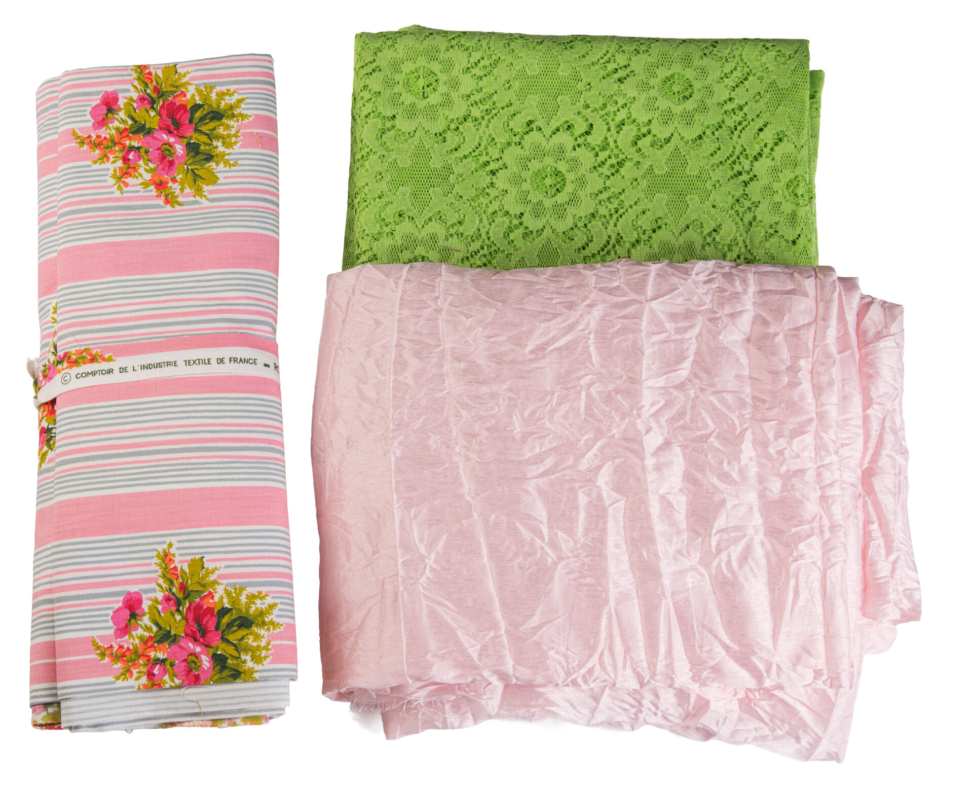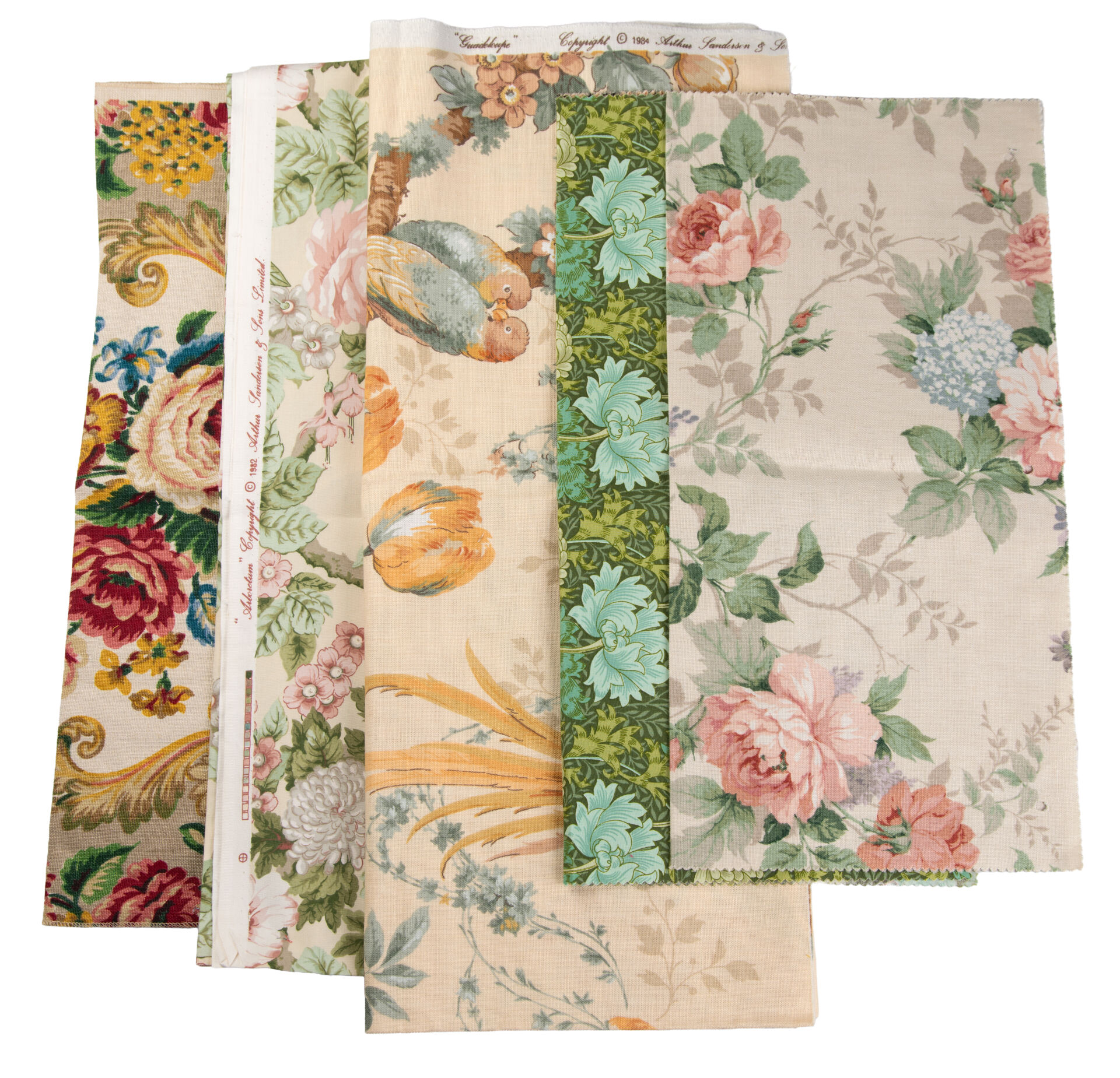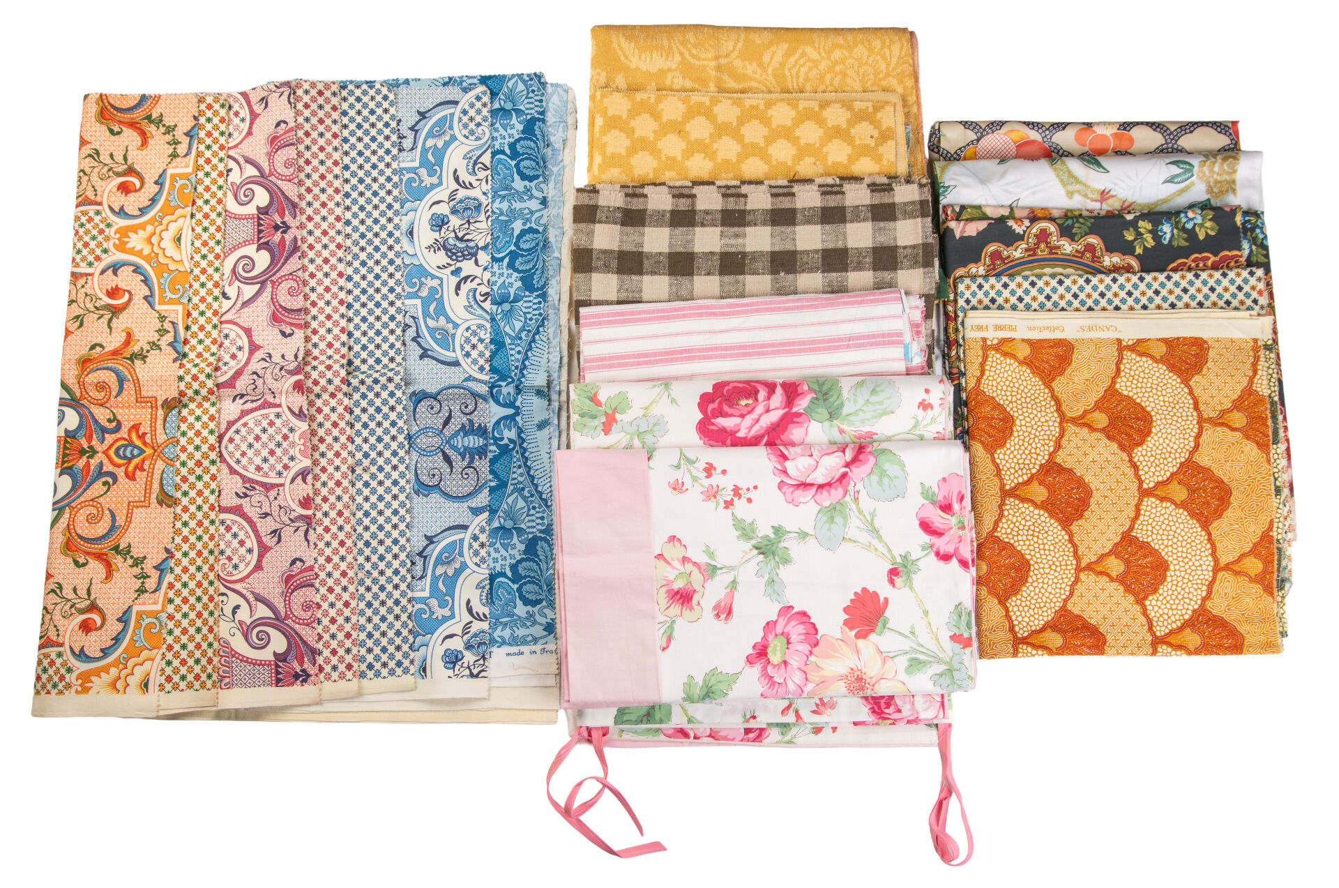 Lot de tissus comprenant : - Carrés fleuris avec impression - Onze coupes FRED CALVEY, 1959 - Coupes tissus ROMANEX BOUSSAC ( 210 x 90 cm ; 140 x 125 cm) - Voilage froissé rose 200 x 280 cm - Voilage vert 210 x 250 cm - Vingt-trois coupes Pierre FREY - Trois DR et une paire de DR CANOVAS - Une paire de DR et deux DR Pierre FREY - Coupes de tissus fleuris multicolores avec fond noir fleuri - Treize coupes CHOTARD - Cinq coupes SANDERSON Tissus d'ameublement pour tapissier décorateur provenant du stock de magasin "Maison Lechevallier - Meubles Tapissier Décorateur à Saint-Lô" qui vendait les éditeurs en tissus français : Pierre FREY, CHOTARD, LELIEVRE, URGE, ROMANEX...